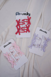 Four mini metal snap clips wrapped up in ribbon, topped with a bow. Perfect for all hair types and textures.