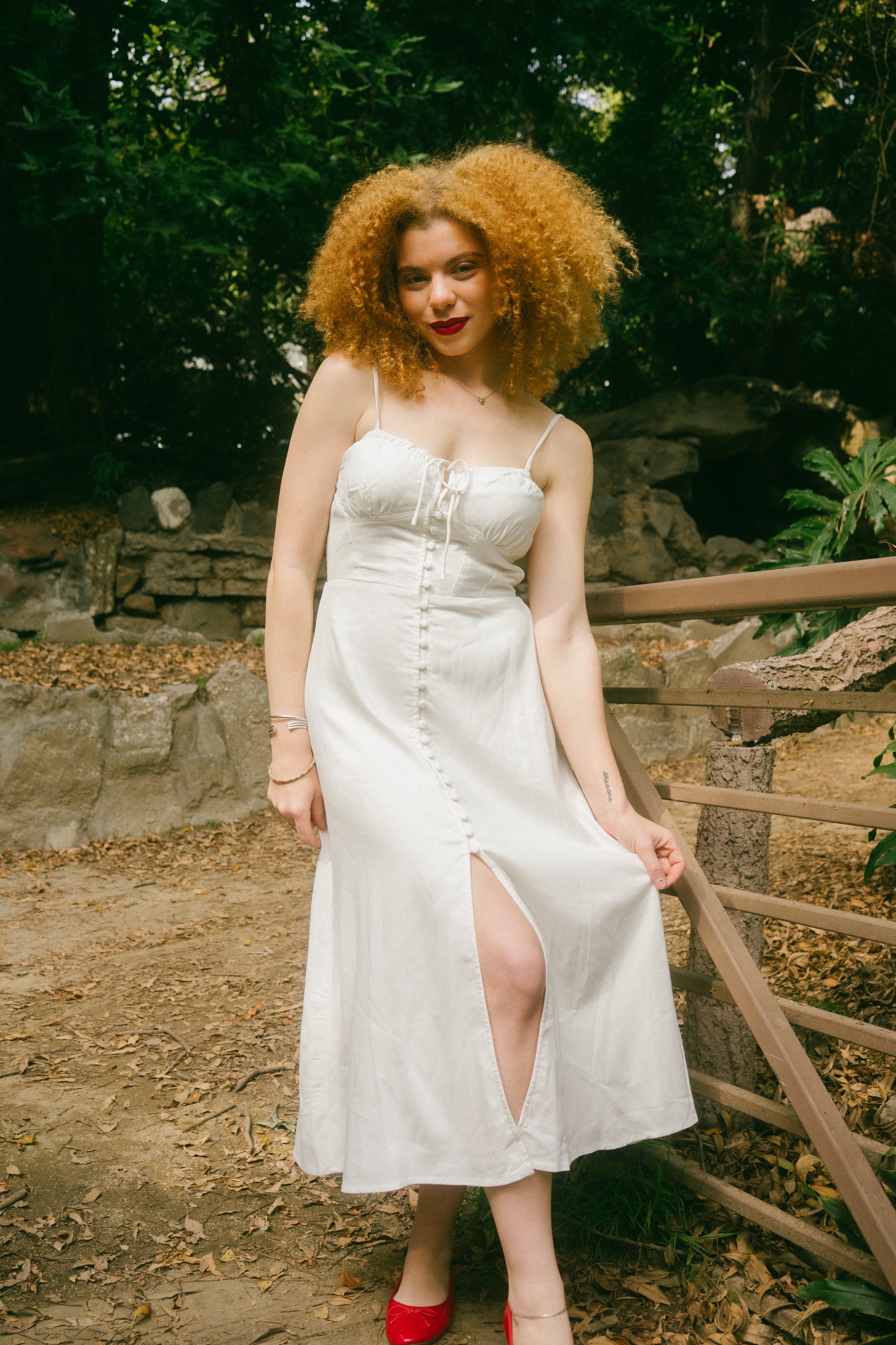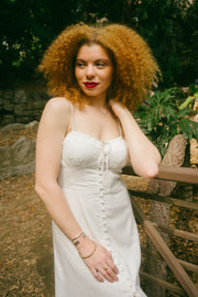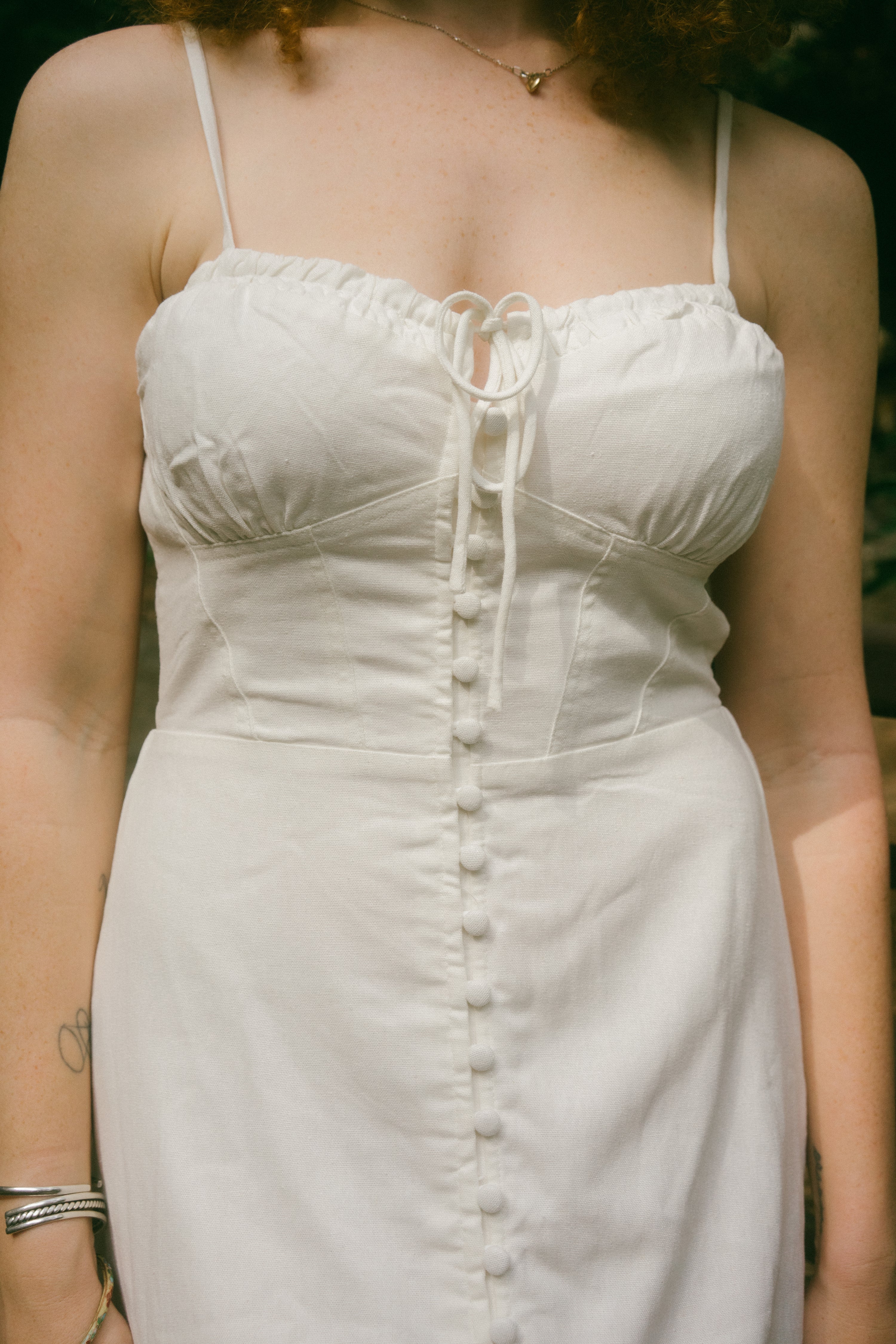 Timeless and gorgeous, the Clair Dress comes in a solid off-white hue and is decorated in functional fabricated buttons down the center of the bodice. This midi sundress has a square neckline, empire waistline and ties together with an oversized bow in the center of the neckline. It has vertical panneling details along the waistline and a romantic a-line style silhouette. Finished off with a smocked backside and timeless easy to wear silhouette, style with a dash of lipstick, spring slides and an oversized tote bag.