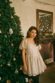 The holiday dress of your dreams, the Clarice Dress comes in a golden sparkly hue with embroidered ornate flowers and short puff sleeves. This babydoll mini dress has a romantic vintage inspired basque waistline with a pretty scoop detail along the neckline and a fully lined, mini length skirt. Style this holiday beauty with tights, a dash of red lipstick and holiday kitten heels for the perfect festive party attire.