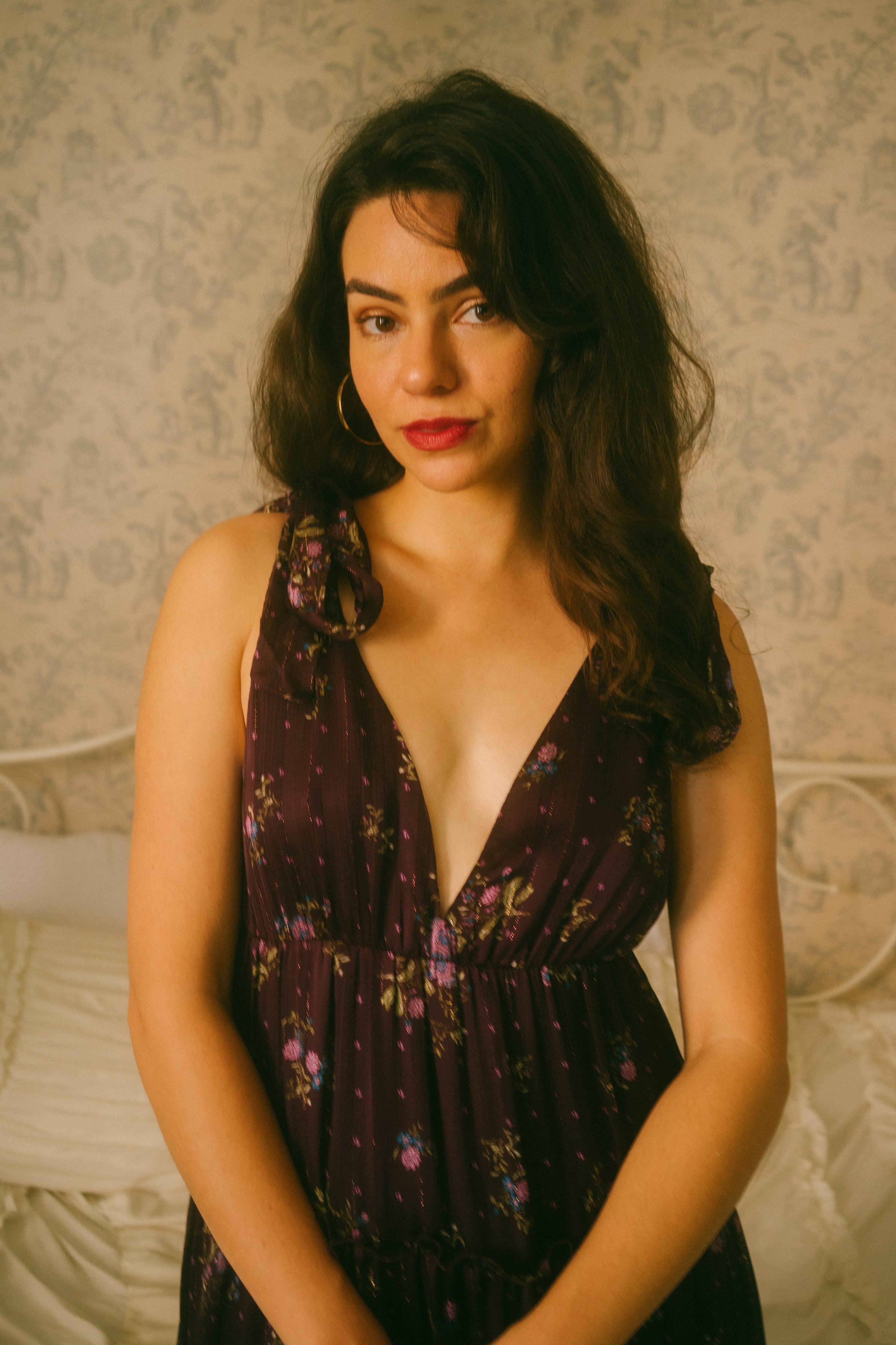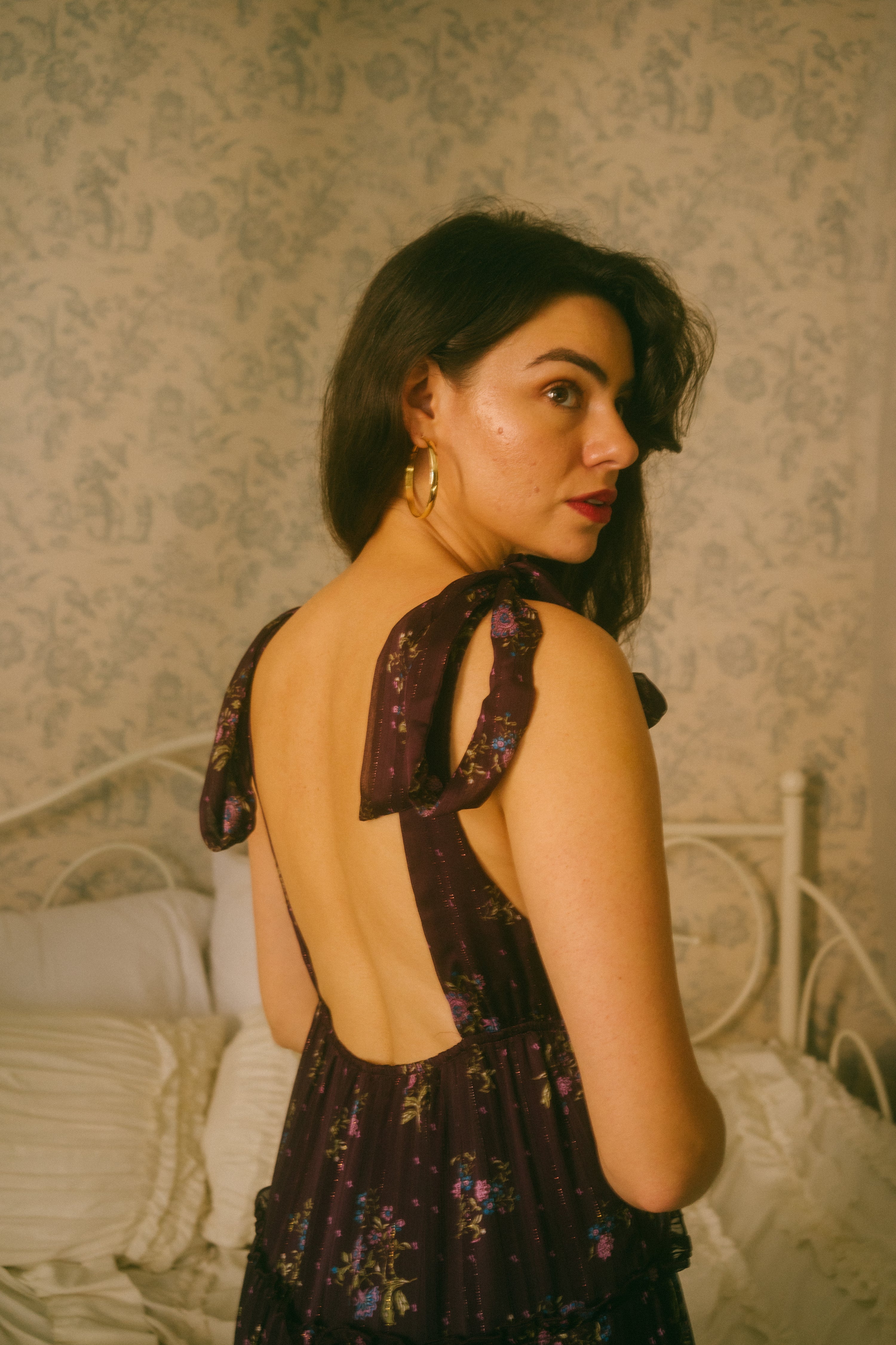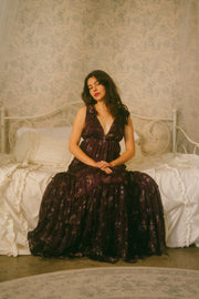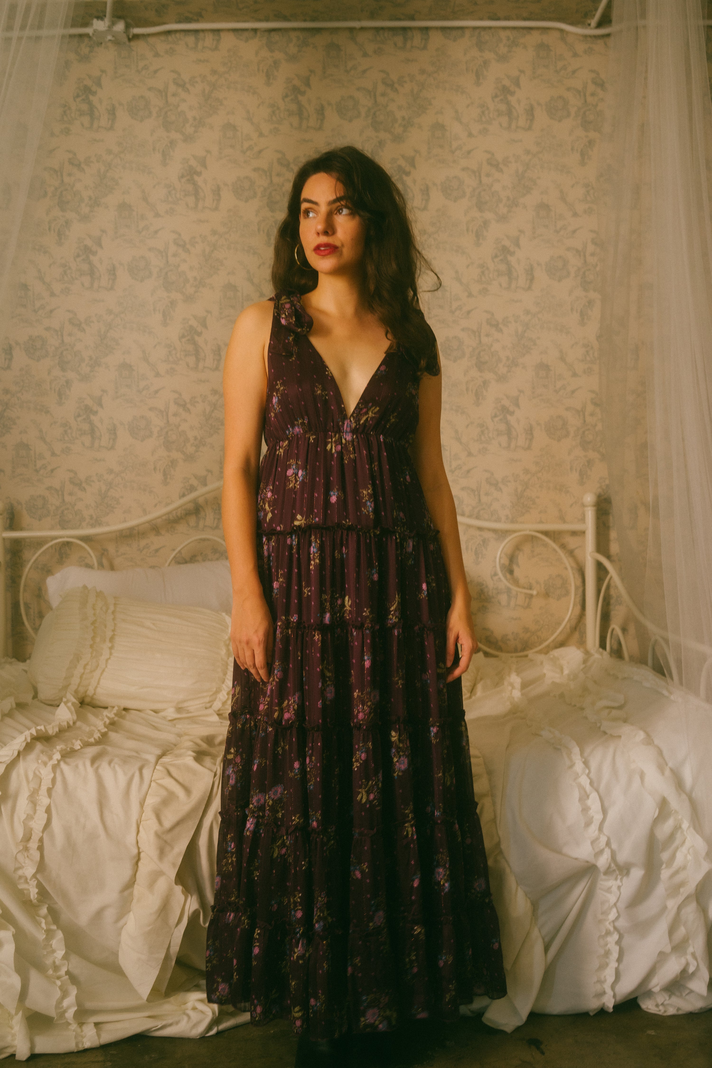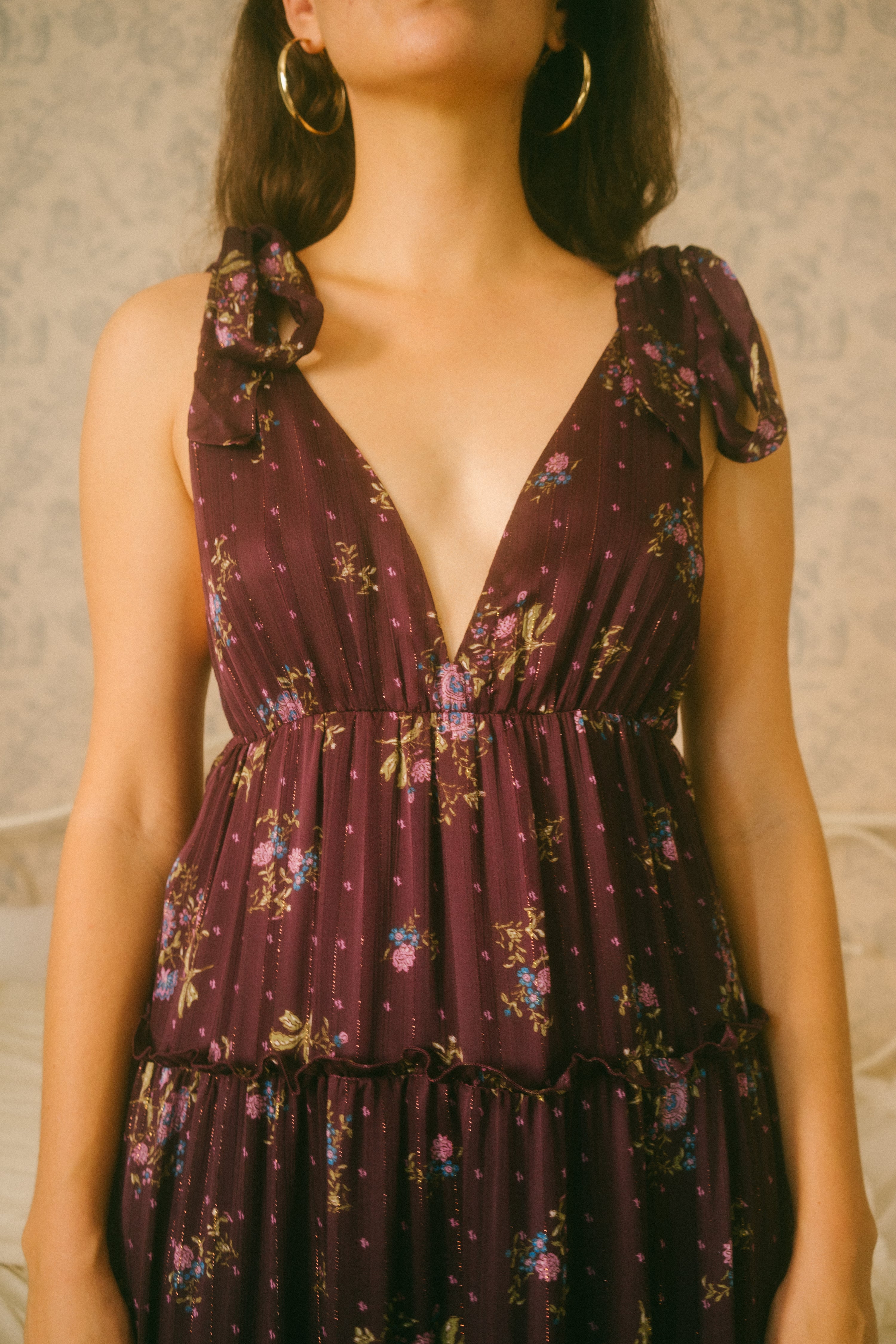 A stunning romantic piece, the Devon Dress comes in a vibrant dark purple hue with a v-neckline and empire waistline. This feminine beauty is scattered in a green, pink and blue ditsy floral print with subtle metallic vertical threading throughout, giving it that extra holiday look. This midi sundress has adjustable straps that tie together with an oversized bow on each shoulder and a tiered midi / maxi length skirt with ruffle detailing along the rows. The piece is fully lined, with a romantic open low back. Style with mini kitten heels, a dash of lipstick and a mini basket bag for that gorgeous holiday party look.