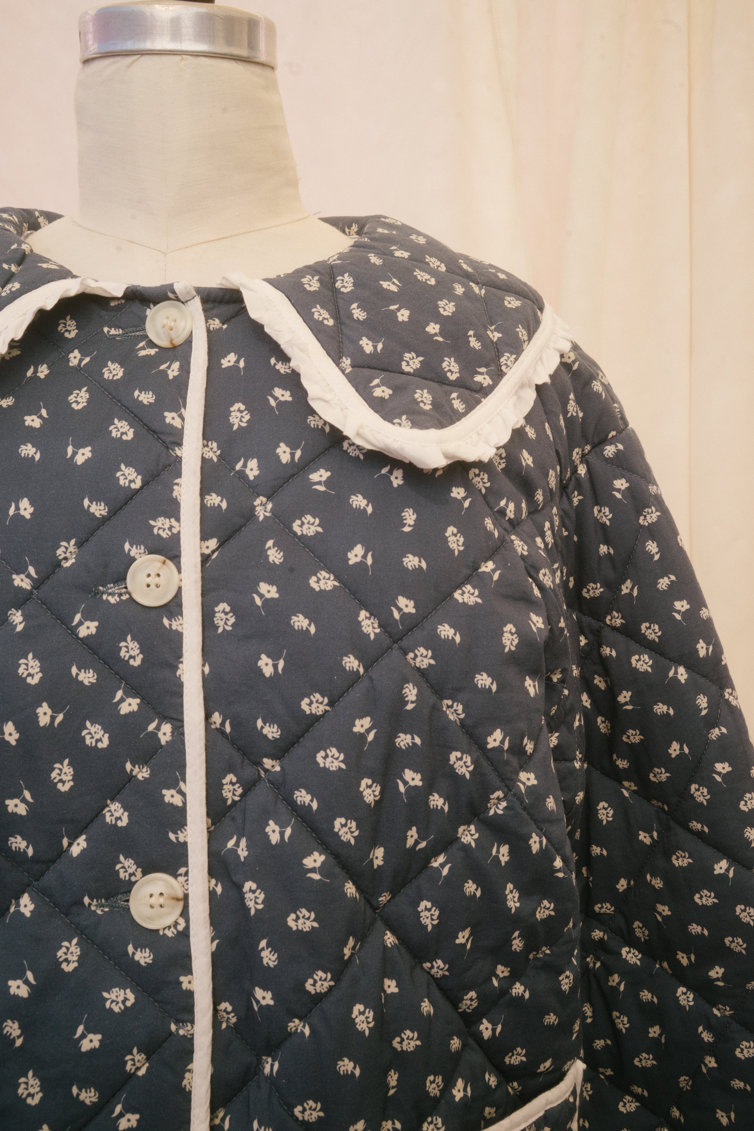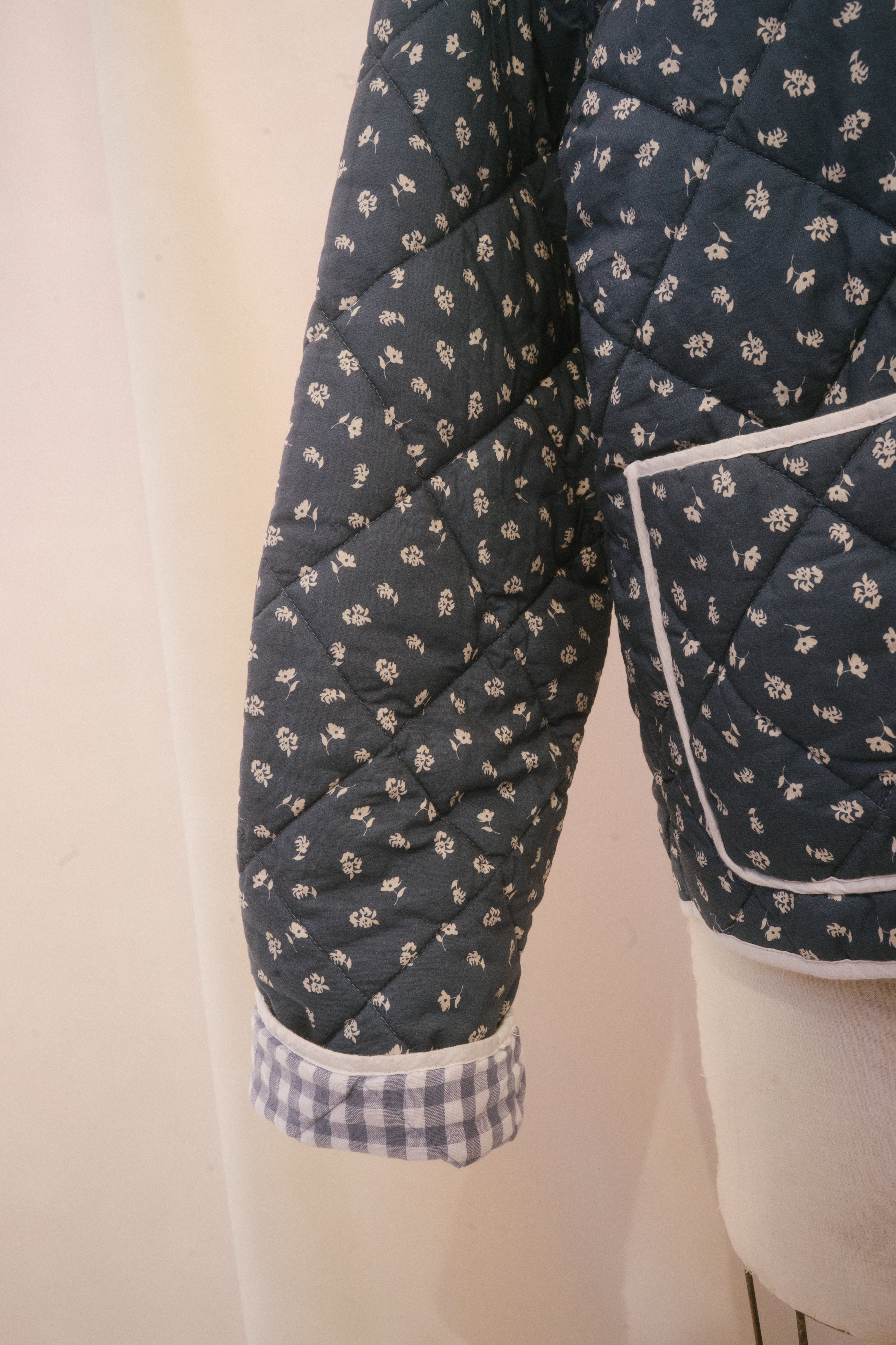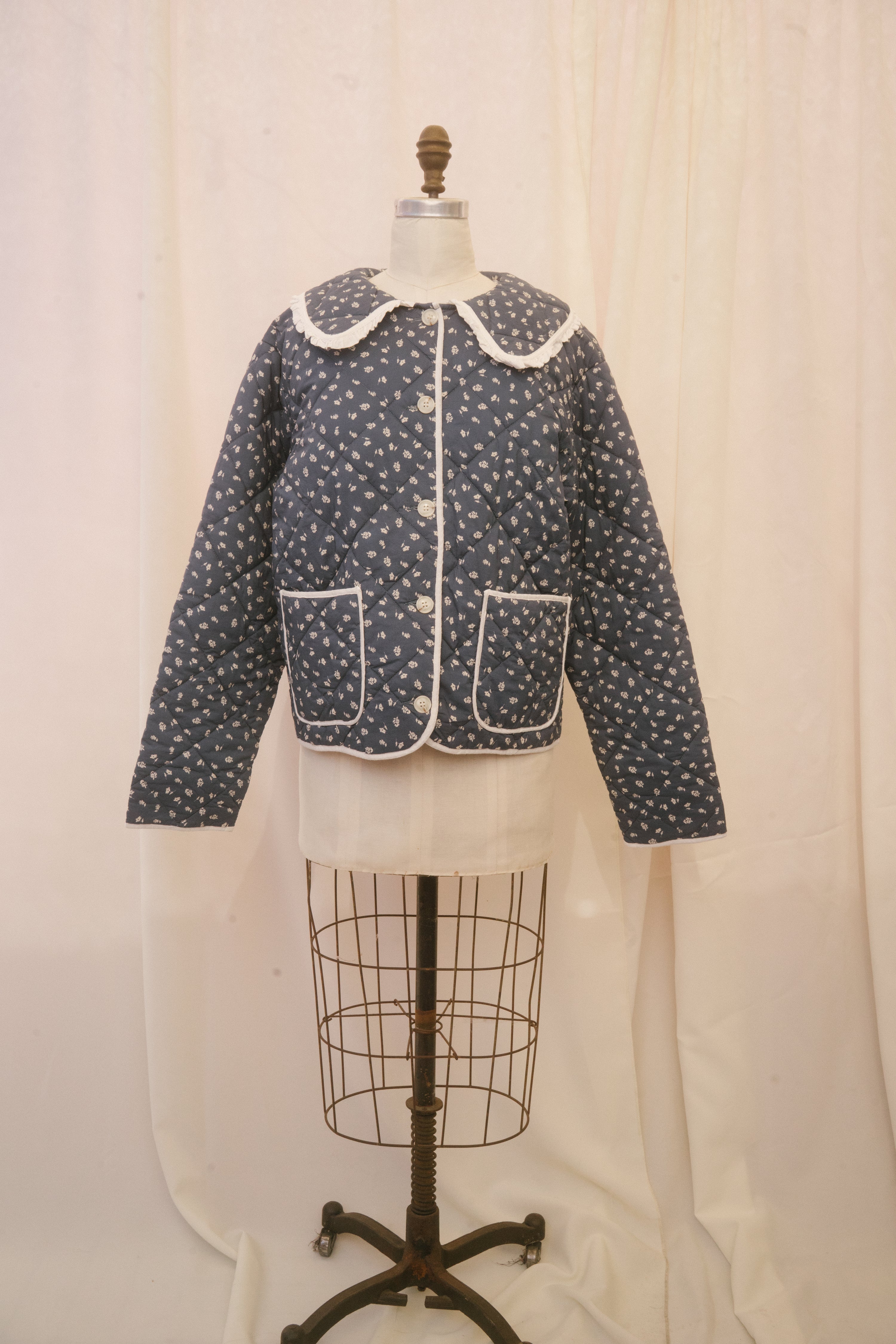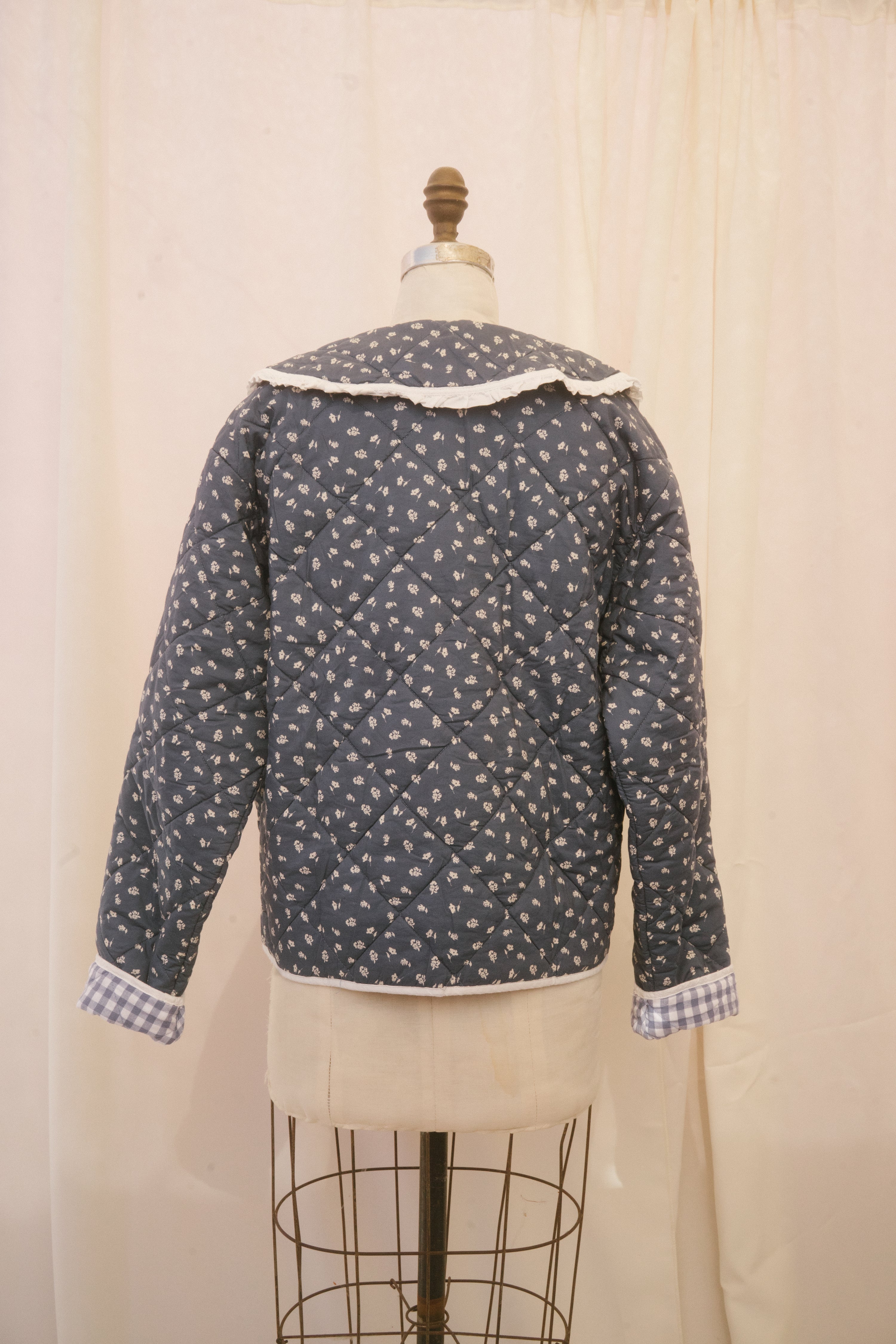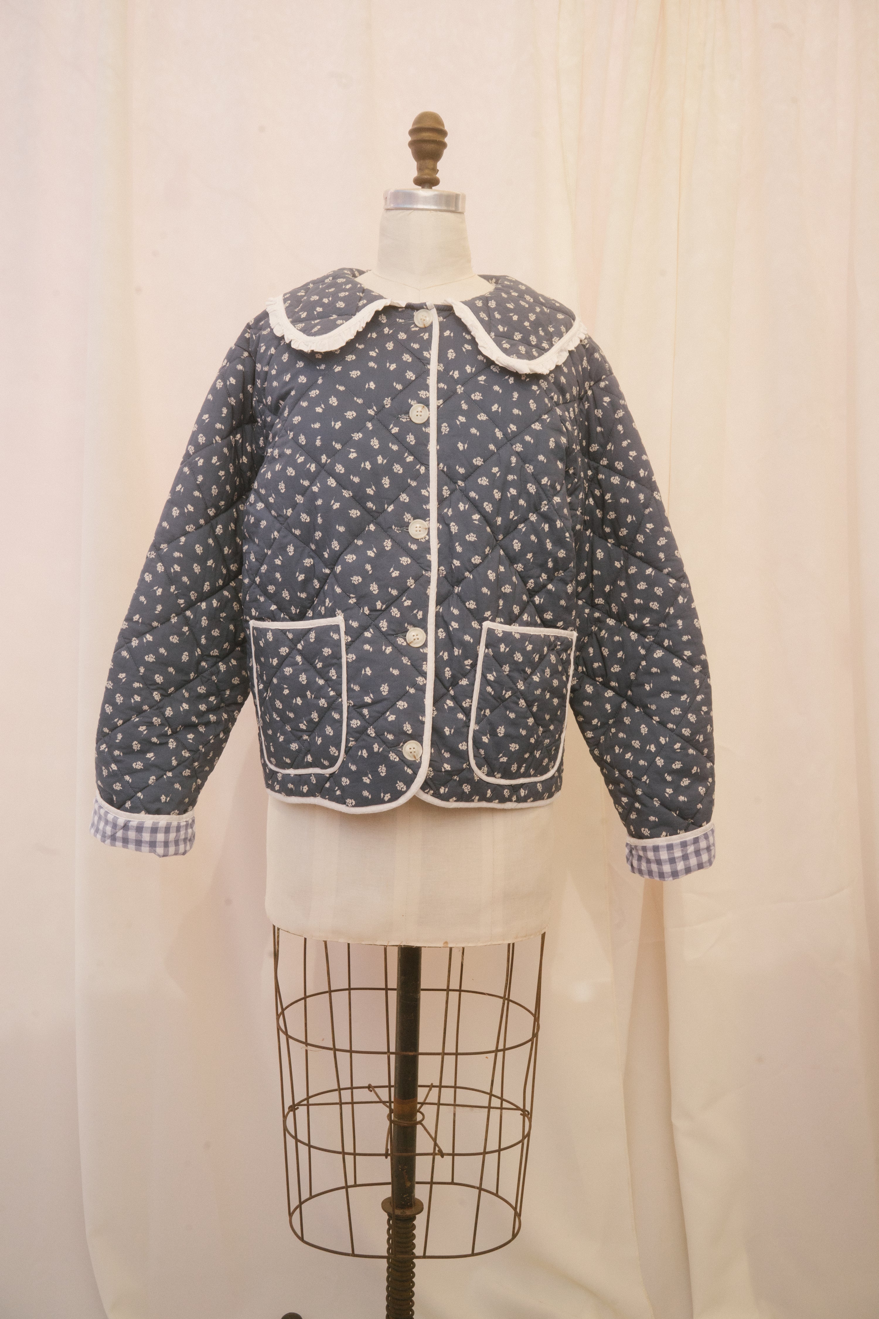 Is it just us, or is there a fall chill in the air? Stay cozy in the Effie jacket! This beautiful quilted chore coat is fully reversible (just remove the care tag)! The outer fabric is a beautiful cream corduroy. Both the peter pan collar and the two front pockets feature stunning wild strawberry embroidery in vibrant red, green, and yellow thread. The pockets are finished with a little ruffle that matches the ruffle of the collar. Three ties allow you to fasten the jacket when it is reversed, too. Reverse the jacket to discover a charming red and white gingham option!