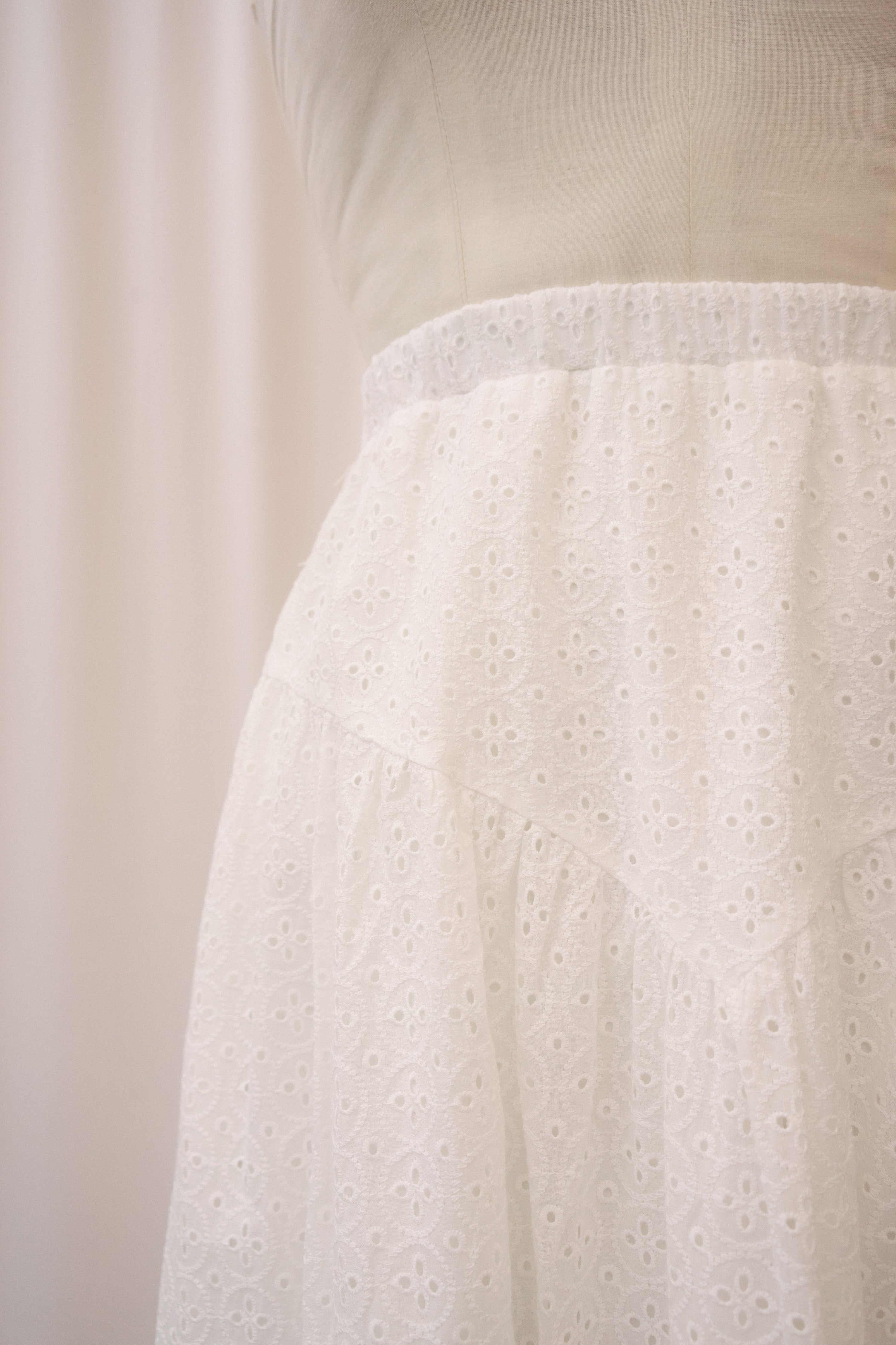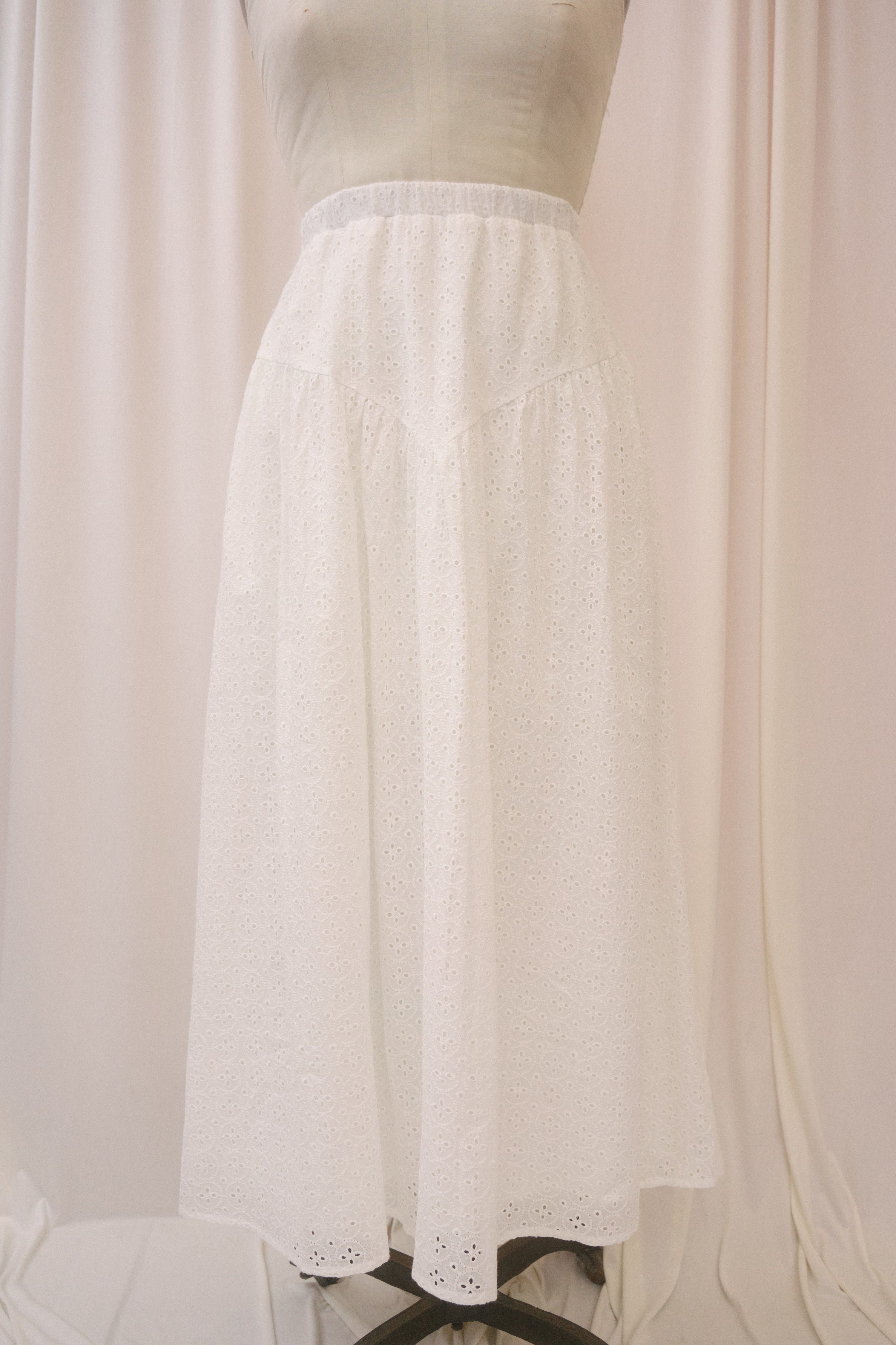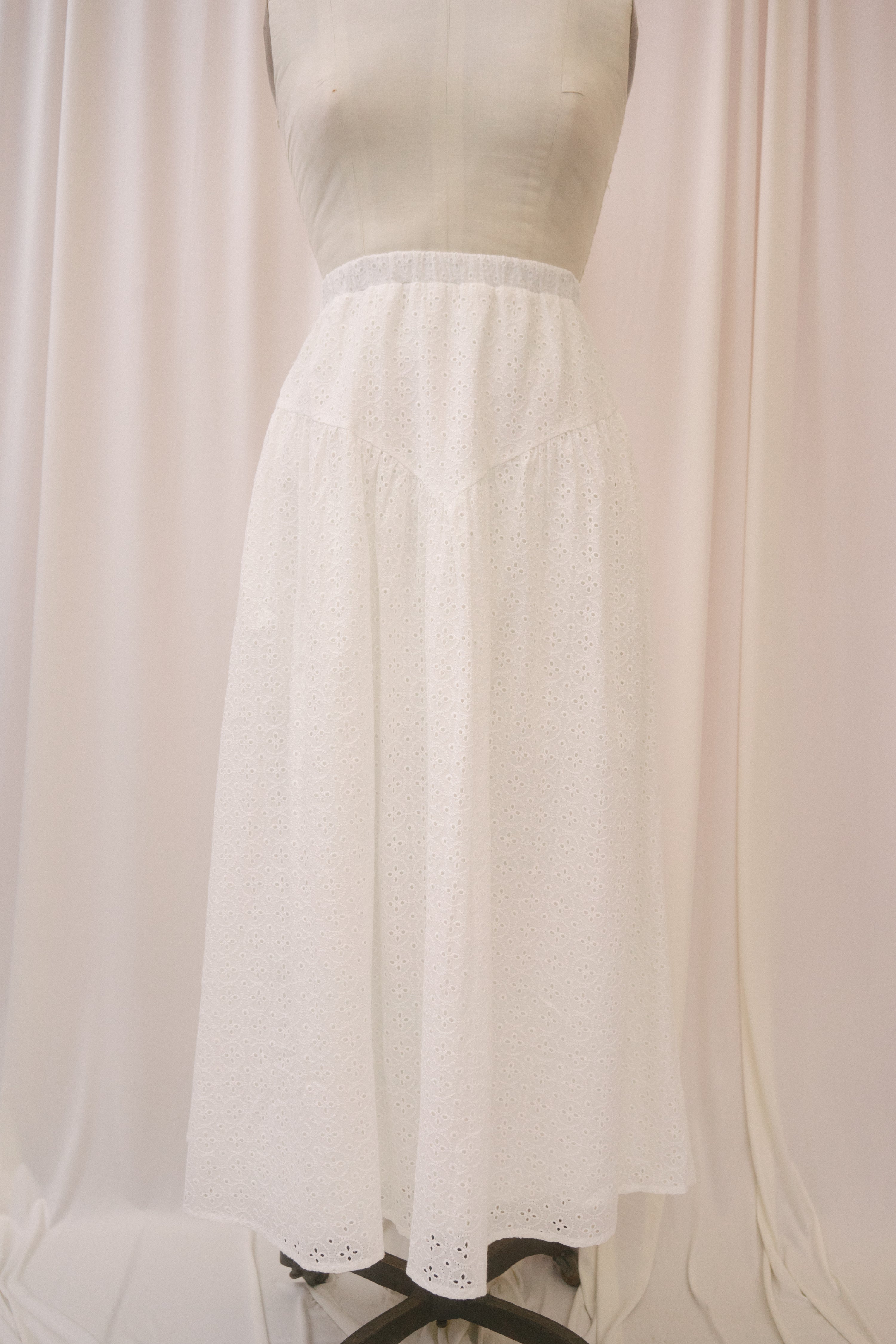 Timeless and classic, the Elinor Skirt is a netrual girlies dream come true. In a solid off-white hue, this midi skirt has a raised waistline with a fit and flare silhouette. It has an elasticated waistband that flows out into a romantic a-line midi length skirt. The piece is covered in a feminine eyelet design and is fully lined with a romantic basque waistline in the front and the back. Style with just about anything, this skirt will be a go-to beauty for all of your everyday wears.