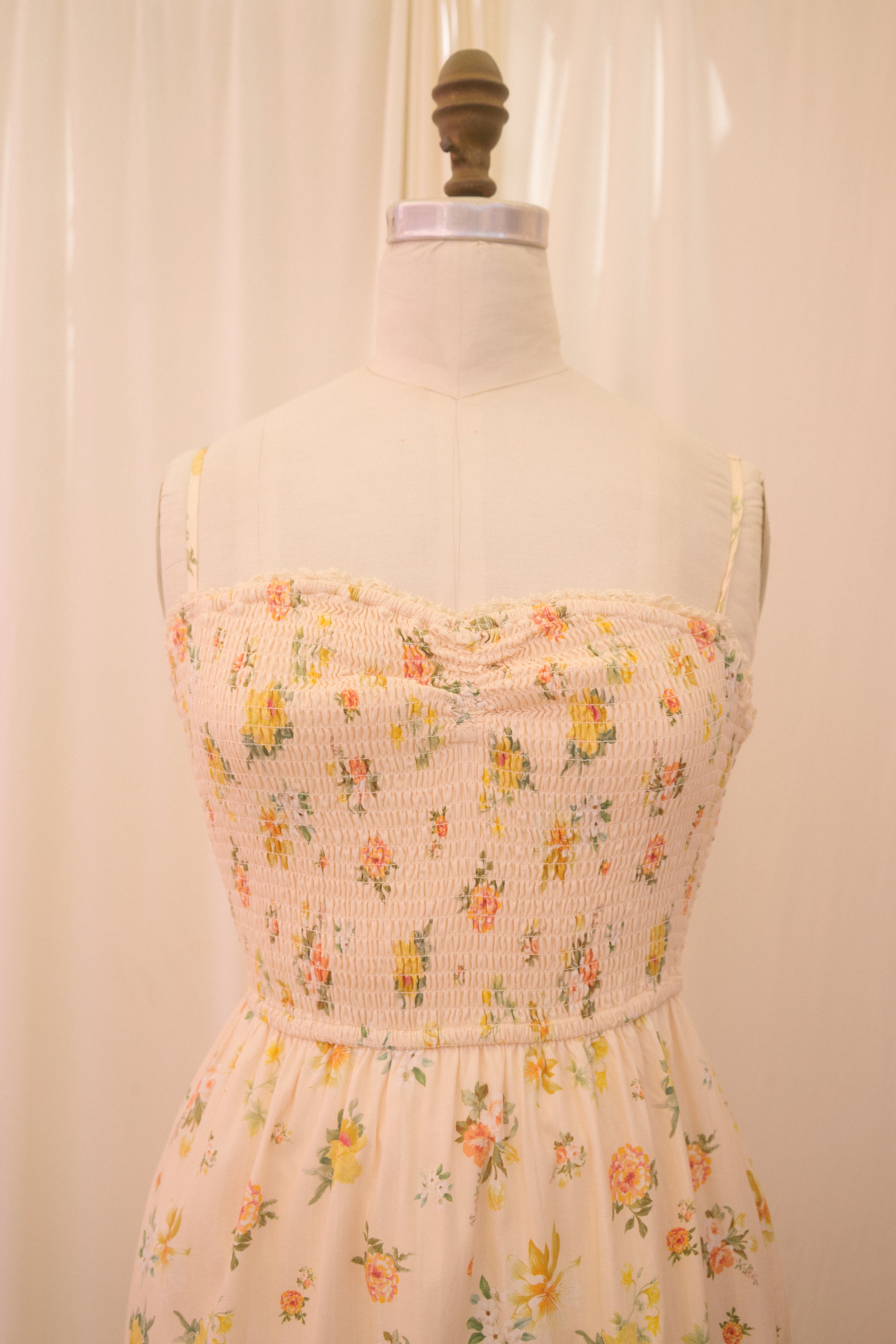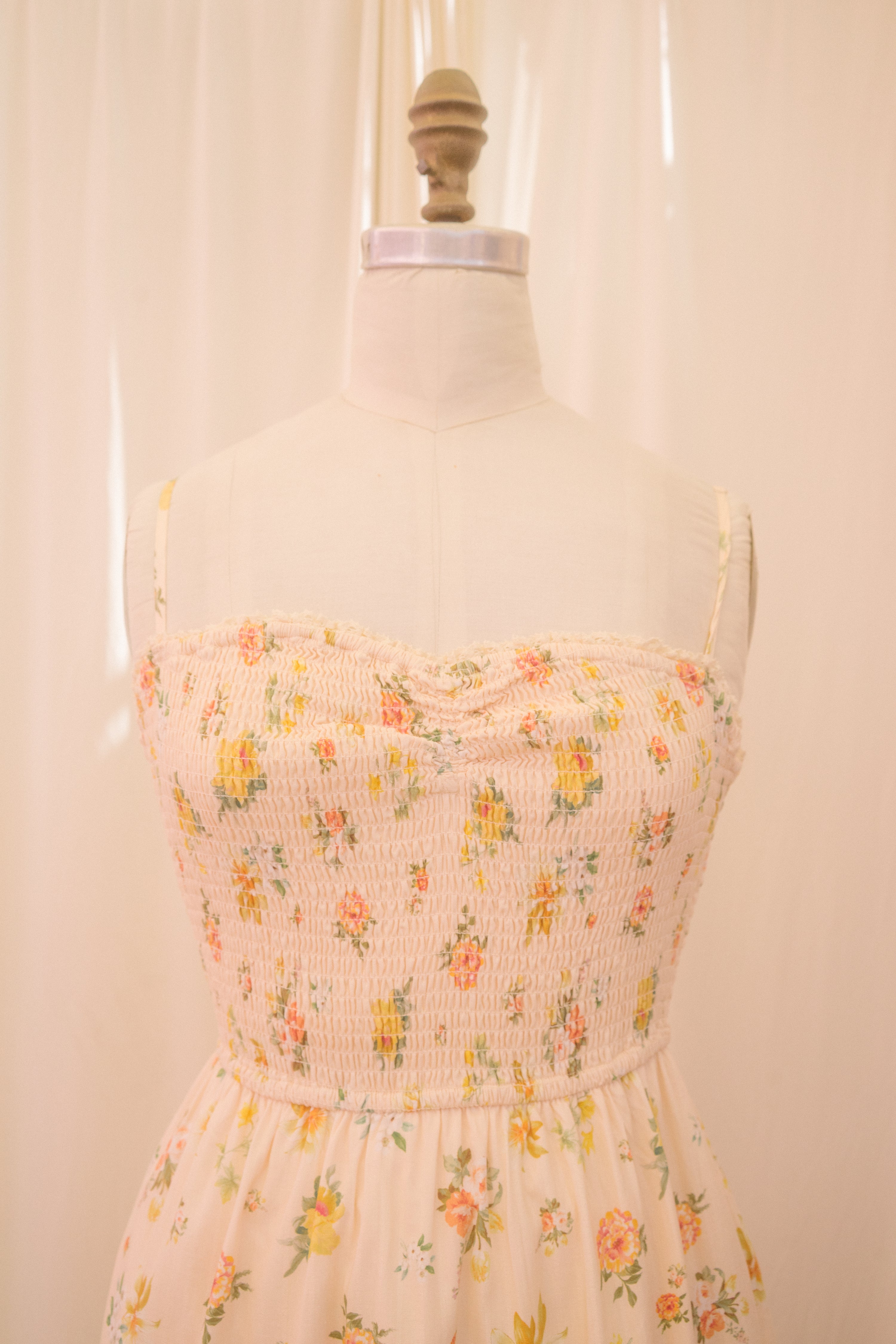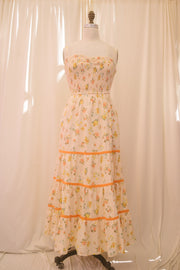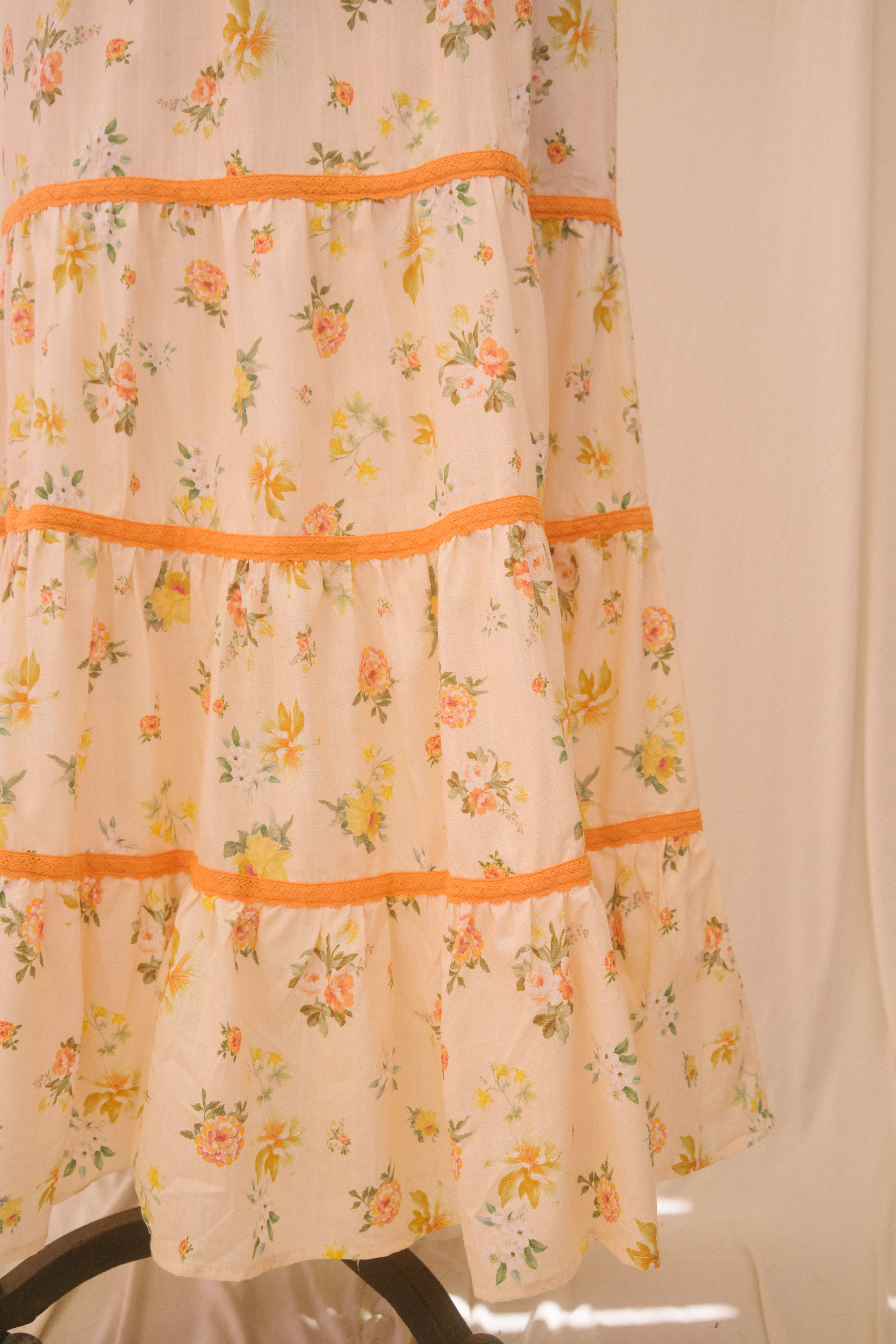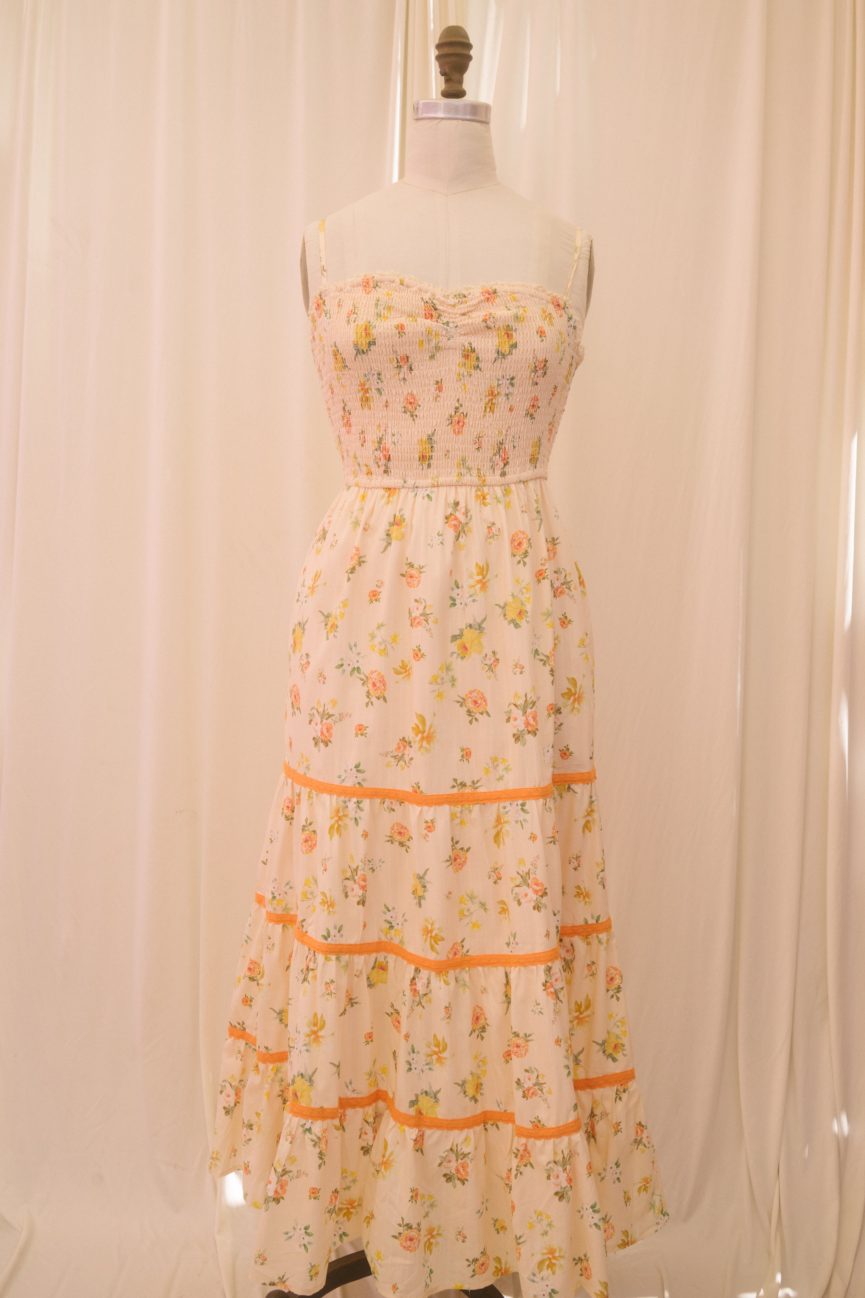 Like a tropical sunset, the Faelina Dress comes in a dreamy cream hue and is scattered in a dreamy muted orange, sunset yellow and green oversized rosy print. This midi sundress has a raised waistline with a fully smocked front and back, making it more comfortable and easier to fit a variety of different shapes and sizes. The piece has cream lace trimming along the neckline with adjustable straps and a petite cinched detail in the center of the neckline. It has a pretty romantic ruffled tiered skirt that has orange vertical lines separating the tiers. Style with an oversized sunhat, a dash of blush and your go-to beach slides.