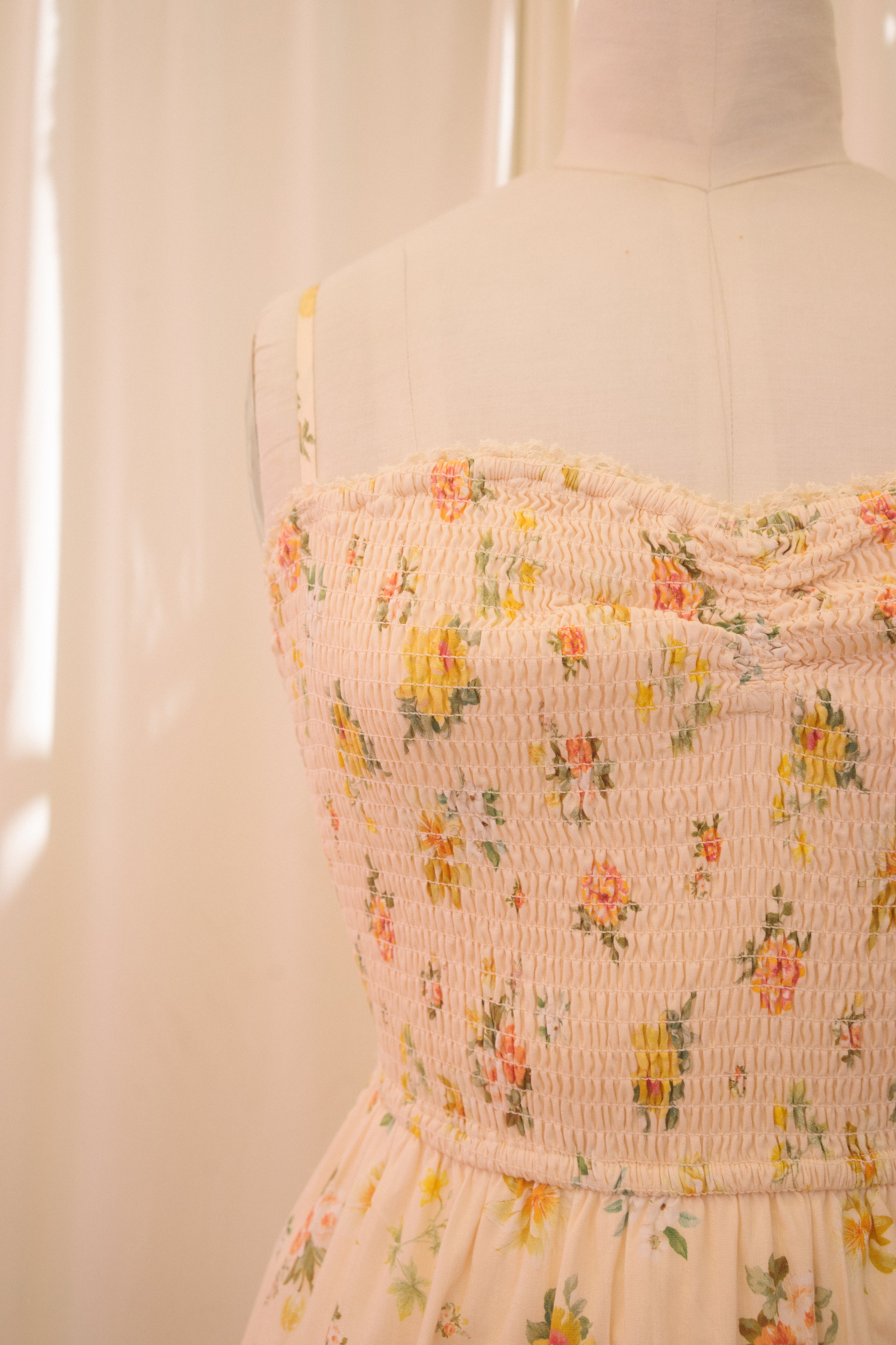- s: 50.5" length (adjustable with straps) / 14.25" bodice (adjustable with straps) / fits between a 32"-40" bust (stretches with smocking) / fits between a 26"-34" waist (stretches with smocking) / fits up to a 42" hip