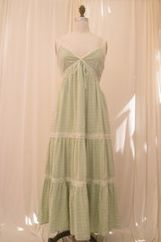 Admire the evening fireflies in the Freydis dress. This sage v-neck sundress is flecked with teensy weensy white stars. The empire waist and tiered skirt are decorated with white lace that is threaded through with pistachio green functional ribbon that ties in a bow at the bust. Adjustable spaghetti straps and a smocked back keep you cool while you're sipping on iced tea.