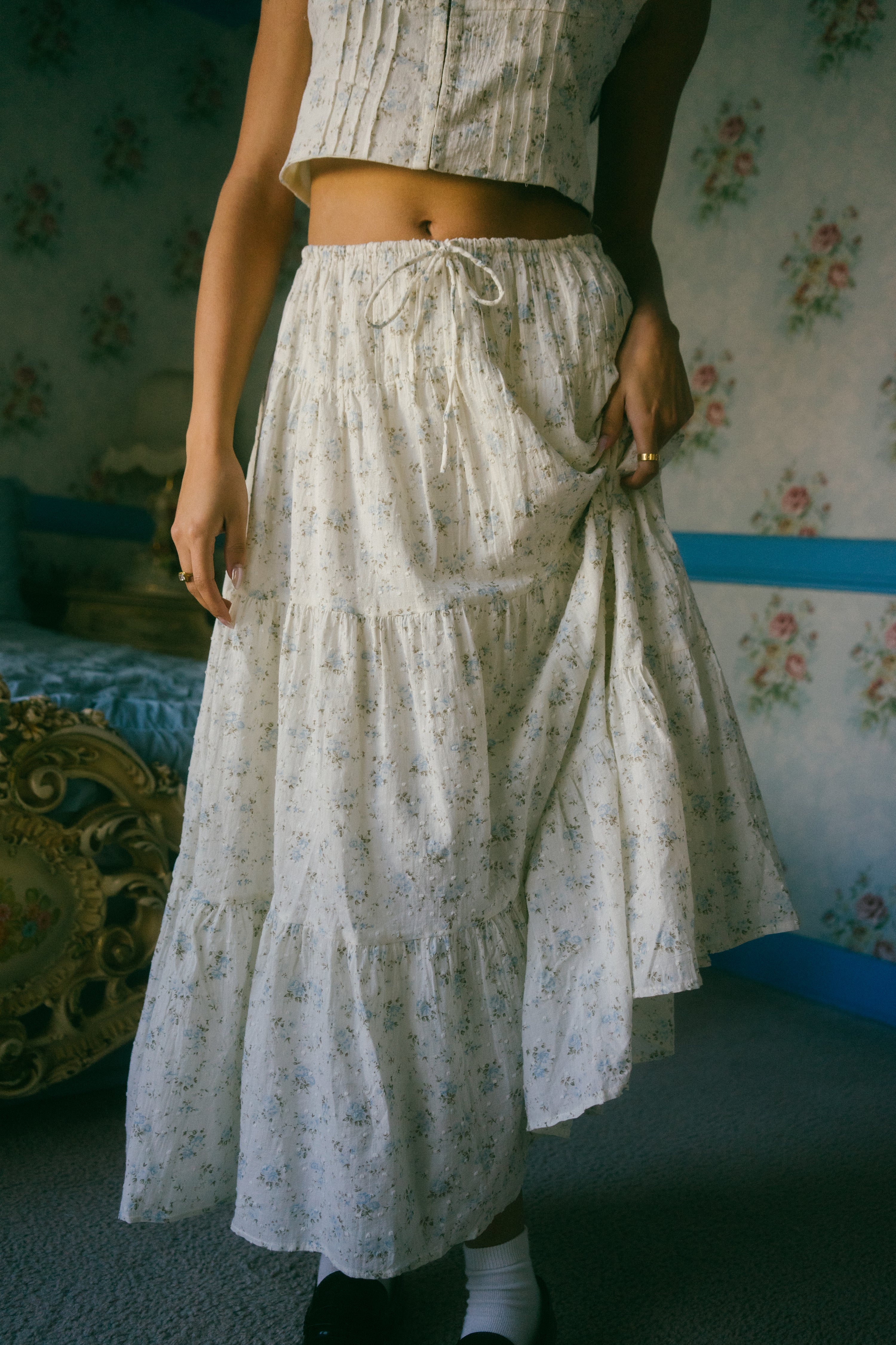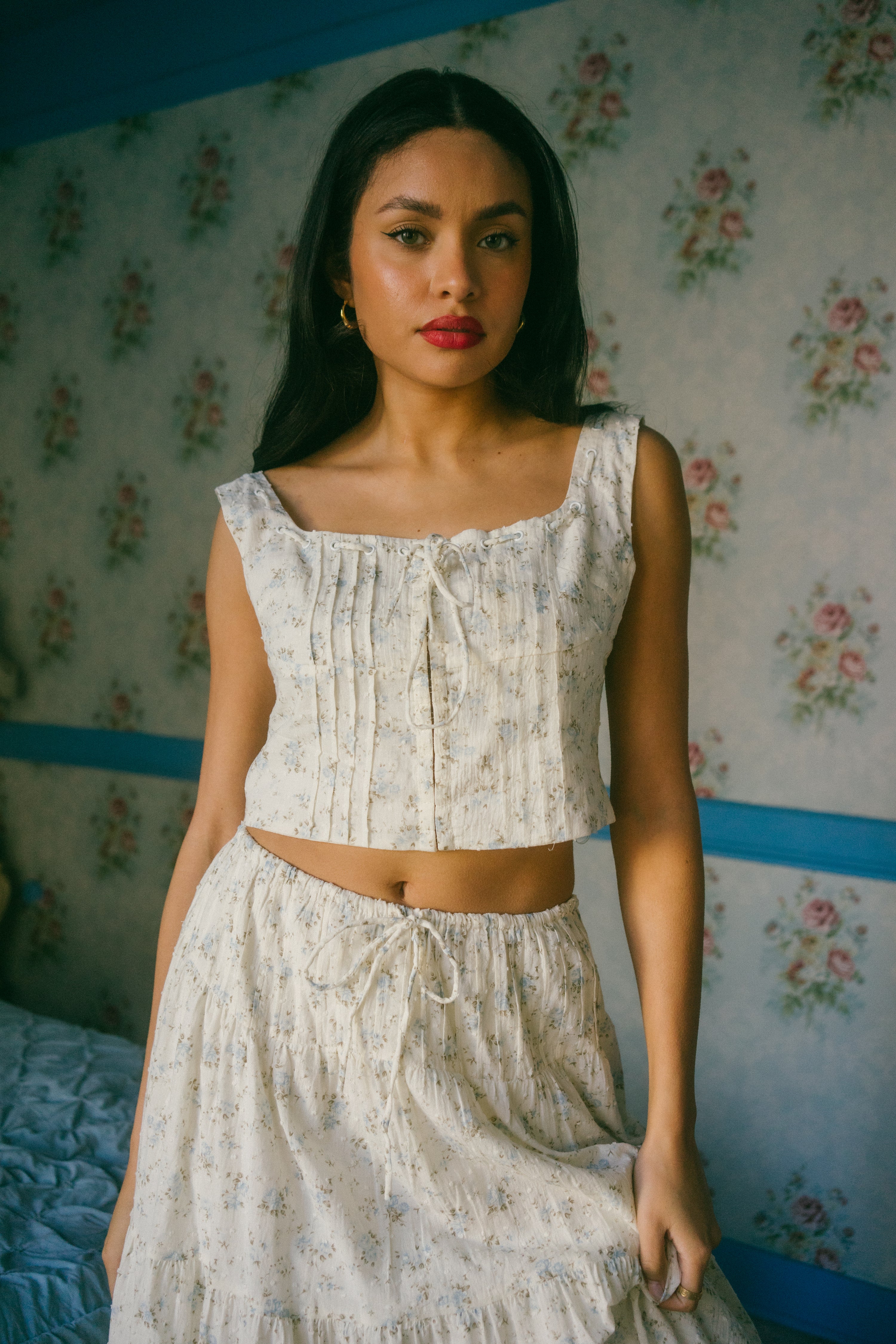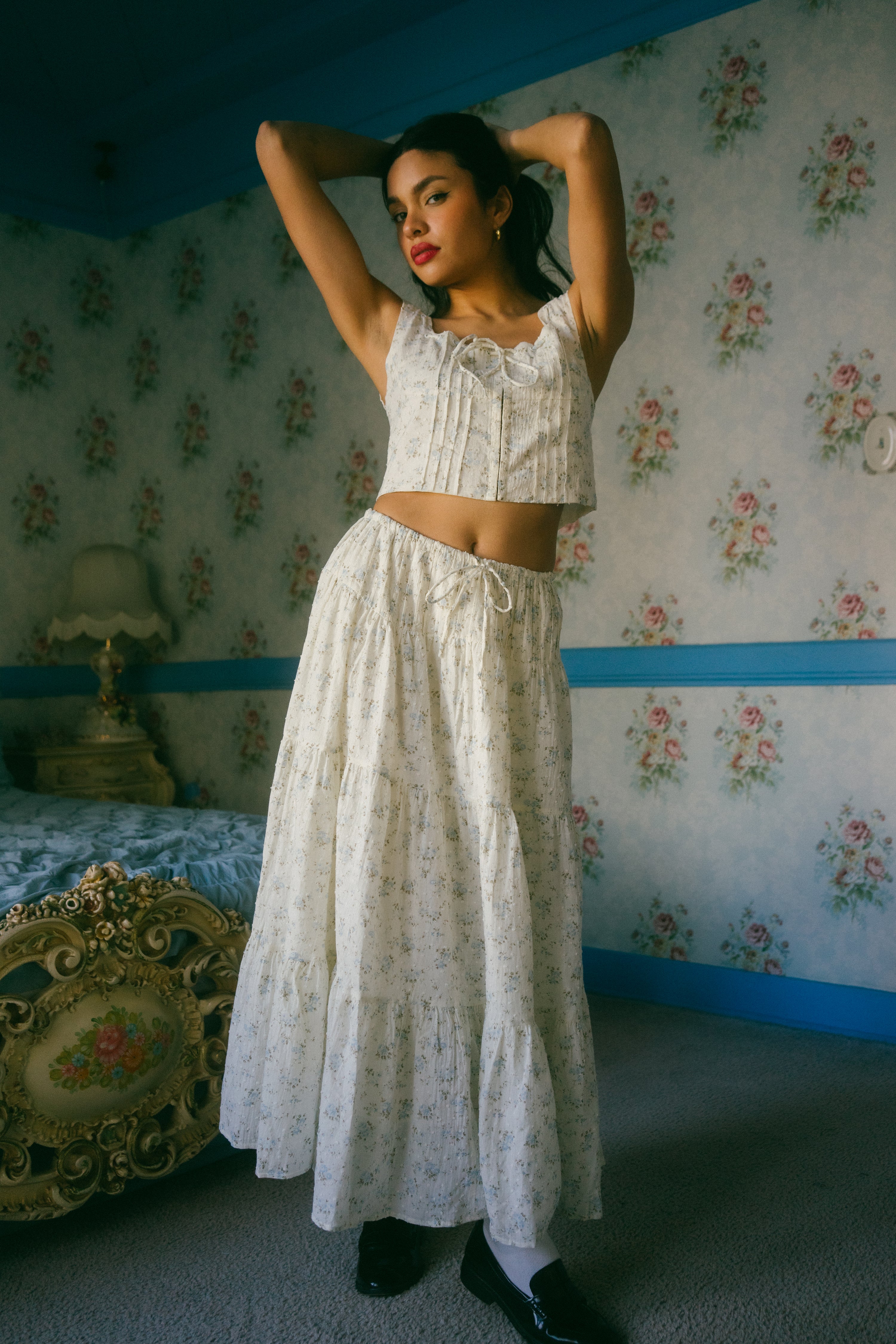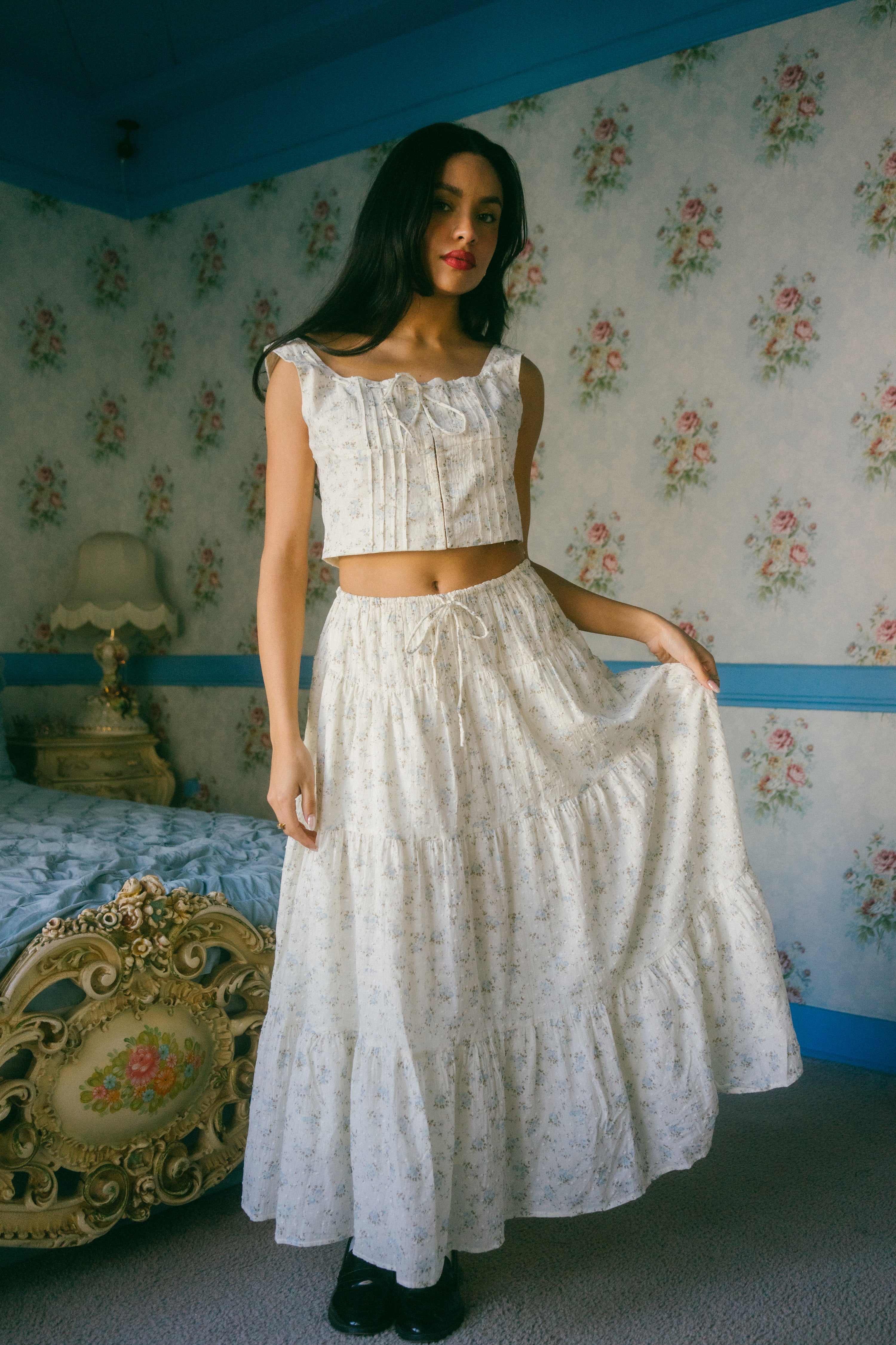 An Astrior favorite, the Hailey Set comes in a cream hue and is scattered in a soft muted blue and light green ditsy floral print. The piece comes with a semi cropped blouse with a square neckline, thick straps for sleeves and an oversized bow in the center of the neckline that weaves in and out of the top of the design. It has vertical pleated detailing along the bodice with functional clasps down the center of the blouse. The skirt is decorated with fabric gathering details along the waistband and tiers, creating an extra flowly, vintage inspired look. Finished off with an adjustable waist tie that ties together in an oversized bow, style with your go-to slides, an oversized tote and a messy updo for a romantic early spring day look.