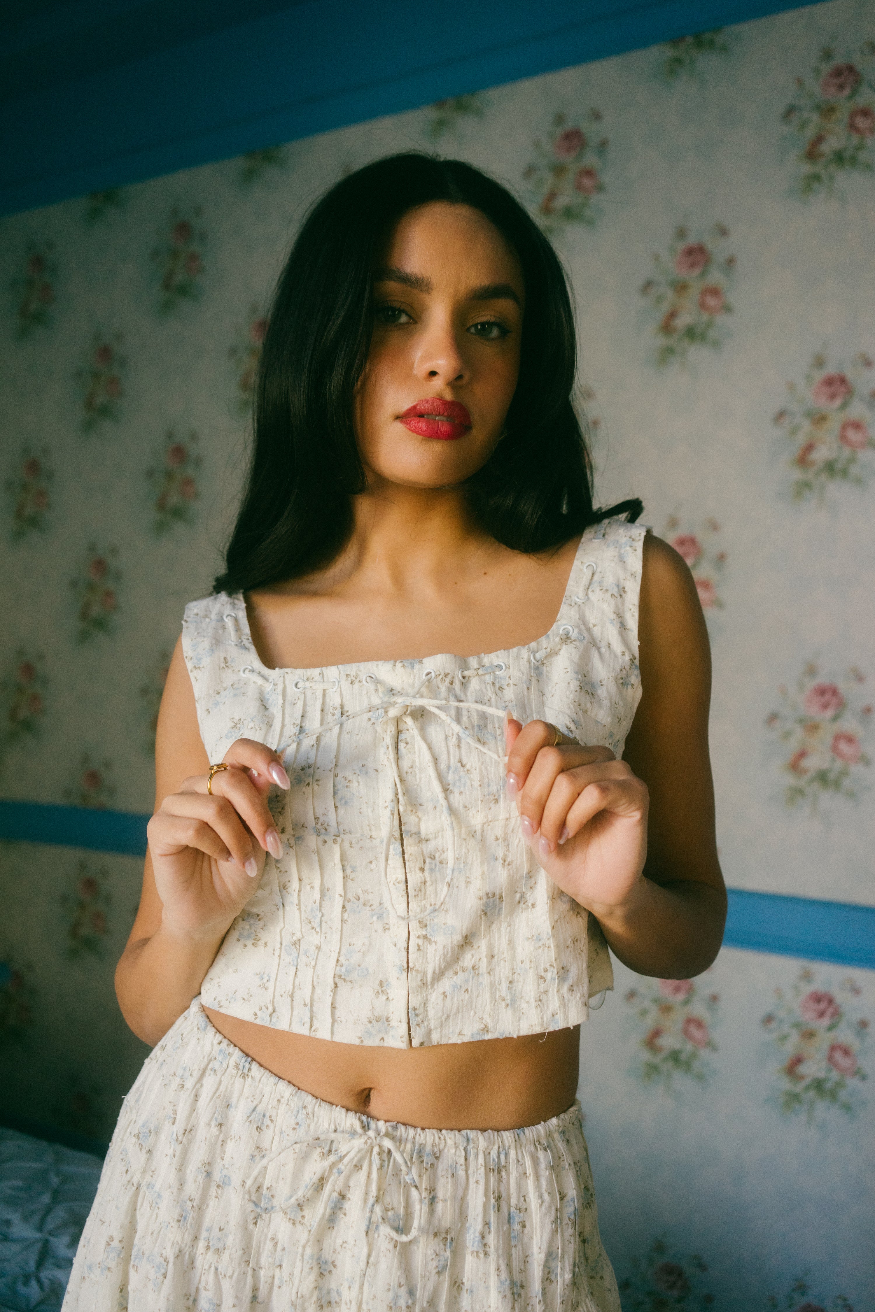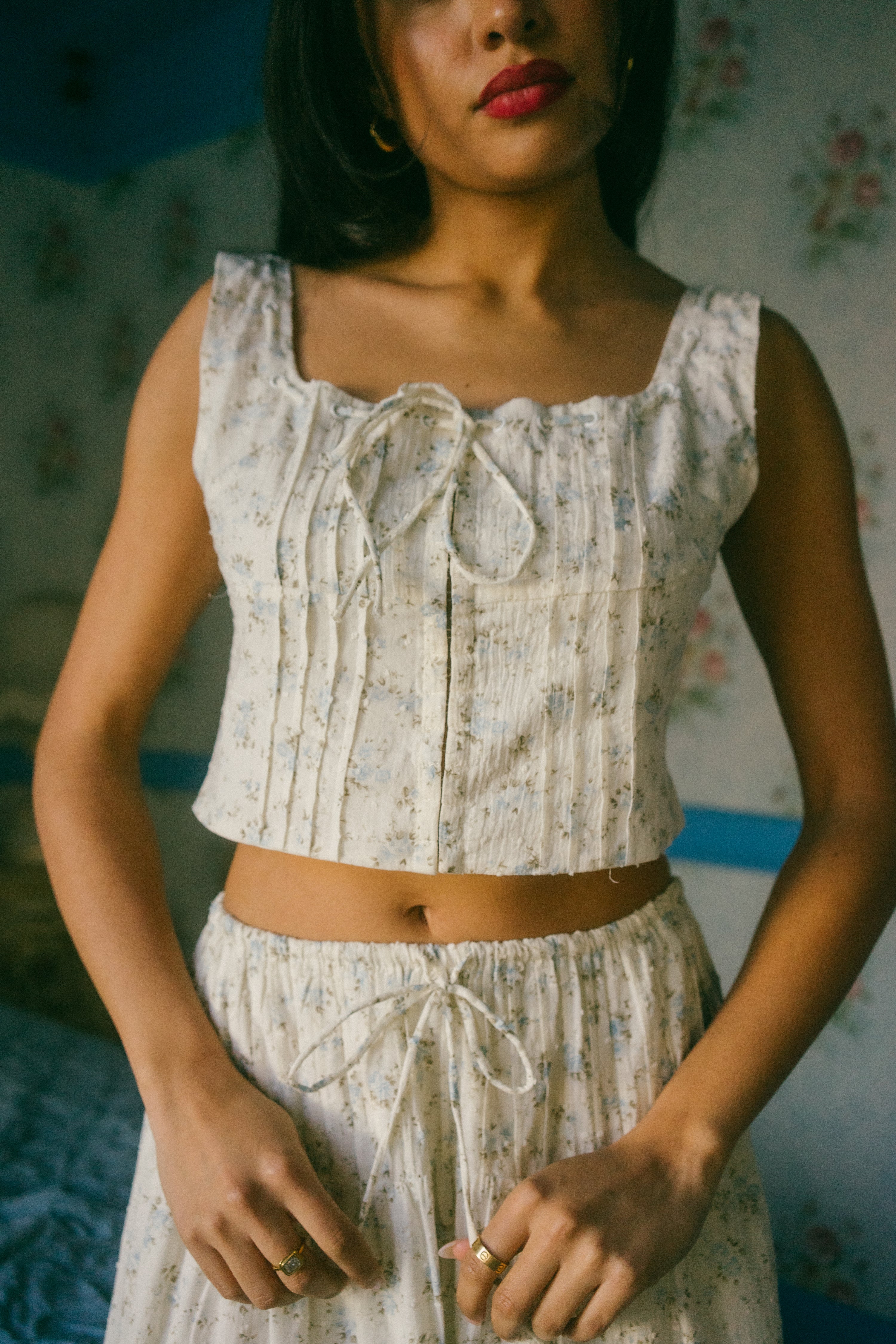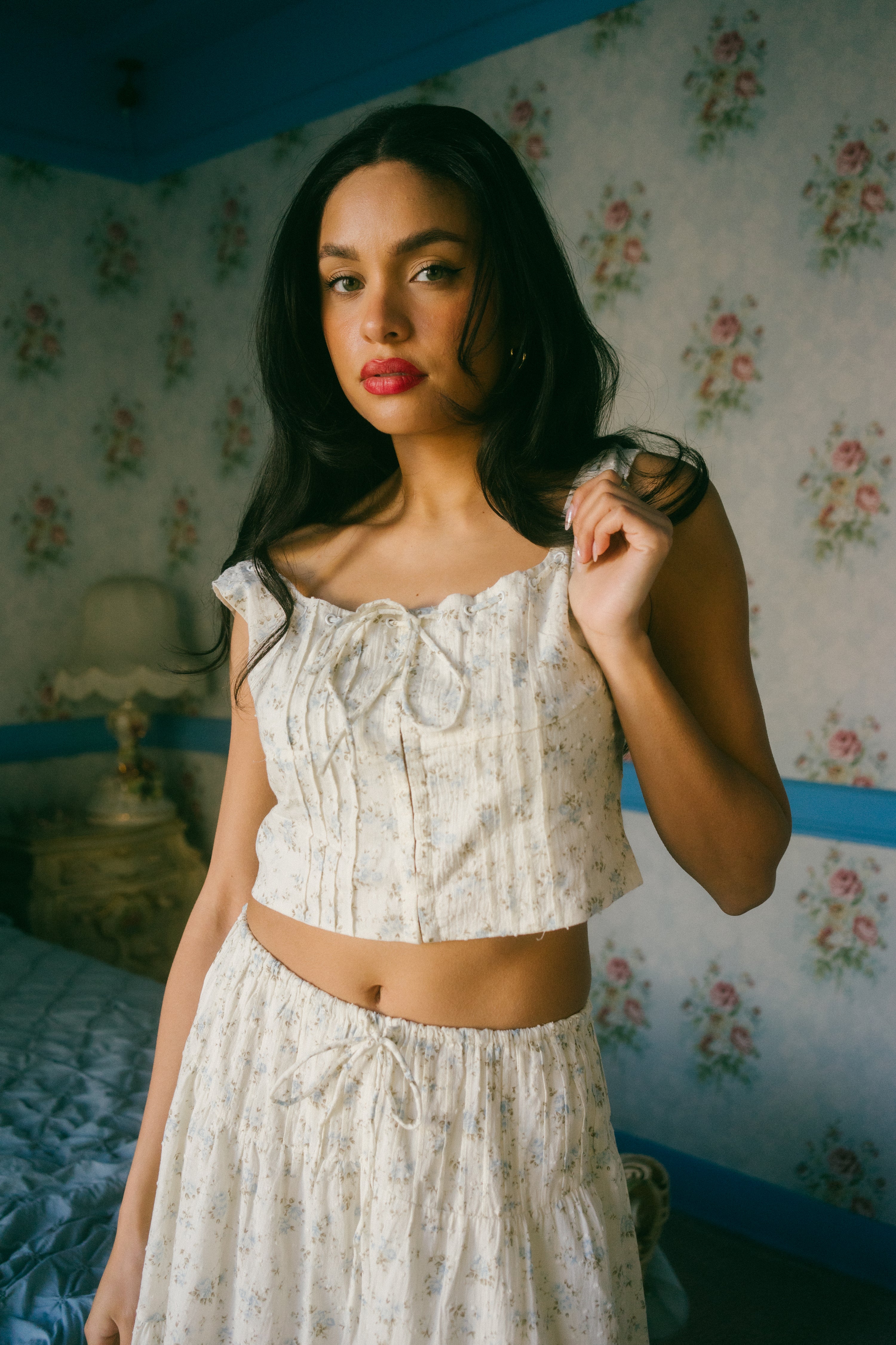 An Astrior favorite, the Hailey Set comes in a cream hue and is scattered in a soft muted blue and light green ditsy floral print. The piece comes with a semi cropped blouse with a square neckline, thick straps for sleeves and an oversized bow in the center of the neckline that weaves in and out of the top of the design. It has vertical pleated detailing along the bodice with functional clasps down the center of the blouse. The skirt is decorated with fabric gathering details along the waistband and tiers, creating an extra flowly, vintage inspired look. Finished off with an adjustable waist tie that ties together in an oversized bow, style with your go-to slides, an oversized tote and a messy updo for a romantic early spring day look.