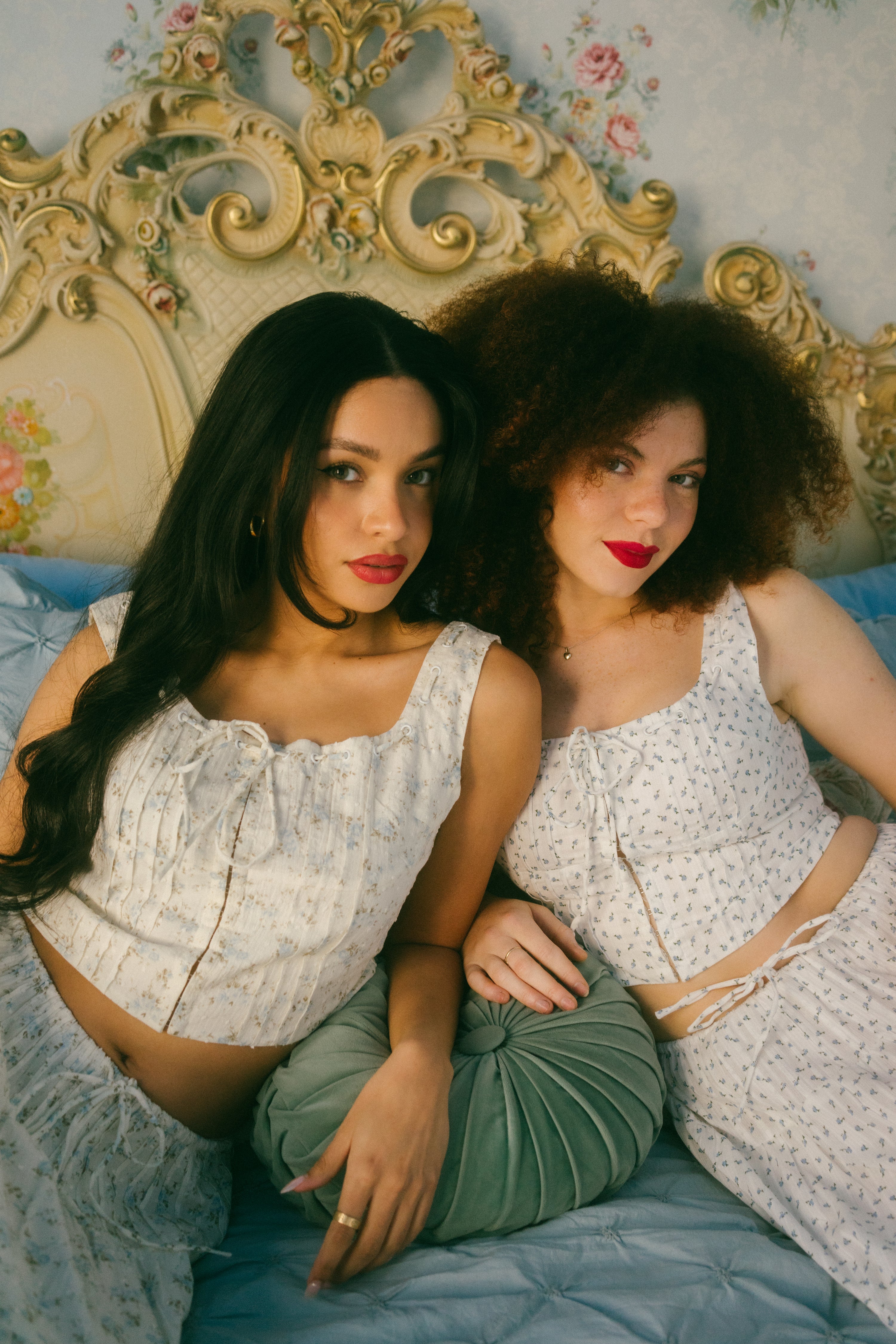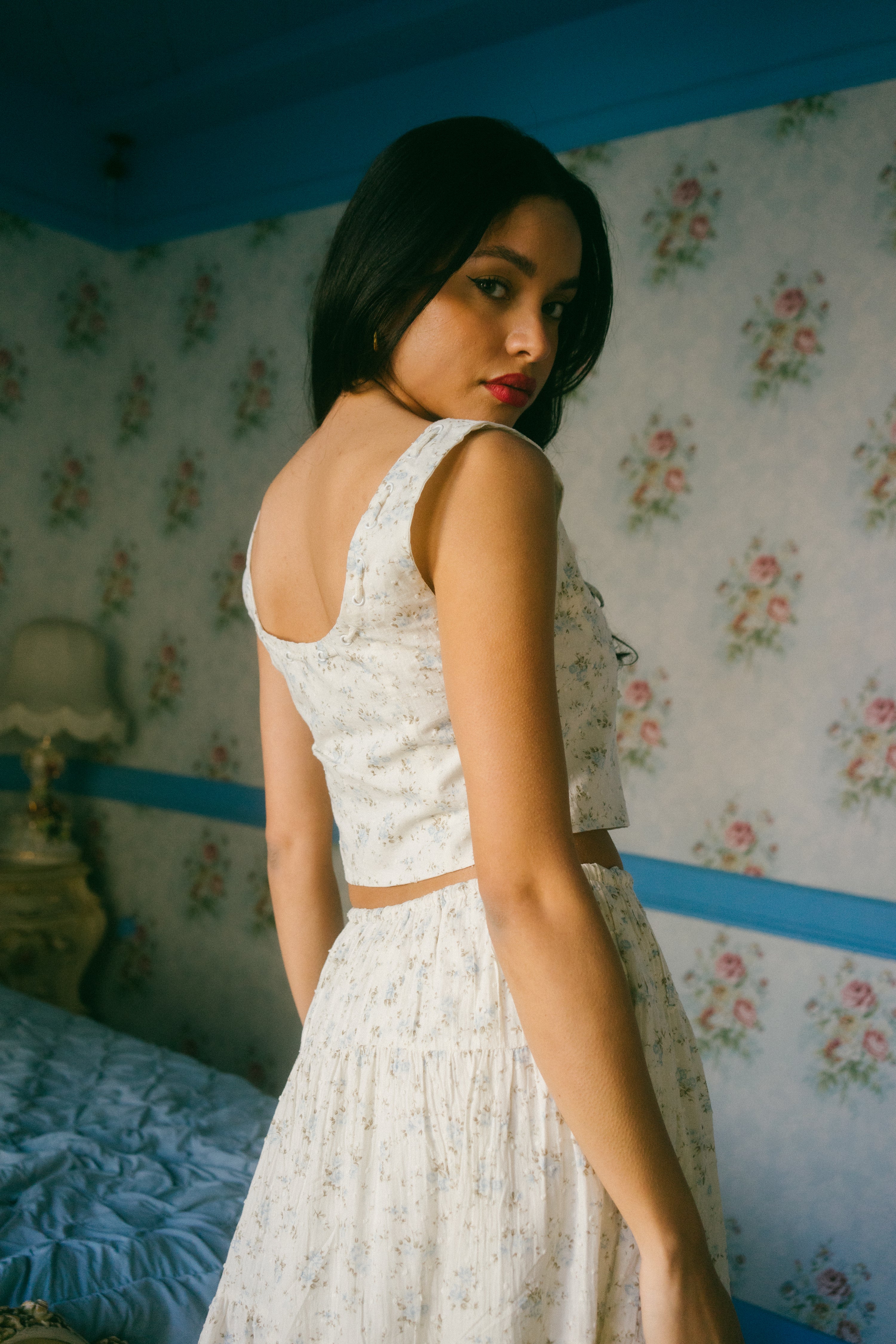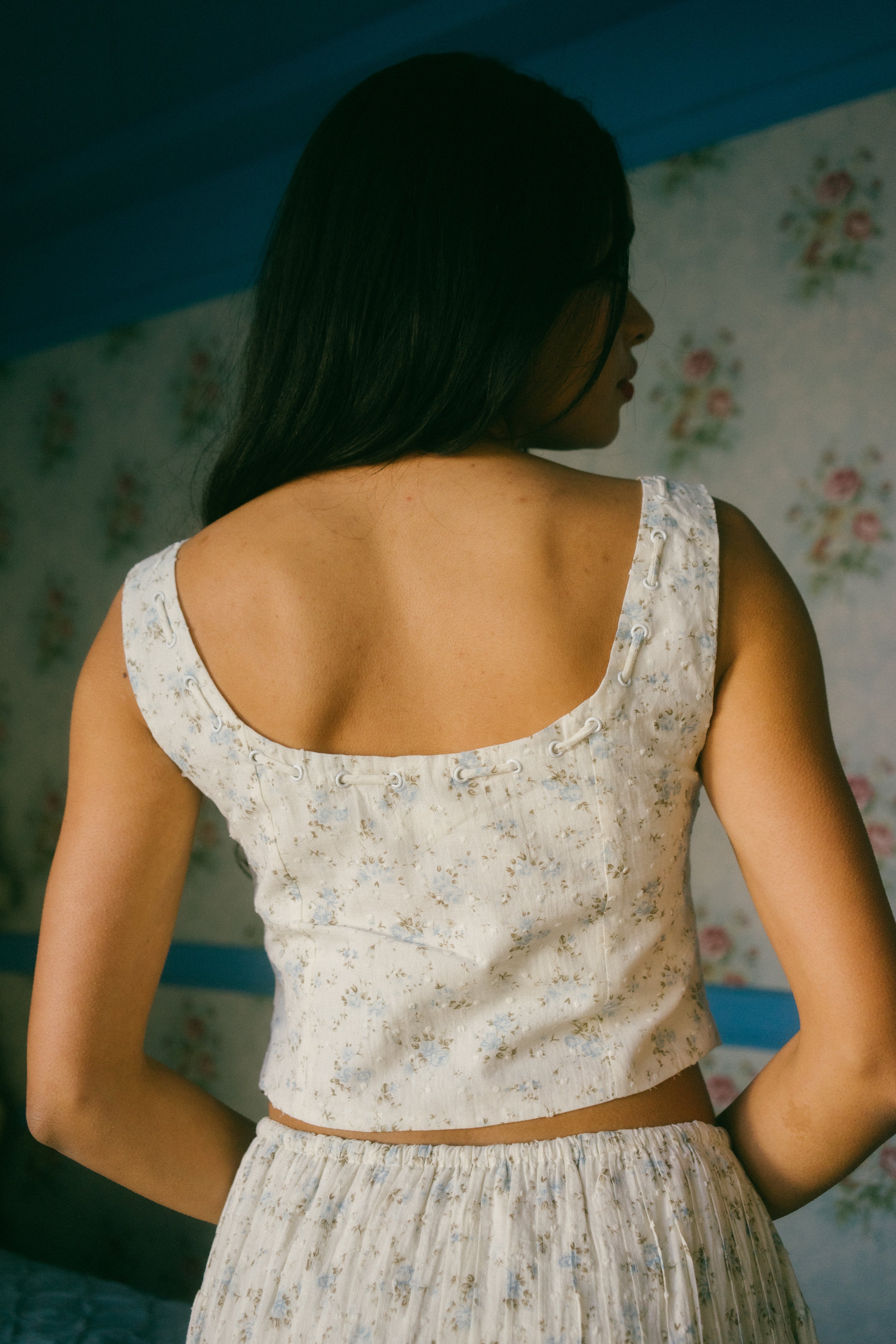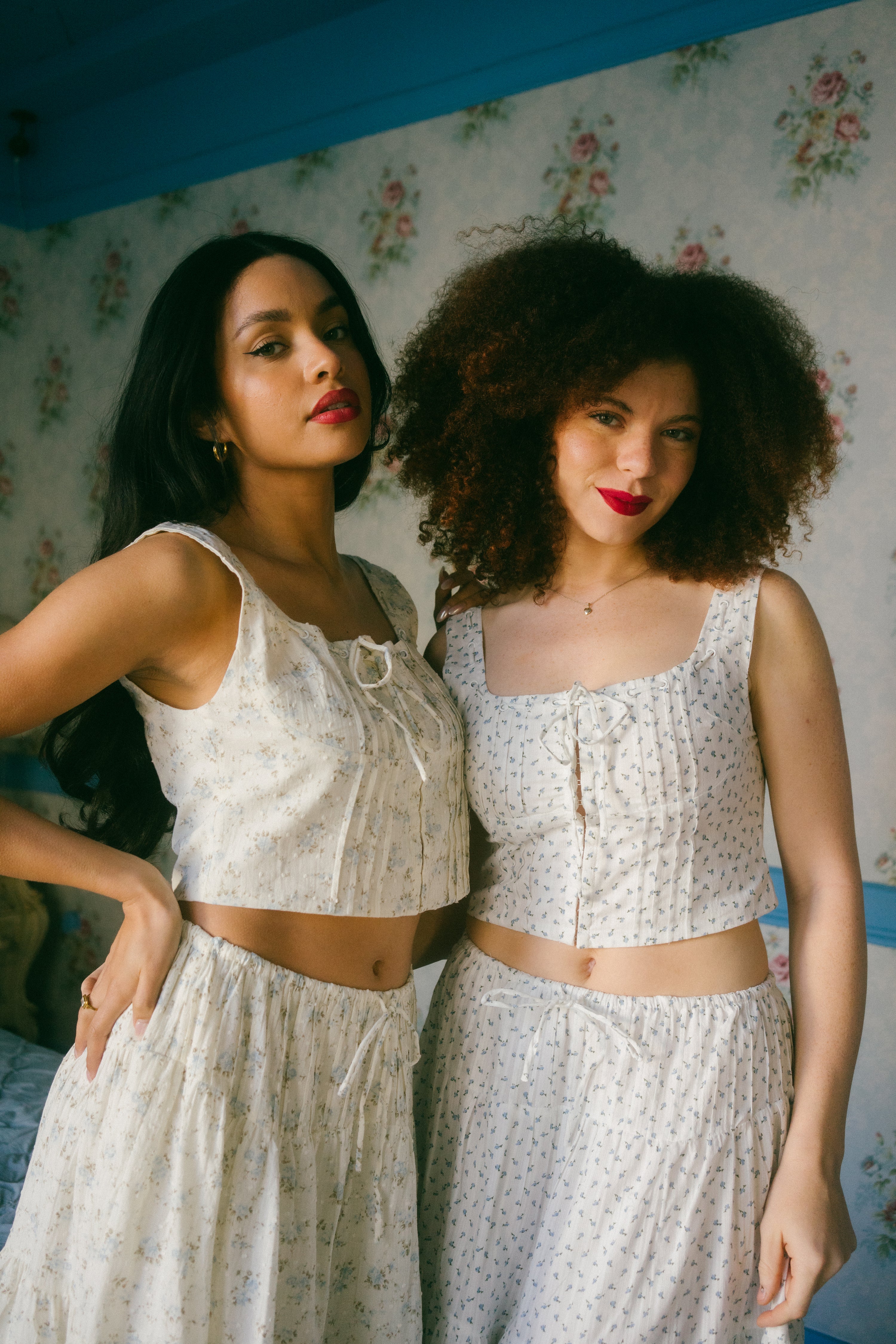 An Astrior favorite, the Hailey Set comes in a cream hue and is scattered in a soft muted blue and light green ditsy floral print. The piece comes with a semi cropped blouse with a square neckline, thick straps for sleeves and an oversized bow in the center of the neckline that weaves in and out of the top of the design. It has vertical pleated detailing along the bodice with functional clasps down the center of the blouse. The skirt is decorated with fabric gathering details along the waistband and tiers, creating an extra flowly, vintage inspired look. Finished off with an adjustable waist tie that ties together in an oversized bow, style with your go-to slides, an oversized tote and a messy updo for a romantic early spring day look.