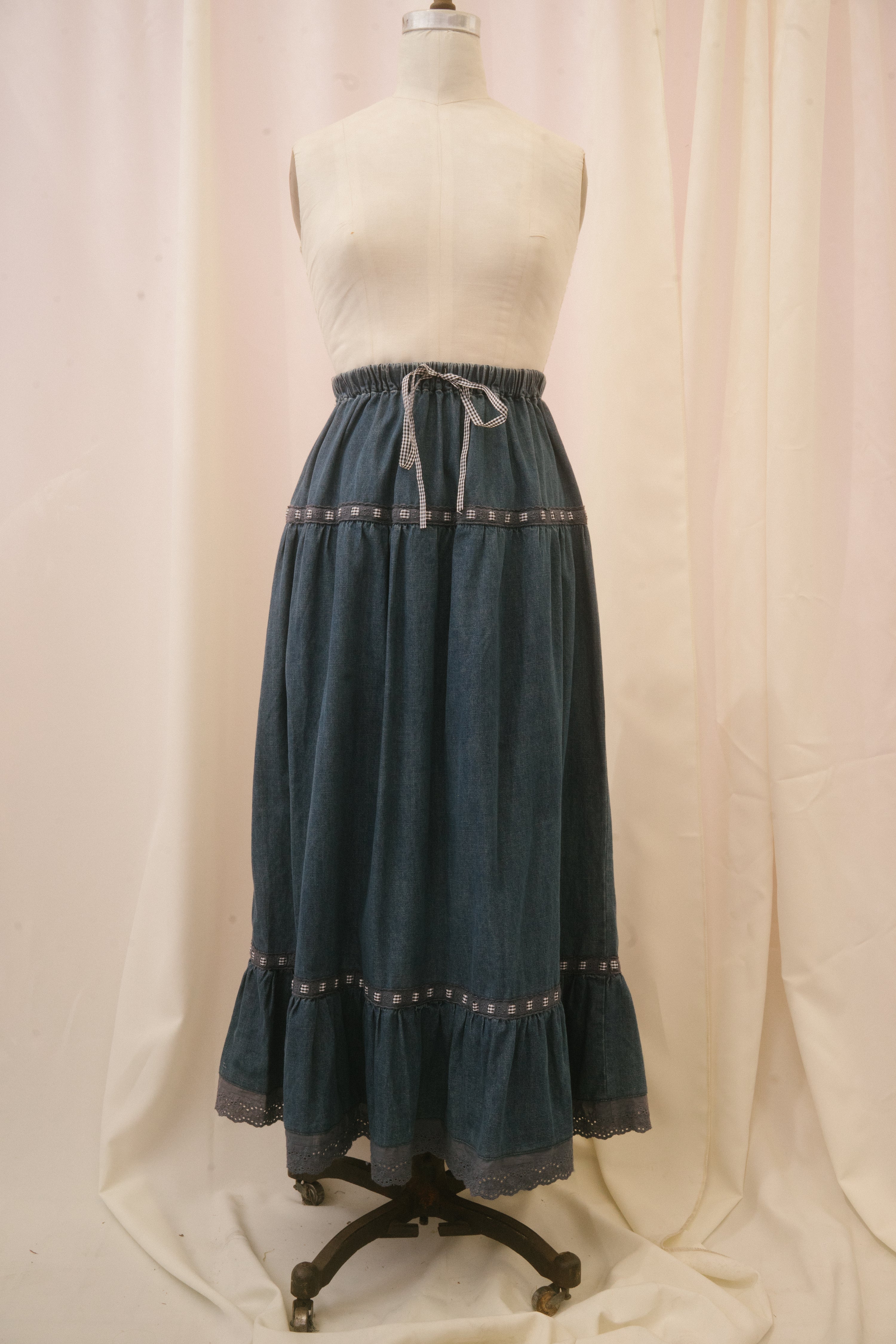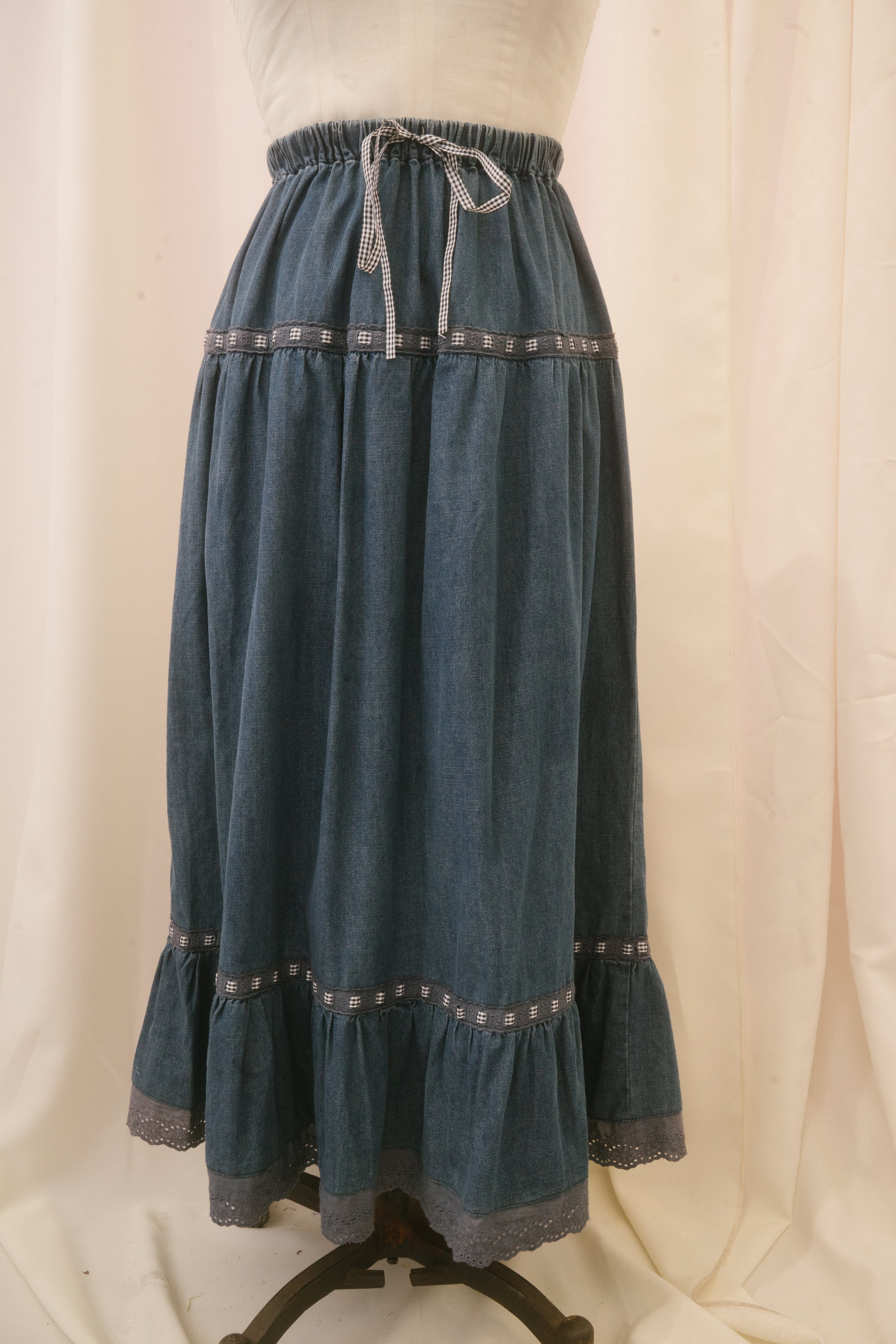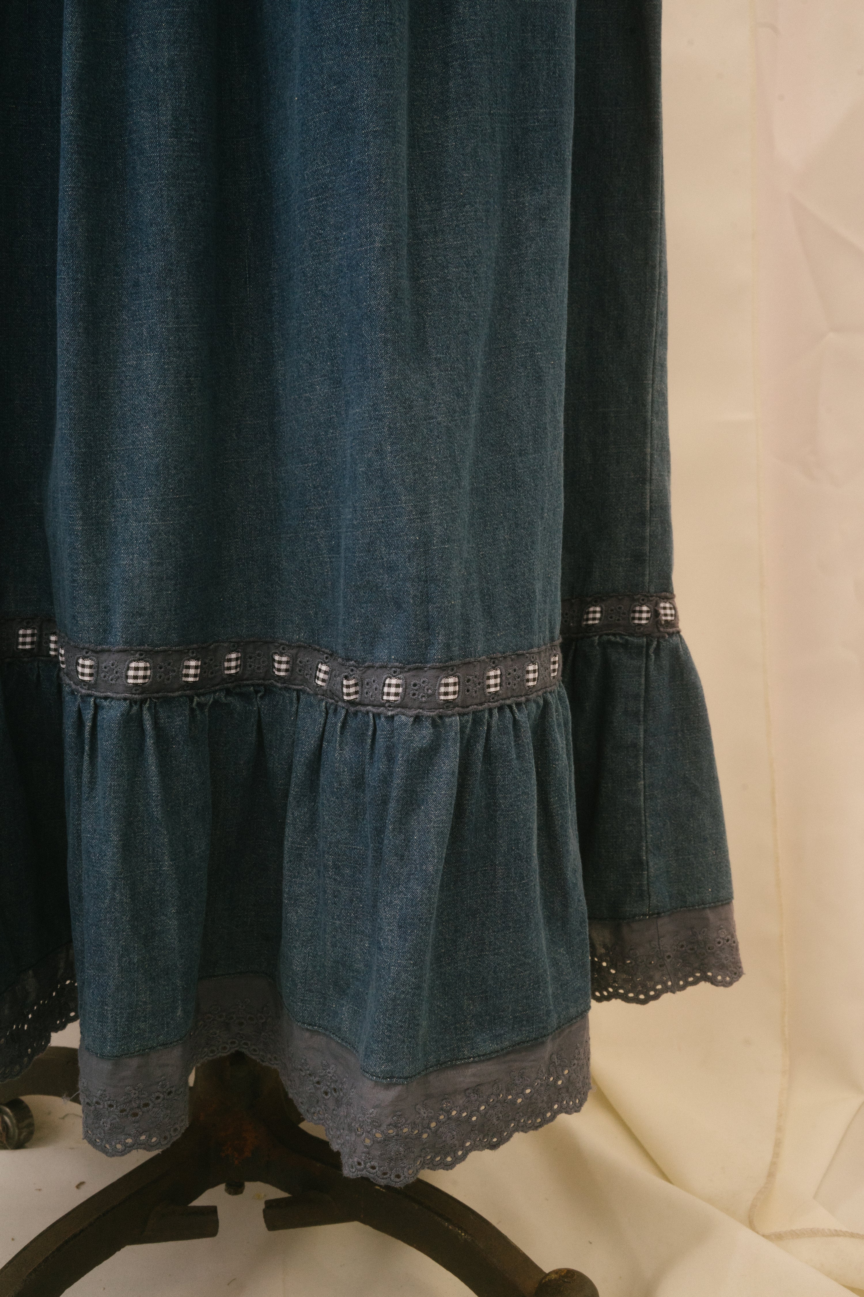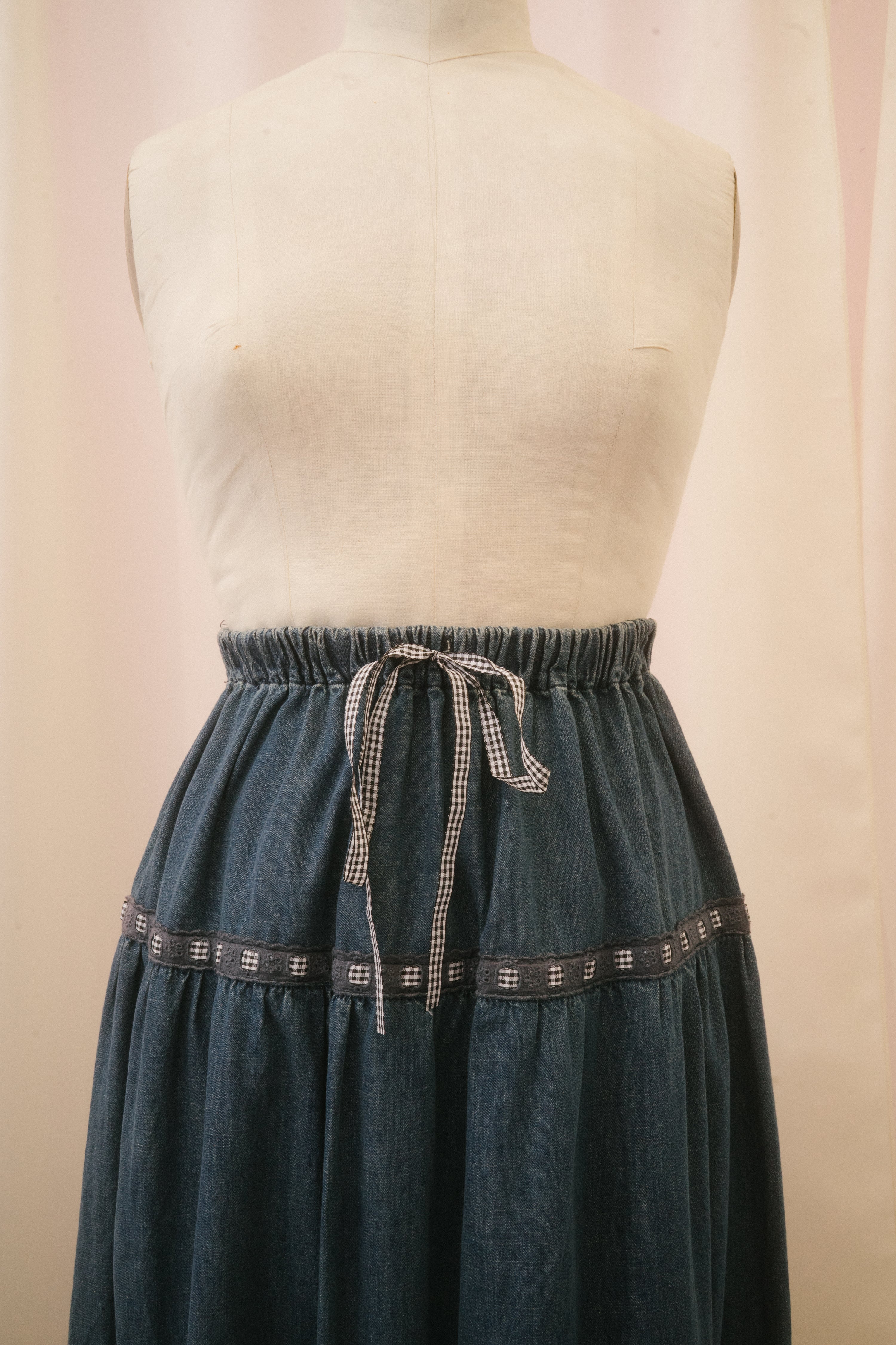 The Indigo skirt takes us back to the days of back-to-school cool. This tiered a-line denim midi skirt features a darling black and gingham functional ribbon tie at the elatic waistline that mirrors the ribbons threaded through the blue embroidered lace above each tier. The bottom hem is finished with a larger panel of scalloped blue lace. Pair with cat-eye glasses and a bright red lip.