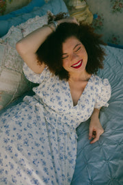 A comfy, perfect winter to spring transition piece, the Juna Dress comes in an off-white hue and is scattered in an oversized royal blue ditsy floral print. This midi / maxi dress has an empire waistline, v-neckline with exaggerated ruffle detailing along the shoulders and waist. The piece is lined with a tiered, mermaid hemline. It has fabric gathering along the waistline creating a very vintage inspired, prairie dress silhouette.