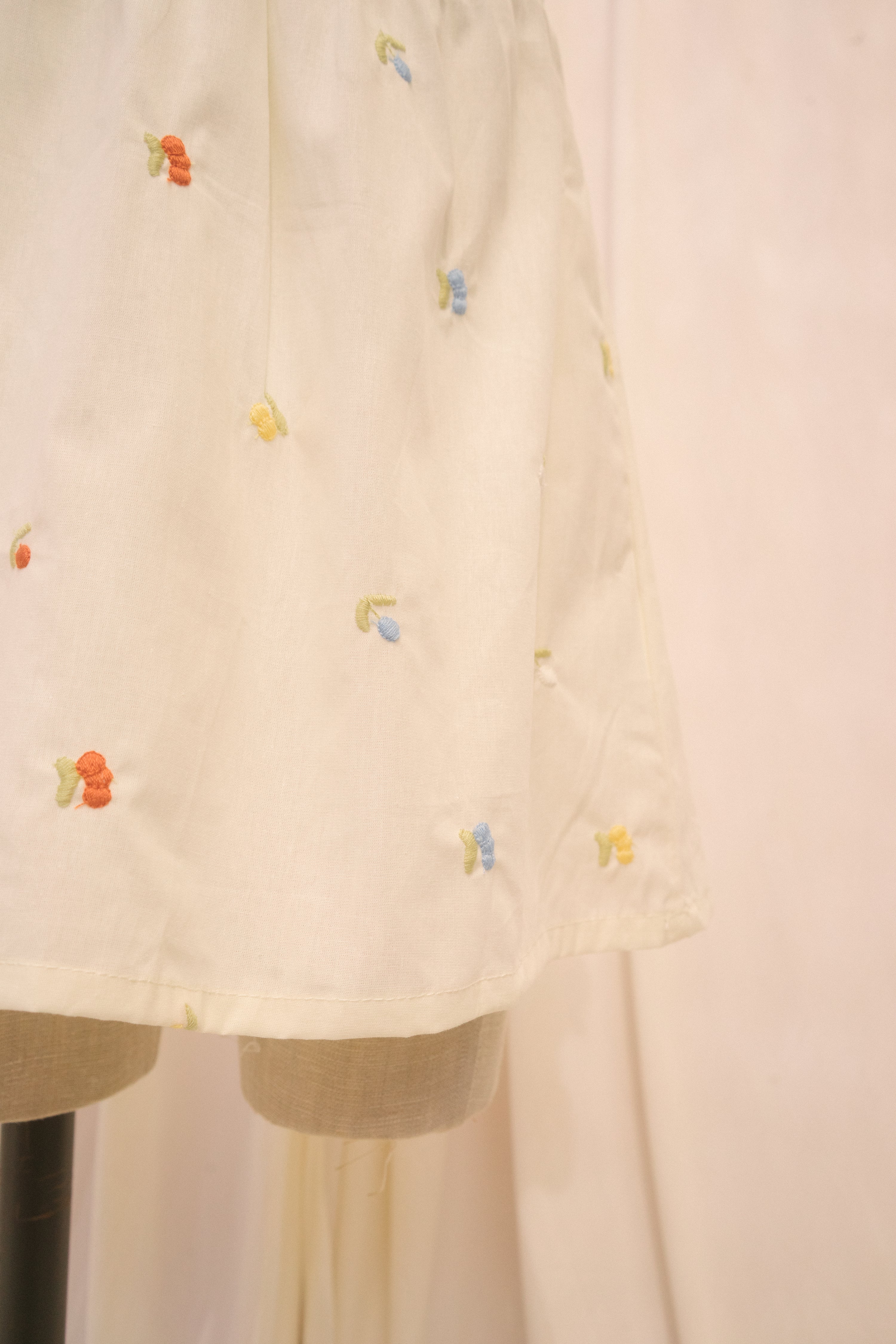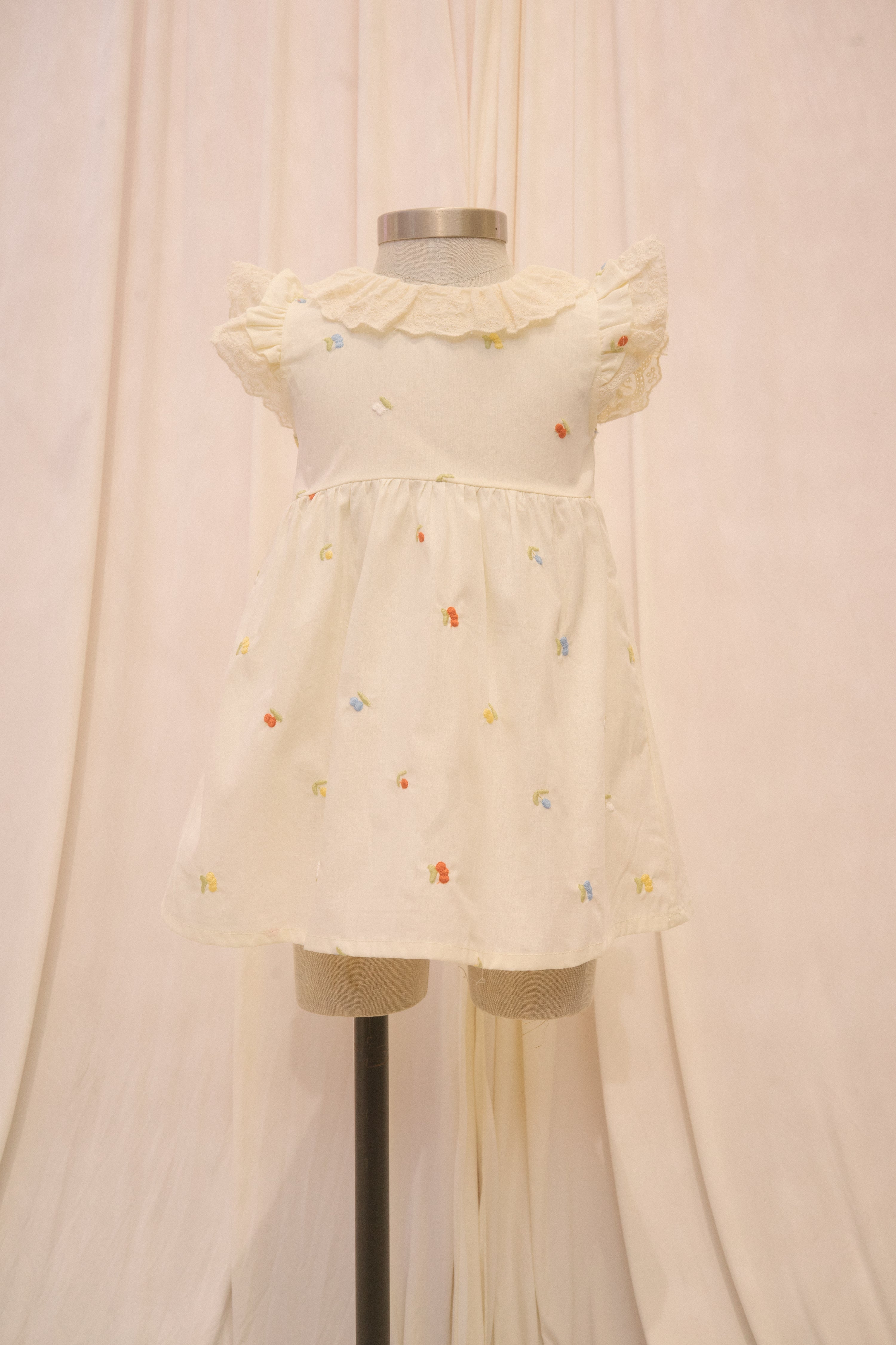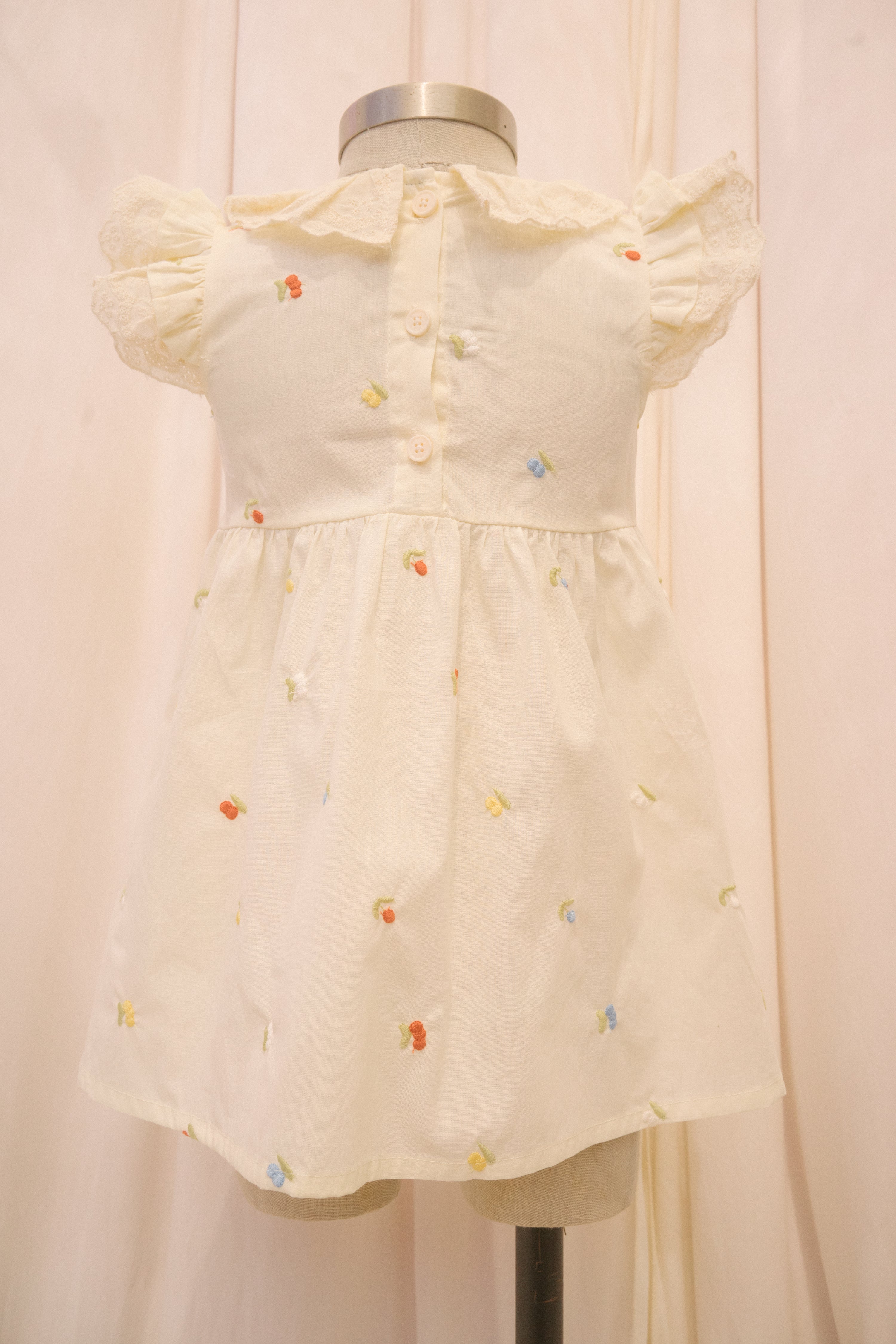 The Little Garden sundress comes in a rich cream fabric with delicate embroidered green, blue, white, red, and yellow berries throughout. This babydoll dress features a lace ruff collar and lace flutter sleeves. Three buttons down the back of the bodice ensure a comfy, snug fit.