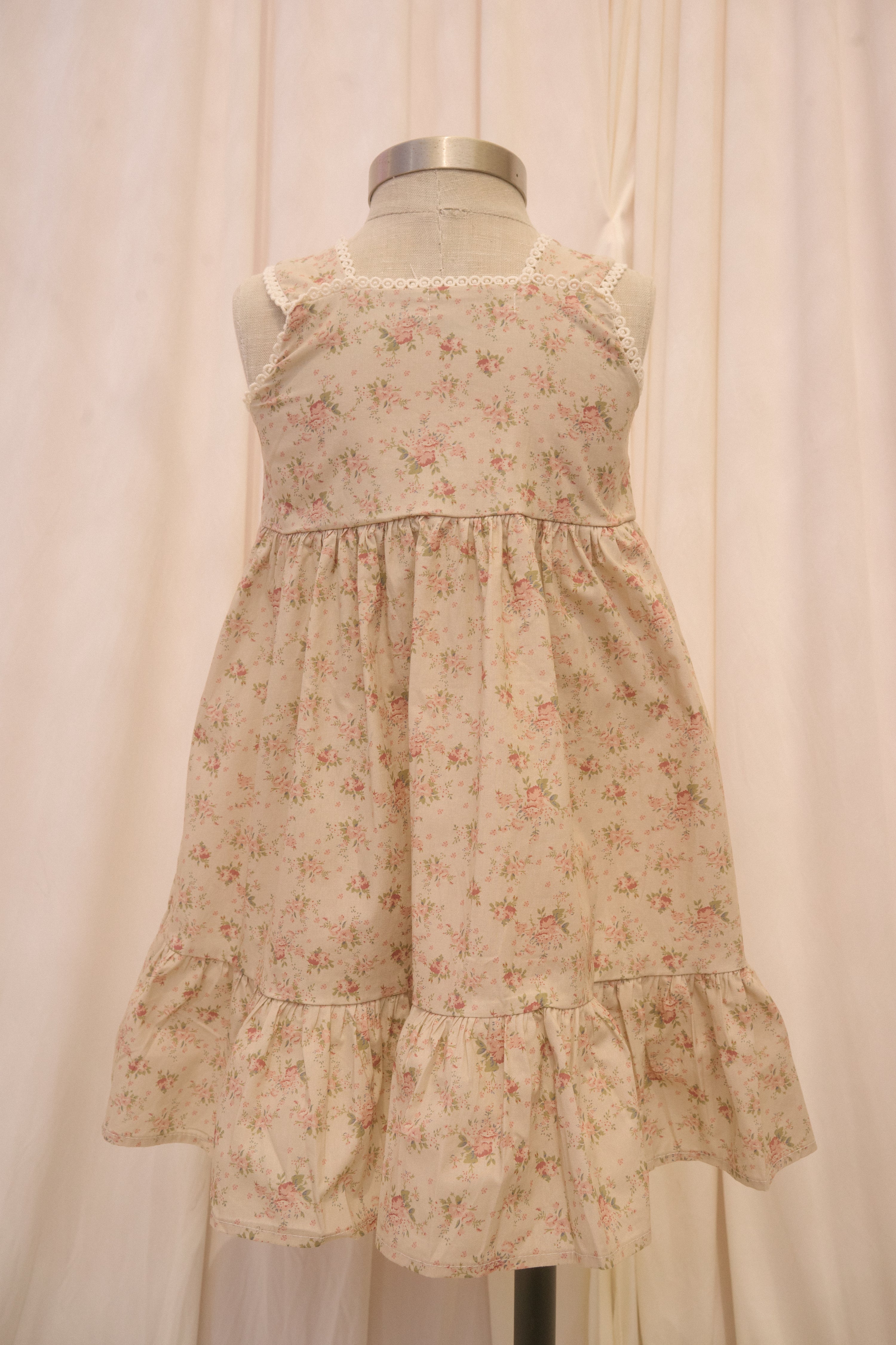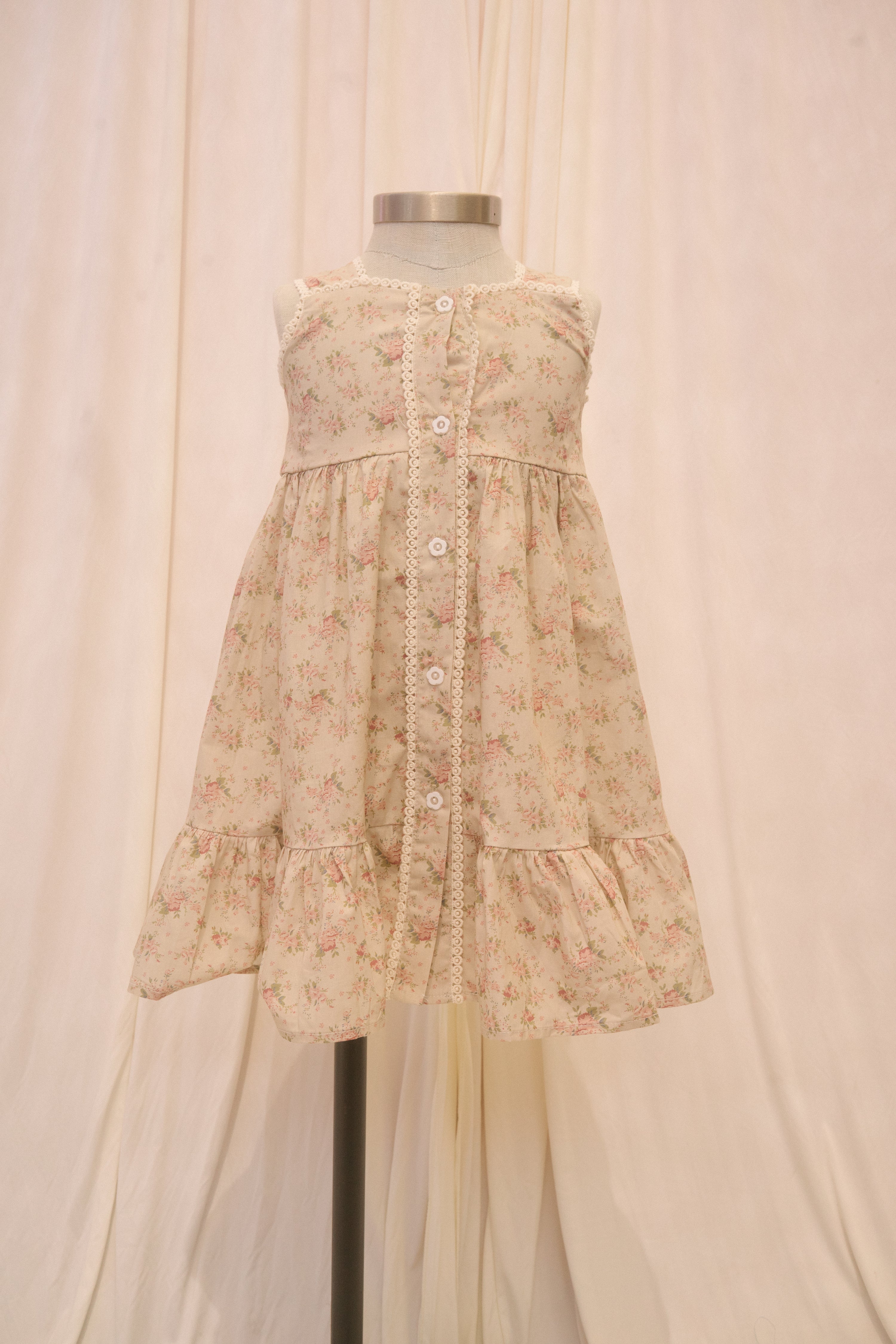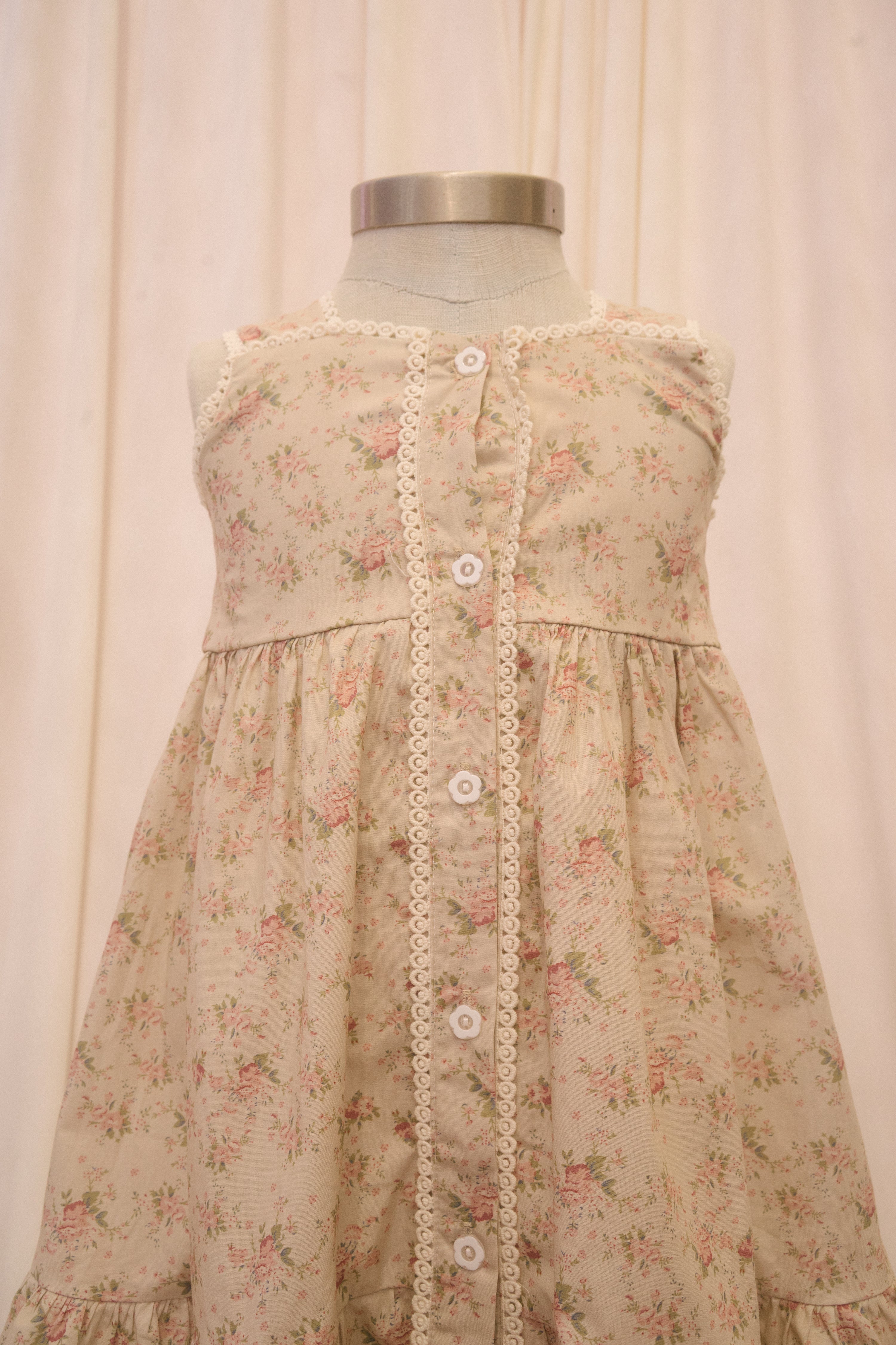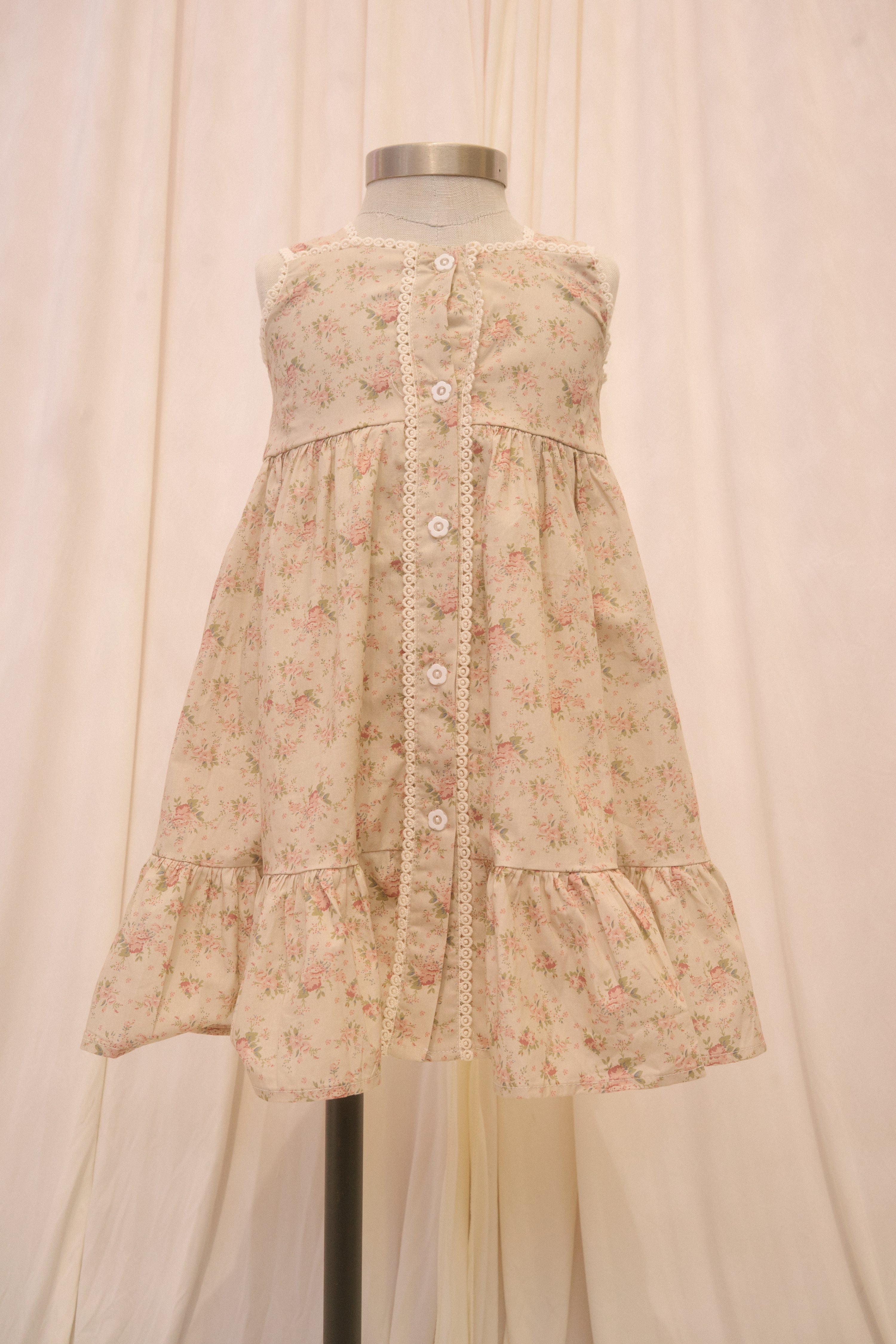 The Mimi sundress comes in a brown fabric with a dusty pink and green vintage floral print. The button down column dress features decorative embroidered details at the bodice and down the center, and the functional buttons are made with a flower design. The bottom hem boasts a tier for a little extra bounce!
