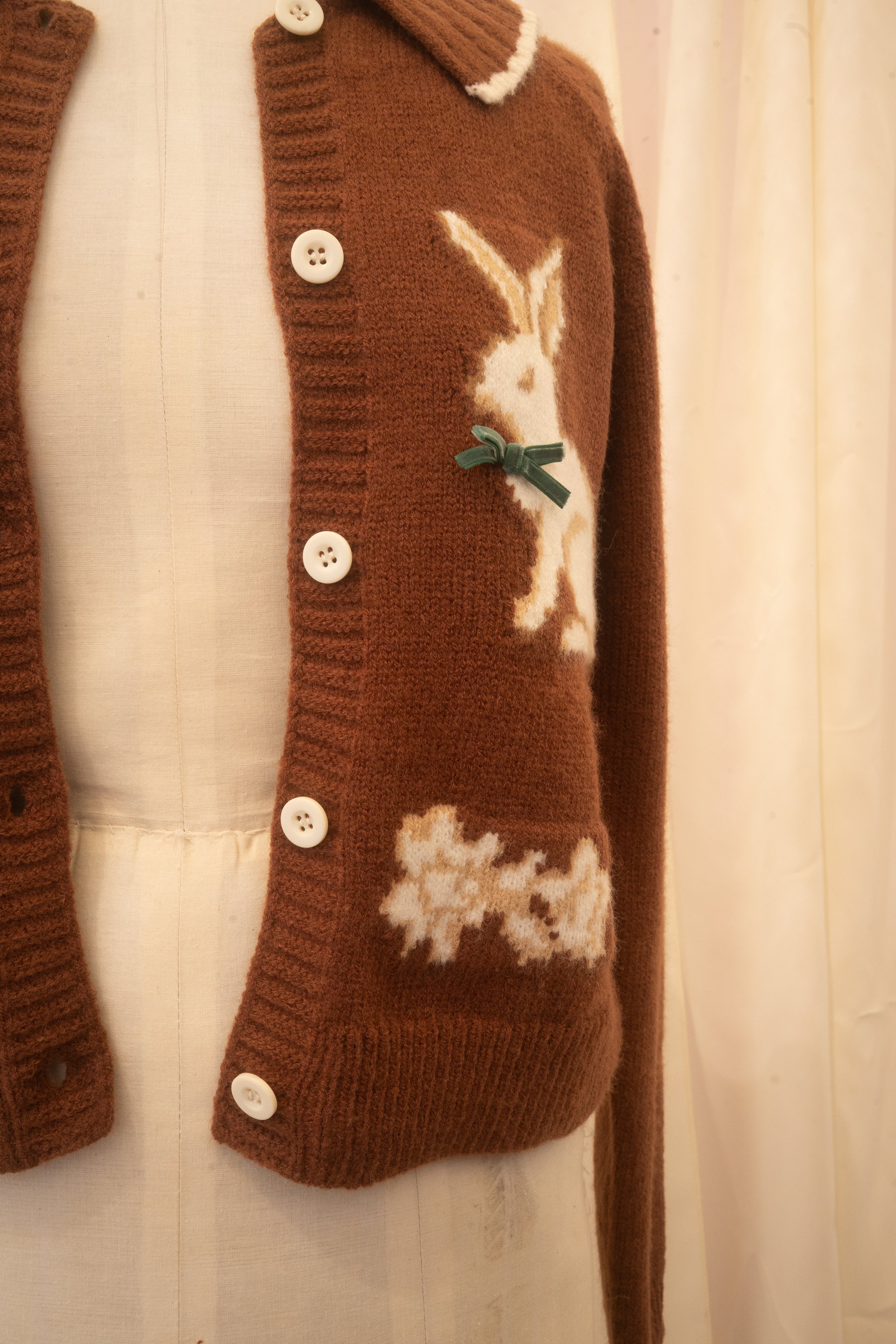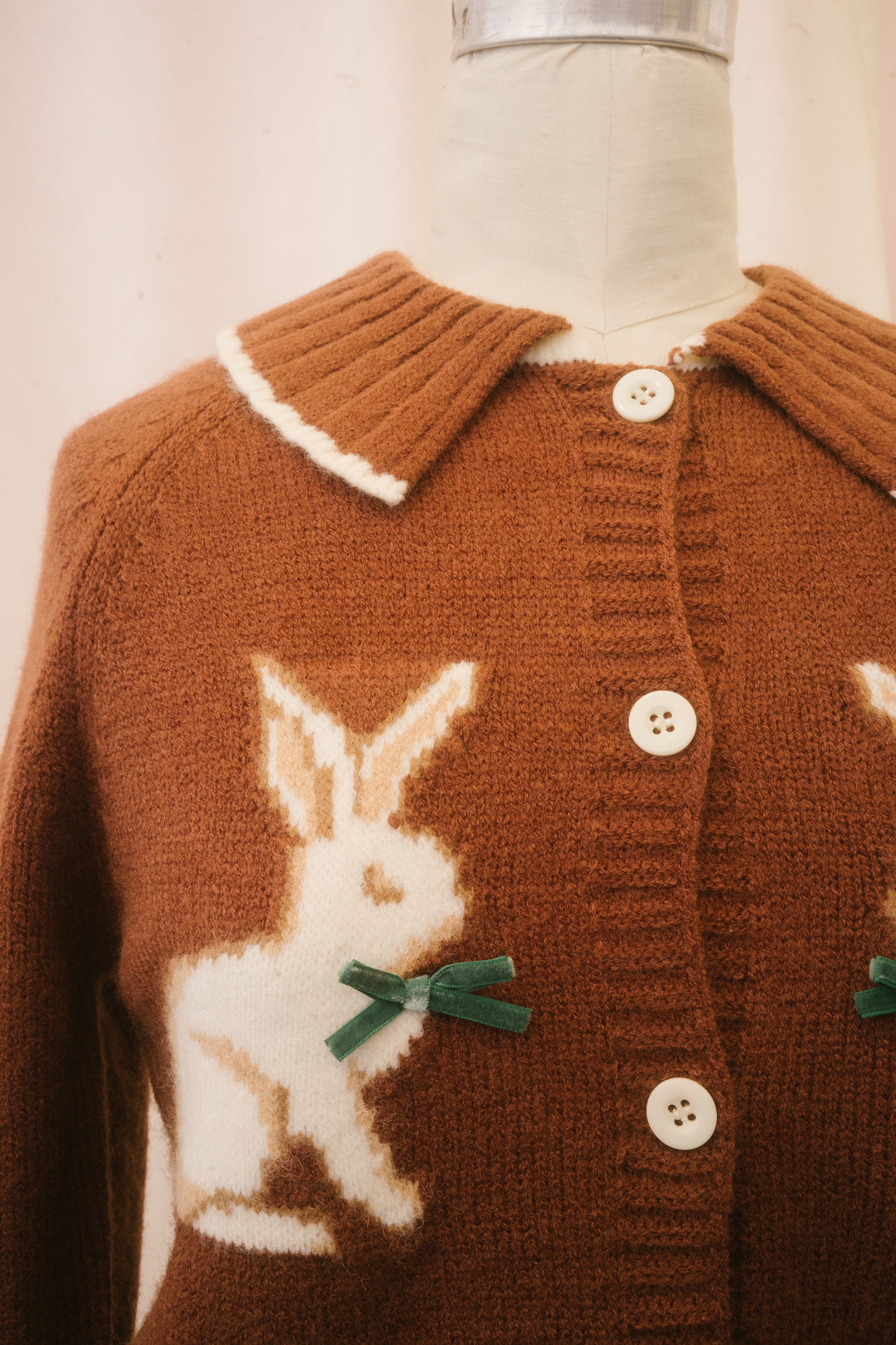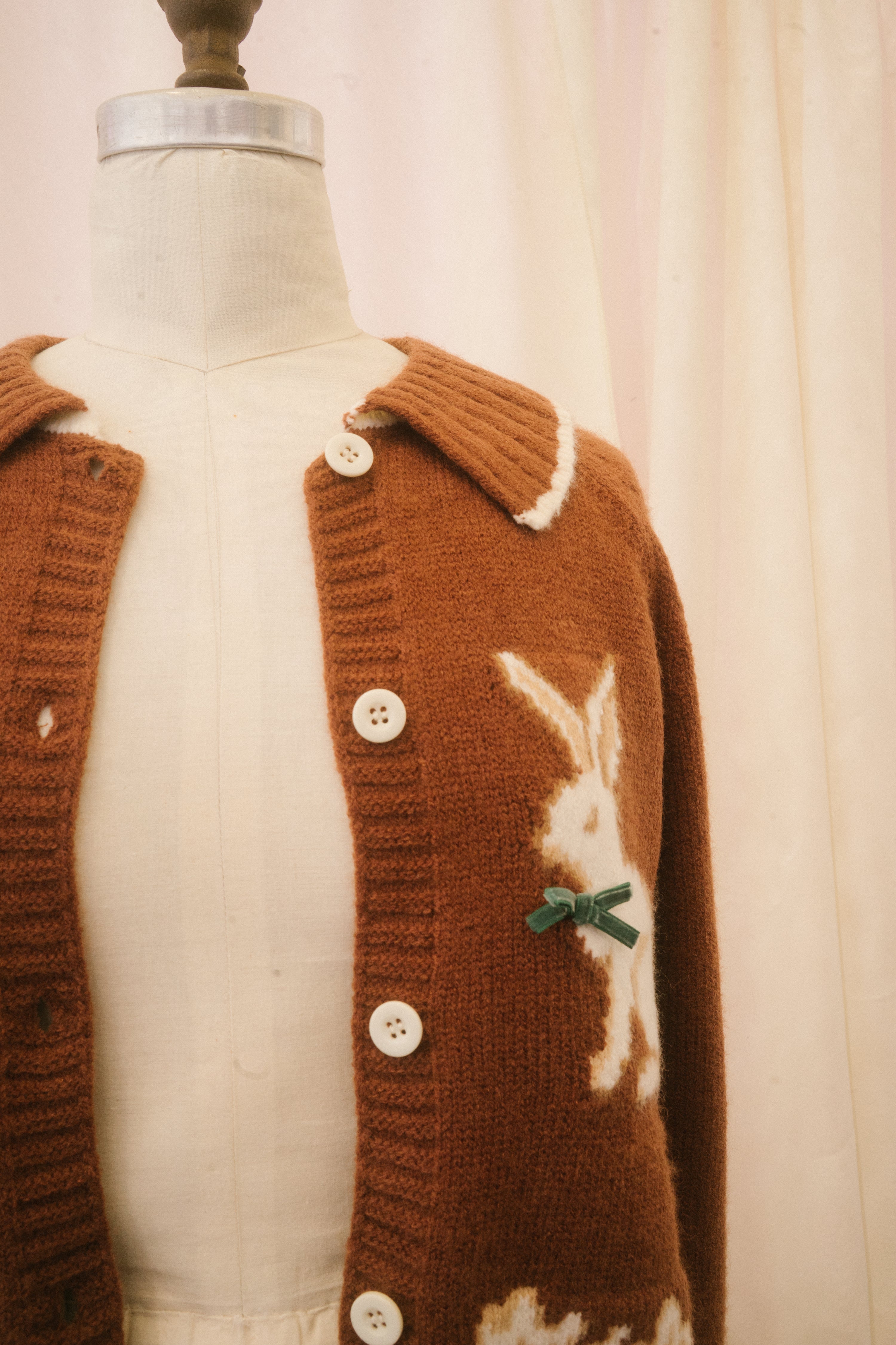 The dreamy Lapin cardigan in chestnut looks ripped from the pages of Beatrix Potter. This brown and cream knit sweater features a large ribbed peter pan collar with a cream border and a central row of functional cream buttons. The chest is adorned with a darling pair of brown and cream rabbits finished with 3D neckties made from green velvet ribbon. A set of floral garlands beneath the rabbits completes the fairy tale vignette. Perfect for curling up with tea and a good book.