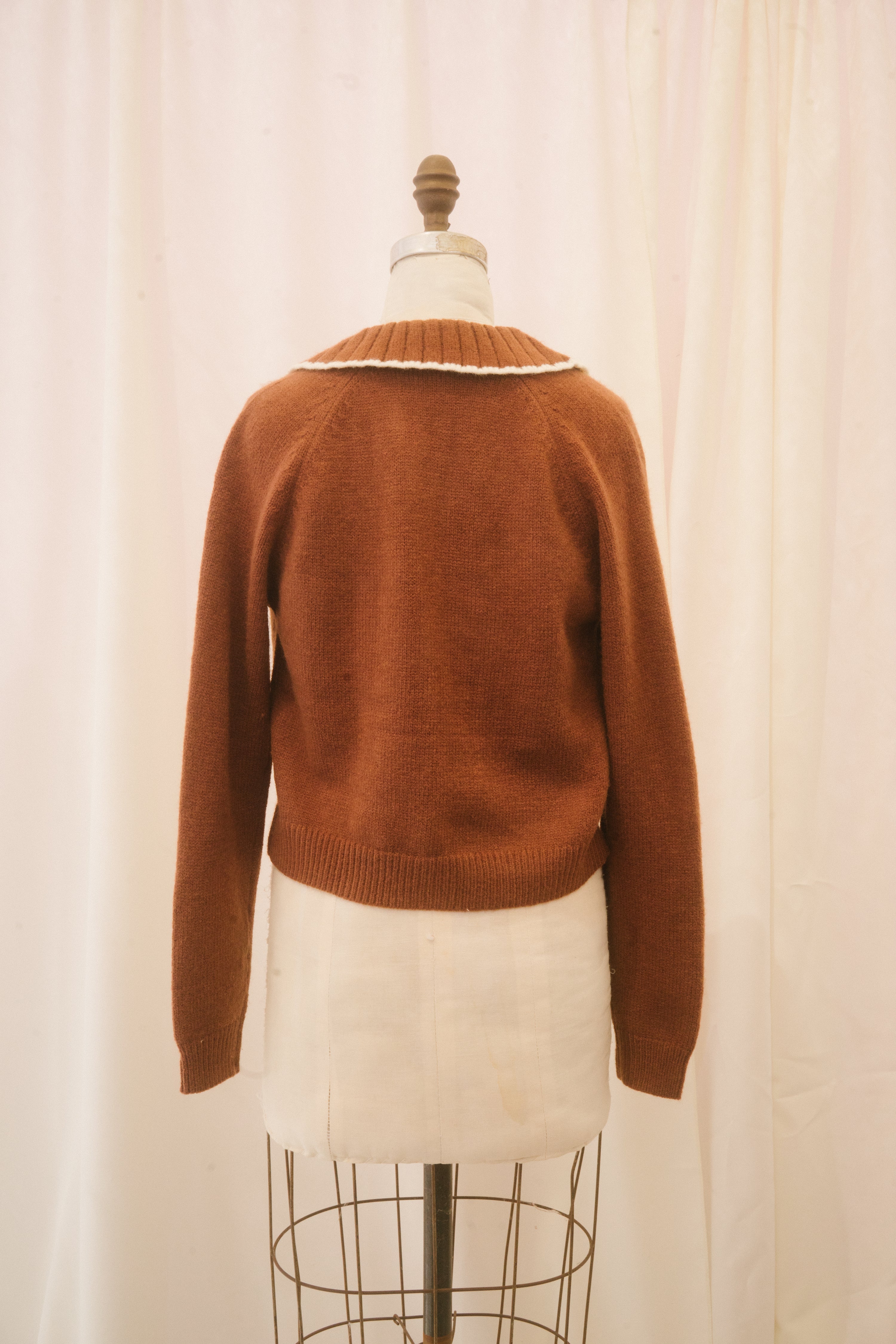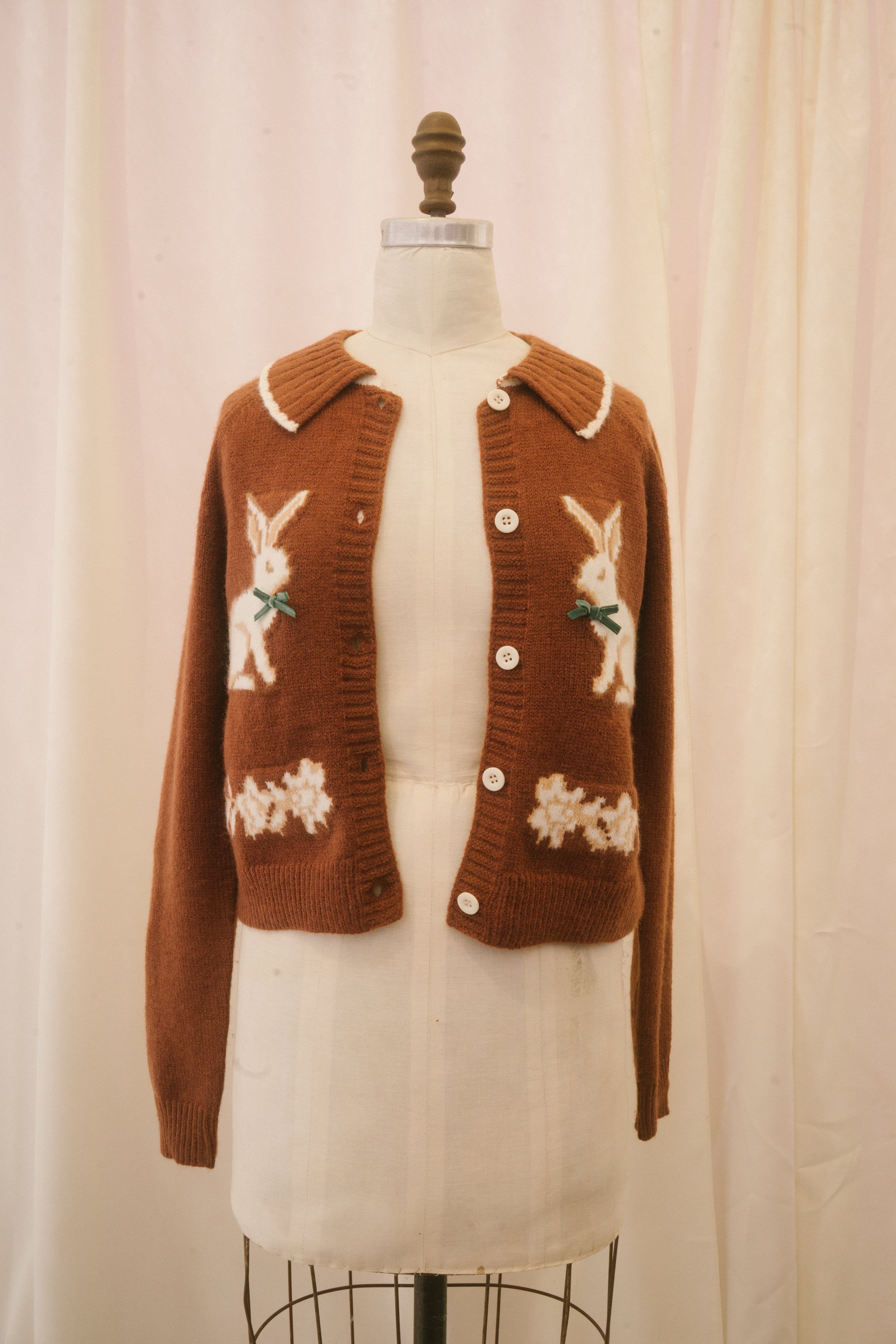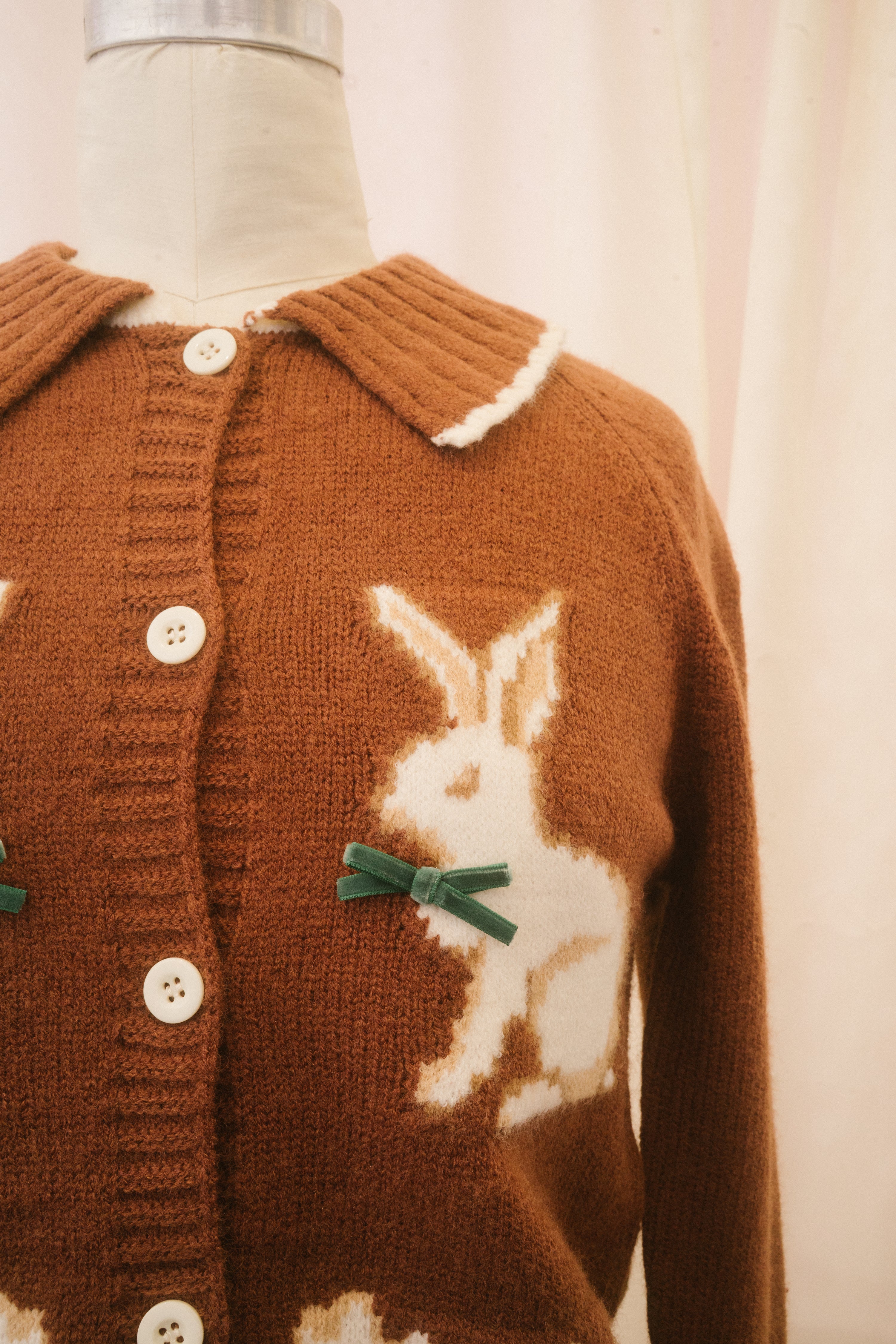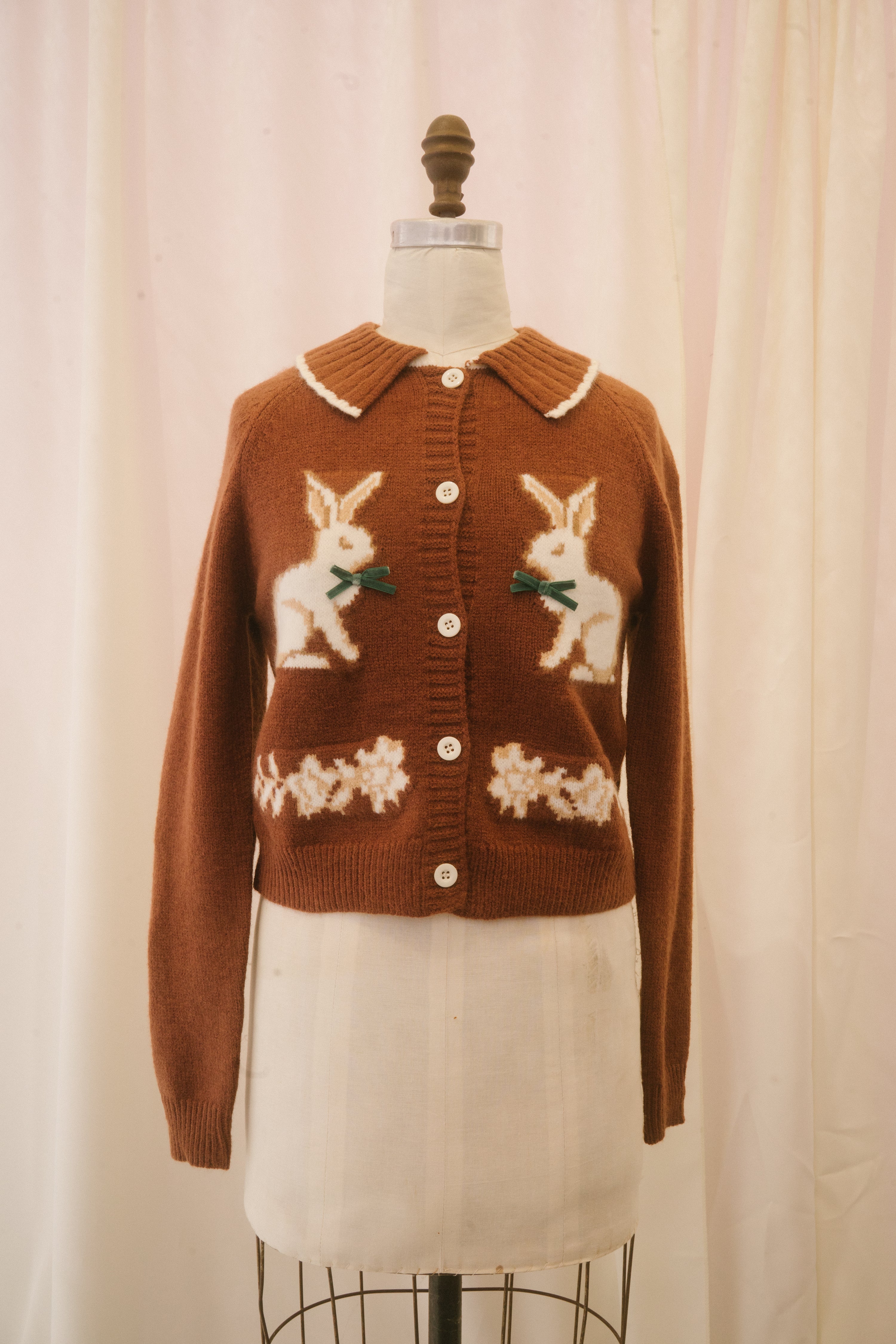 The dreamy Lapin cardigan in chestnut looks ripped from the pages of Beatrix Potter. This brown and cream knit sweater features a large ribbed peter pan collar with a cream border and a central row of functional cream buttons. The chest is adorned with a darling pair of brown and cream rabbits finished with 3D neckties made from green velvet ribbon. A set of floral garlands beneath the rabbits completes the fairy tale vignette. Perfect for curling up with tea and a good book.