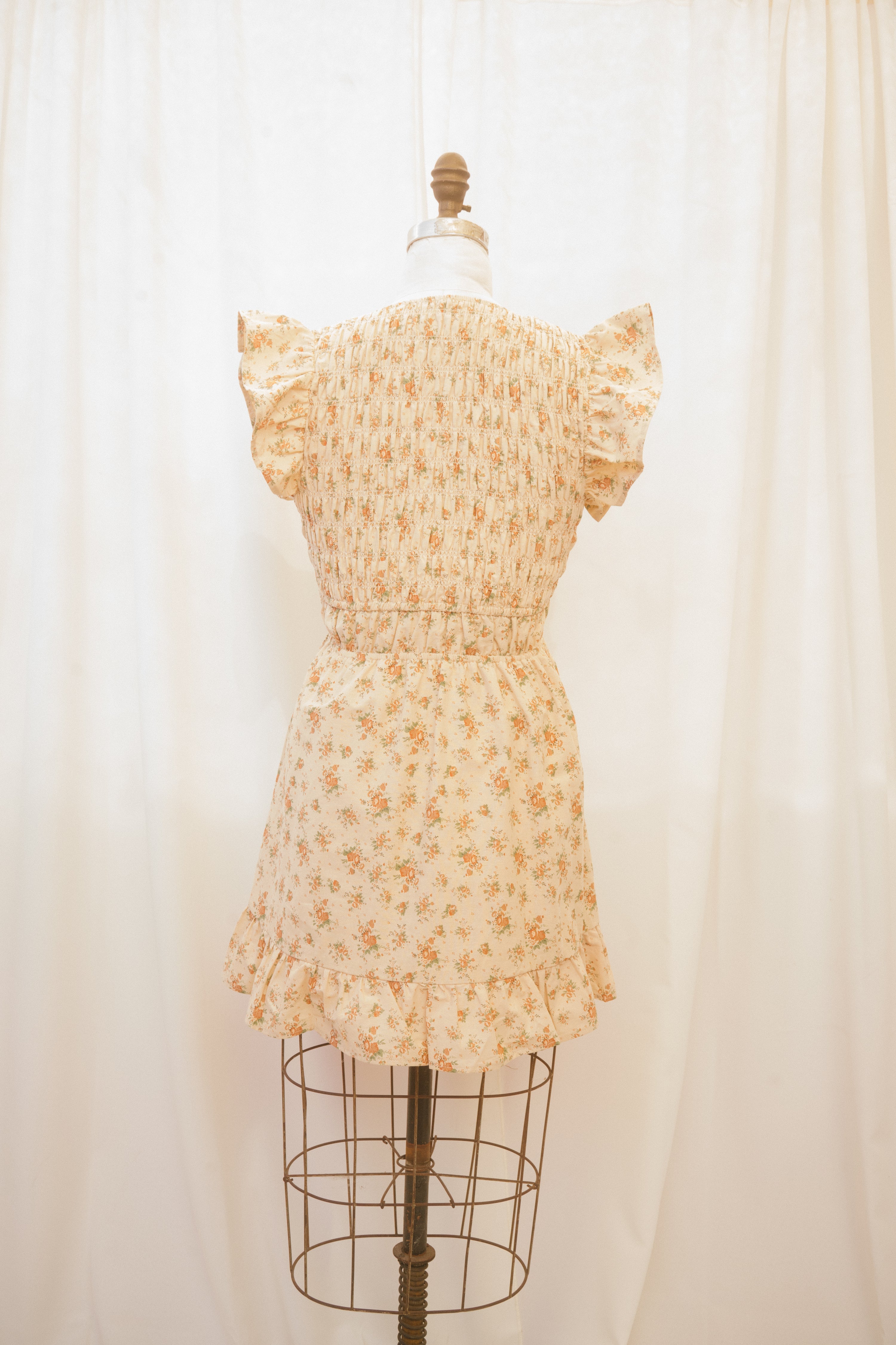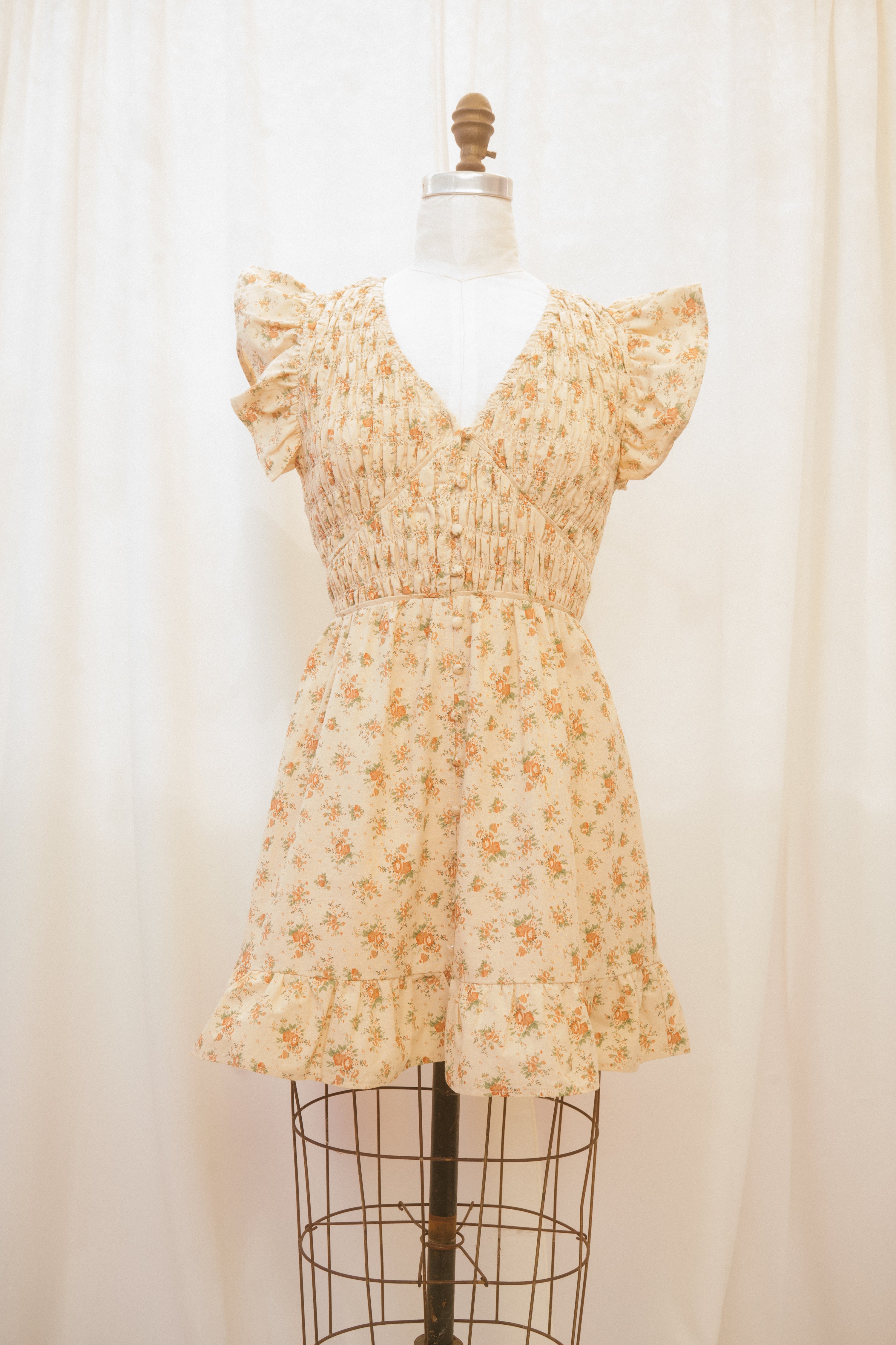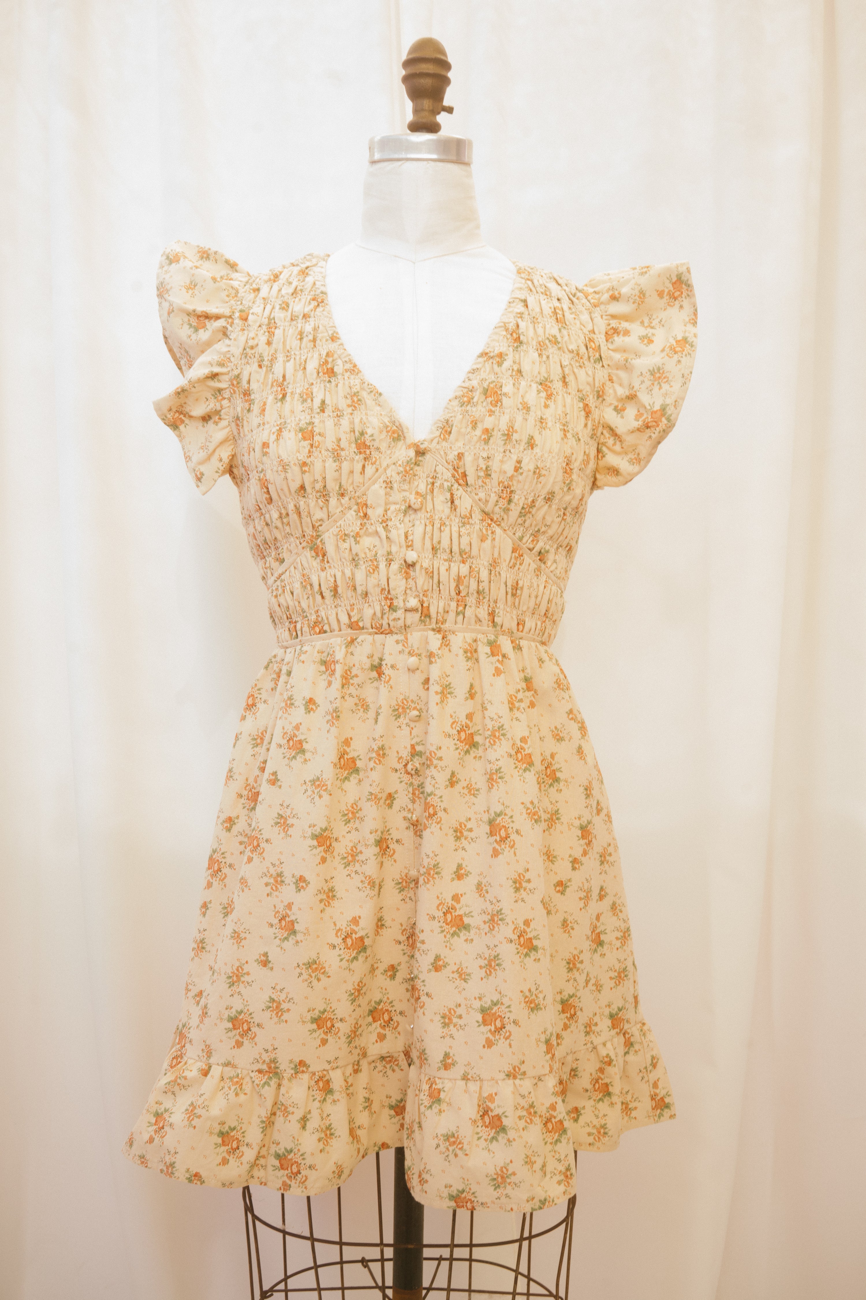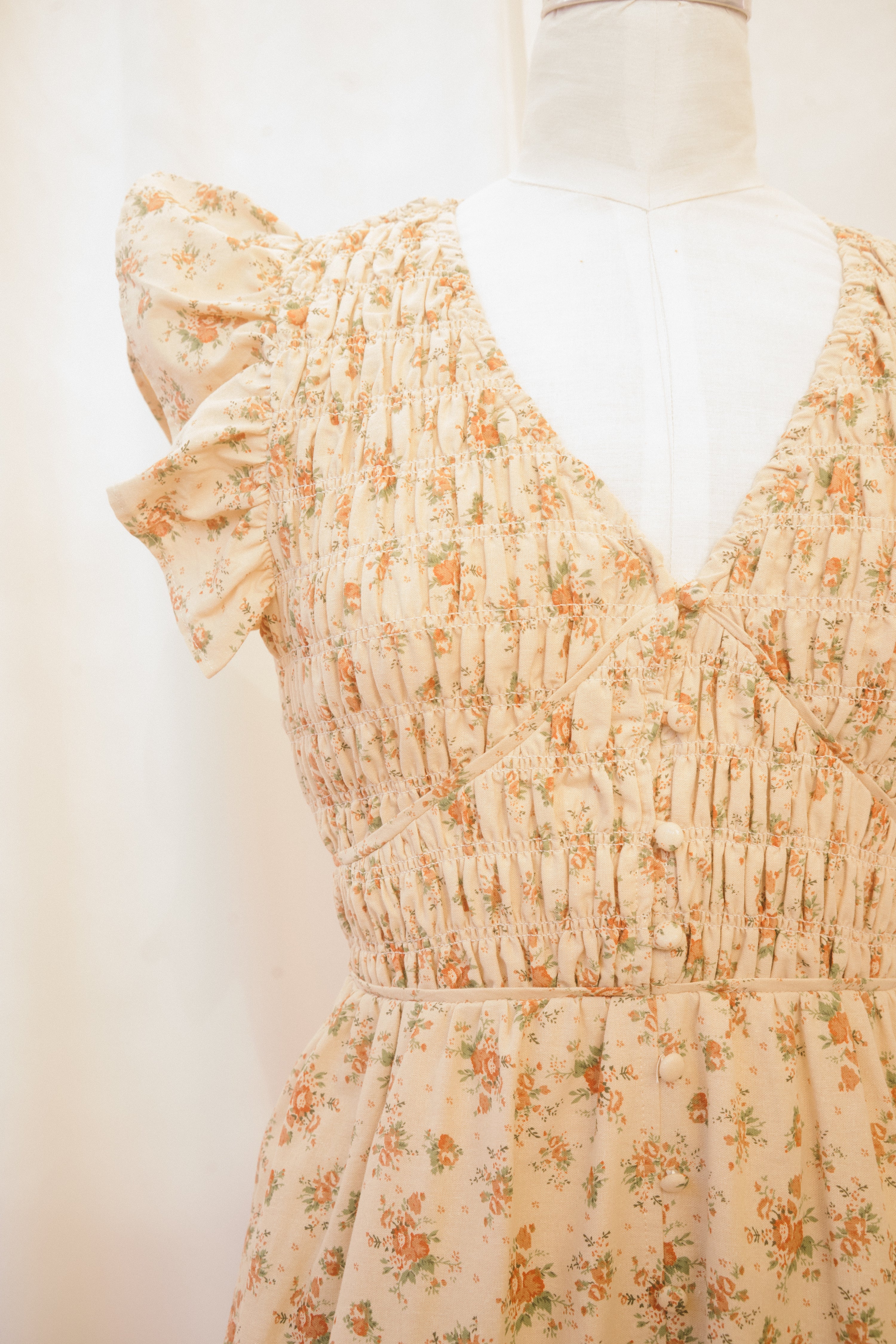 The Maddalena dress is as flirty as she is versatile. This darling v-neck mini dress comes in a breezy beige fabric speckled with a vintage rust and green floral print. The flutter cap-sleeves flare out from the fully-smocked bodice, which is extremely stretchy and features a central row of functional hook and eye buttons. Decorative (non-functional) buttons continue down the front of the skirt to the bottom hem, which is finished with a flouncy ruffle. The skirt features hidden pockets, perfect for your hiding your bits and bobs.