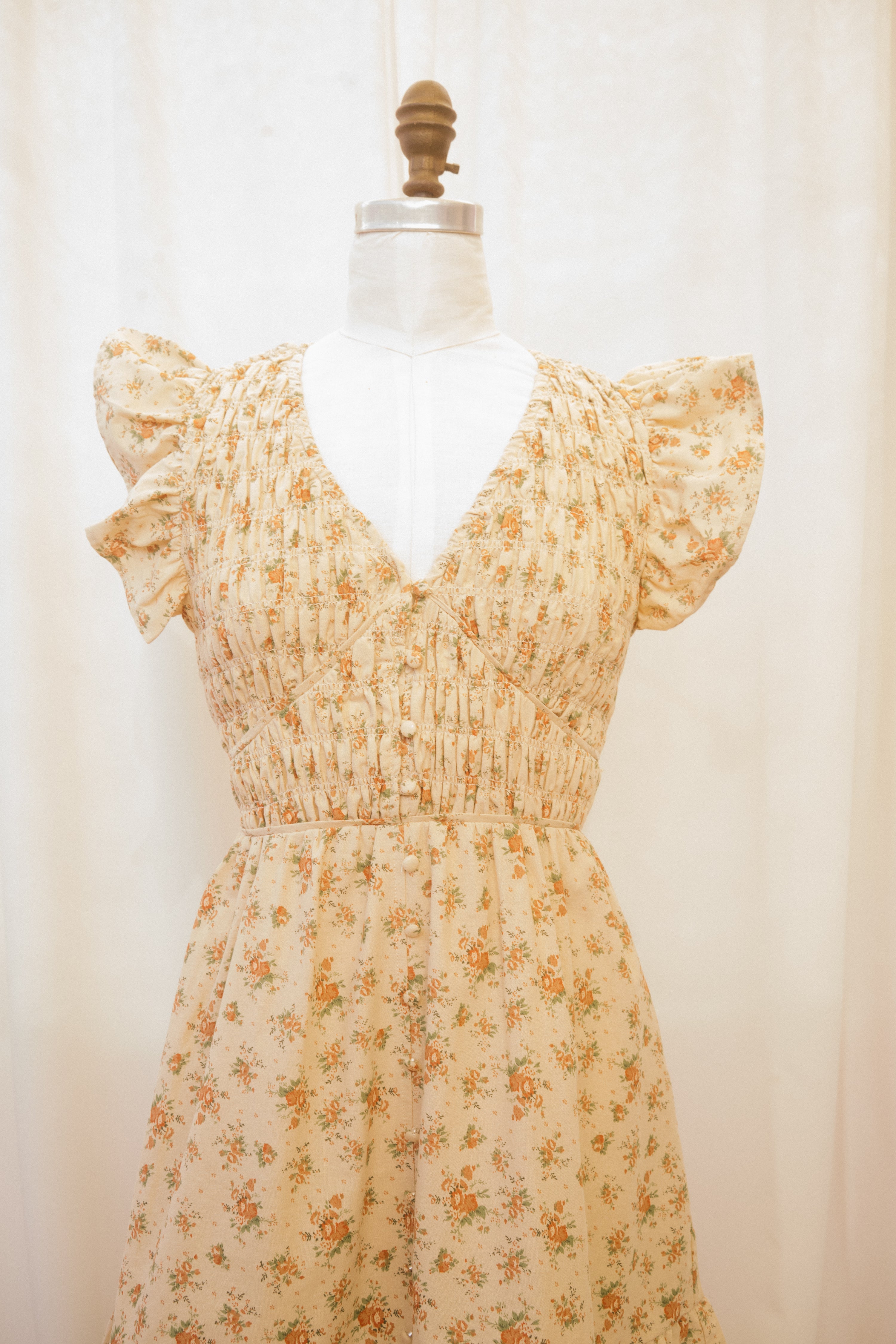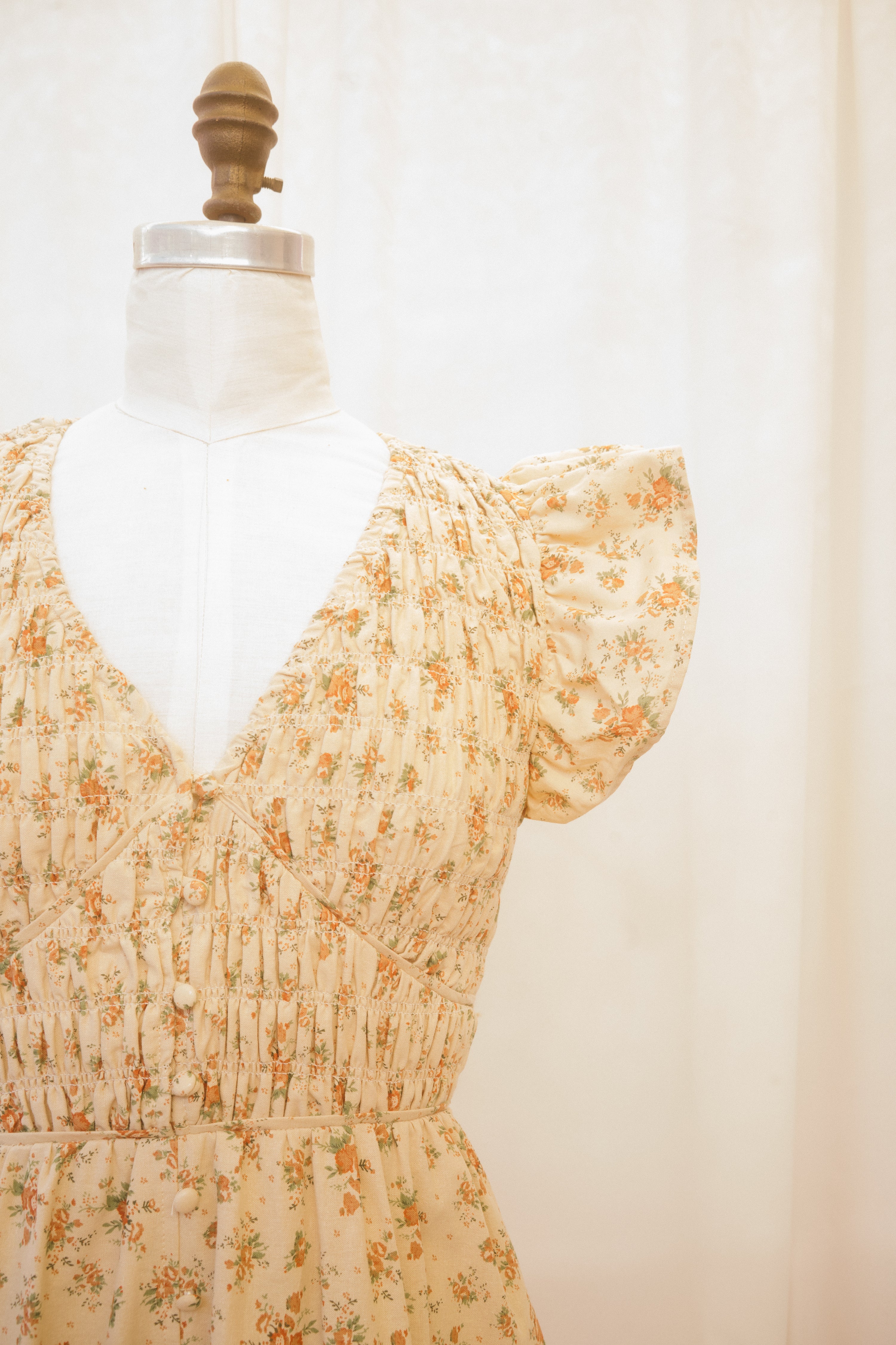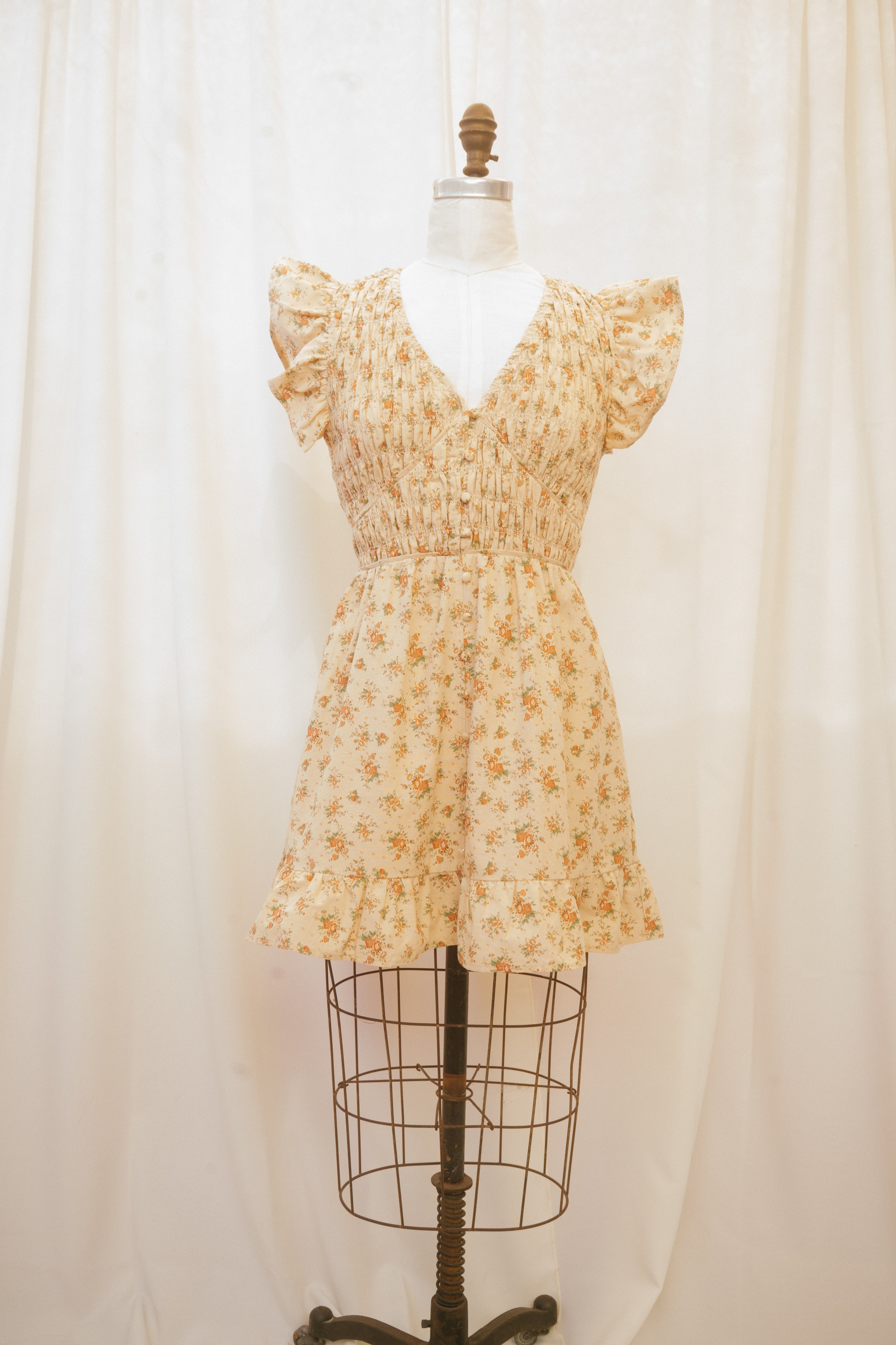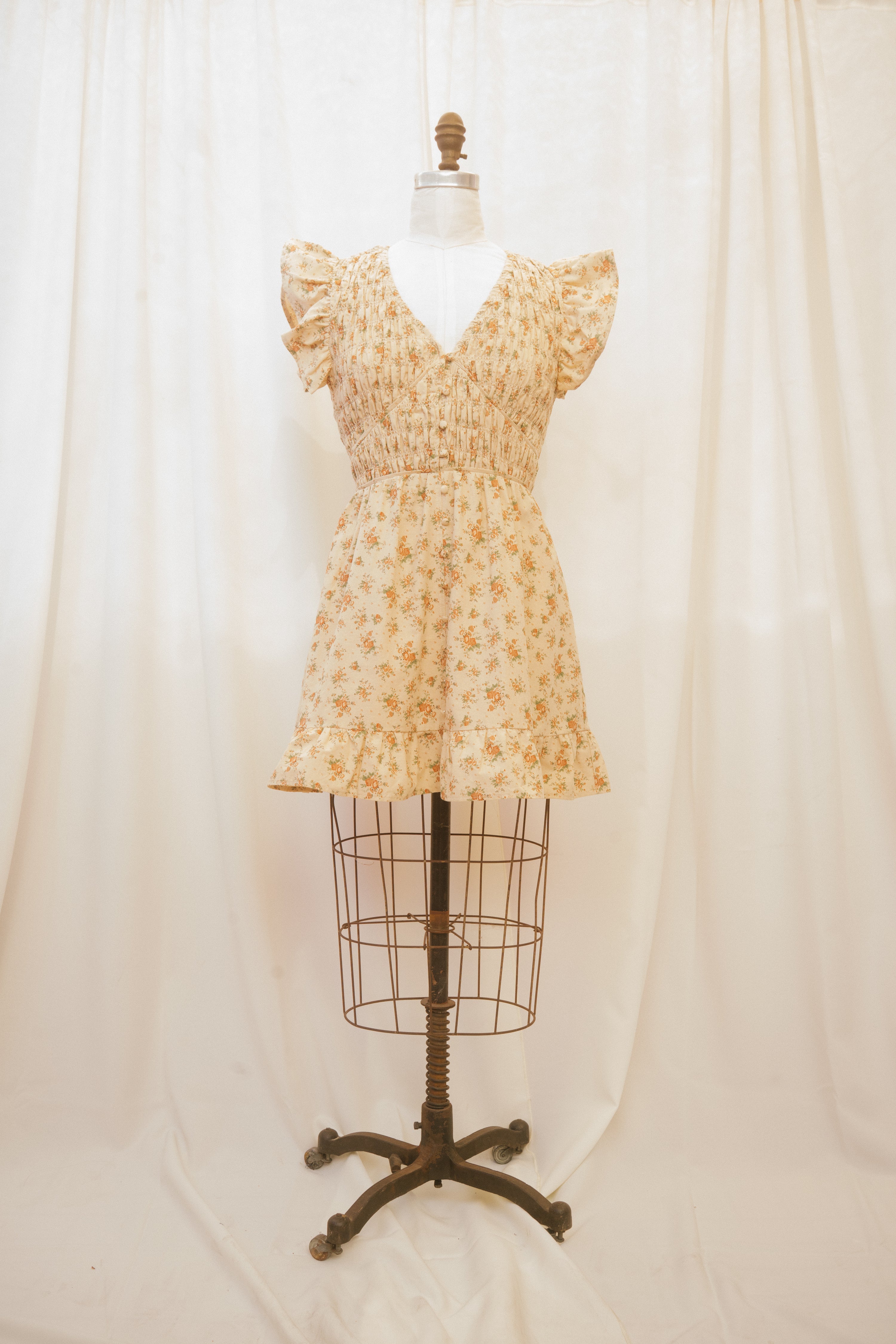 The Maddalena dress is as flirty as she is versatile. This darling v-neck mini dress comes in a breezy beige fabric speckled with a vintage rust and green floral print. The flutter cap-sleeves flare out from the fully-smocked bodice, which is extremely stretchy and features a central row of functional hook and eye buttons. Decorative (non-functional) buttons continue down the front of the skirt to the bottom hem, which is finished with a flouncy ruffle. The skirt features hidden pockets, perfect for your hiding your bits and bobs.