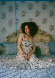 An everyday tea dress, the Marcelia Dress comes in a cream hue and is scattered in a muted pastel blue ditsy floral print. This midi sundress has an empire waistline with a fully smocked front and back of the bust. It has a square neckline with exaggerated ruffle detailing along the neckline and adjustable buckled straps. The bodice is decorated in a horizontal blue striped print and has fabric gathering along the waistline with a pretty, oversized tiered midi length skirt.
