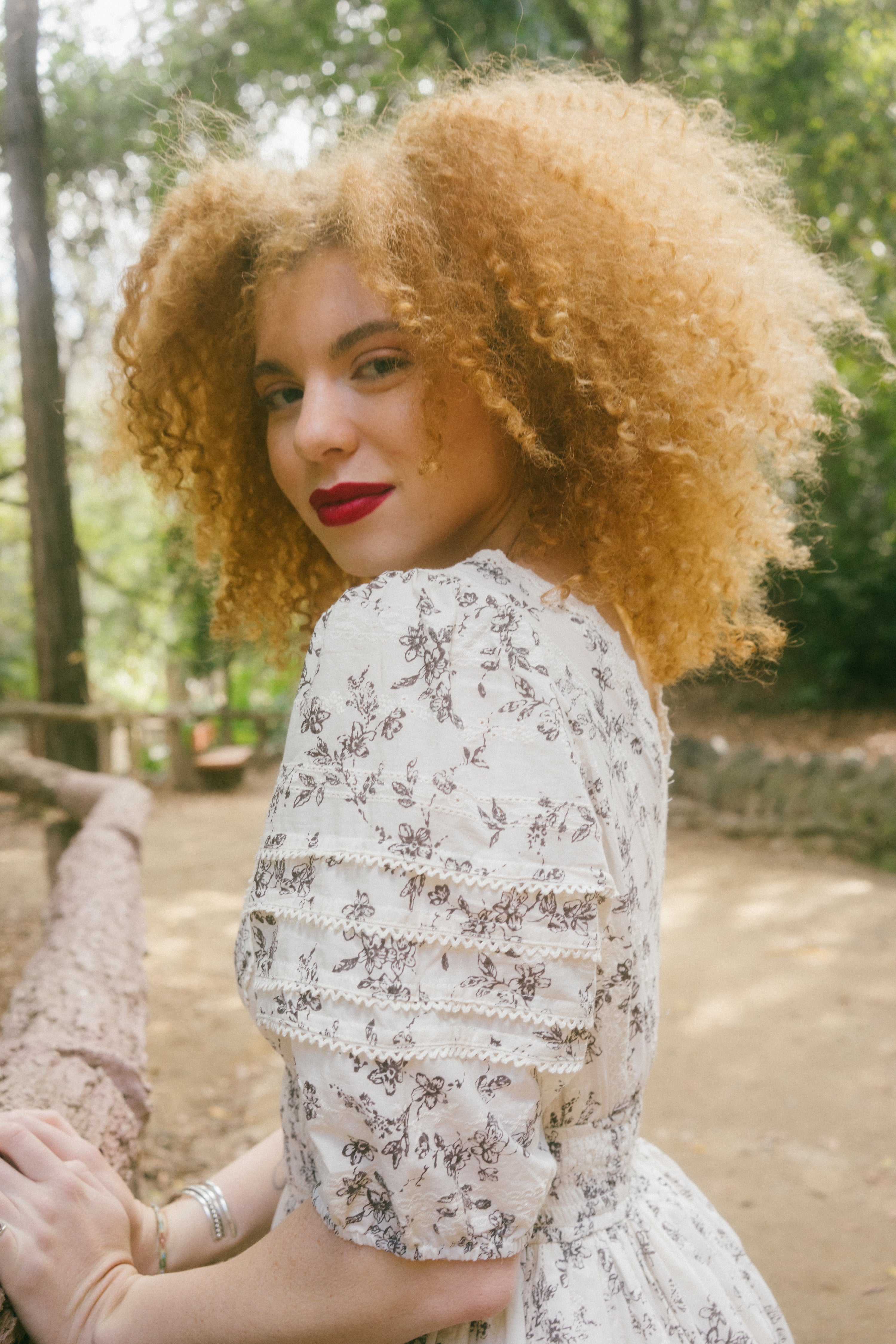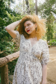 A sweet, simple waredrobe staple, the Naha Dress comes in a cream hue and is covered in a darling soft brown floral print. This midi dress has quarter length puff sleeves with a v-neckline and raised empire waistline. This piece is decorated in cream lace detailing along the neckline and has pretty horizontal pleated details along the bust and sleeves. It has a fully smocked waistline with fabric gathering along it that creates a very romantic and flowly fulled lined midi length skirt. Style with spring slides, a dash of lipstick and a tote bag for a casual and romantic springtime look.