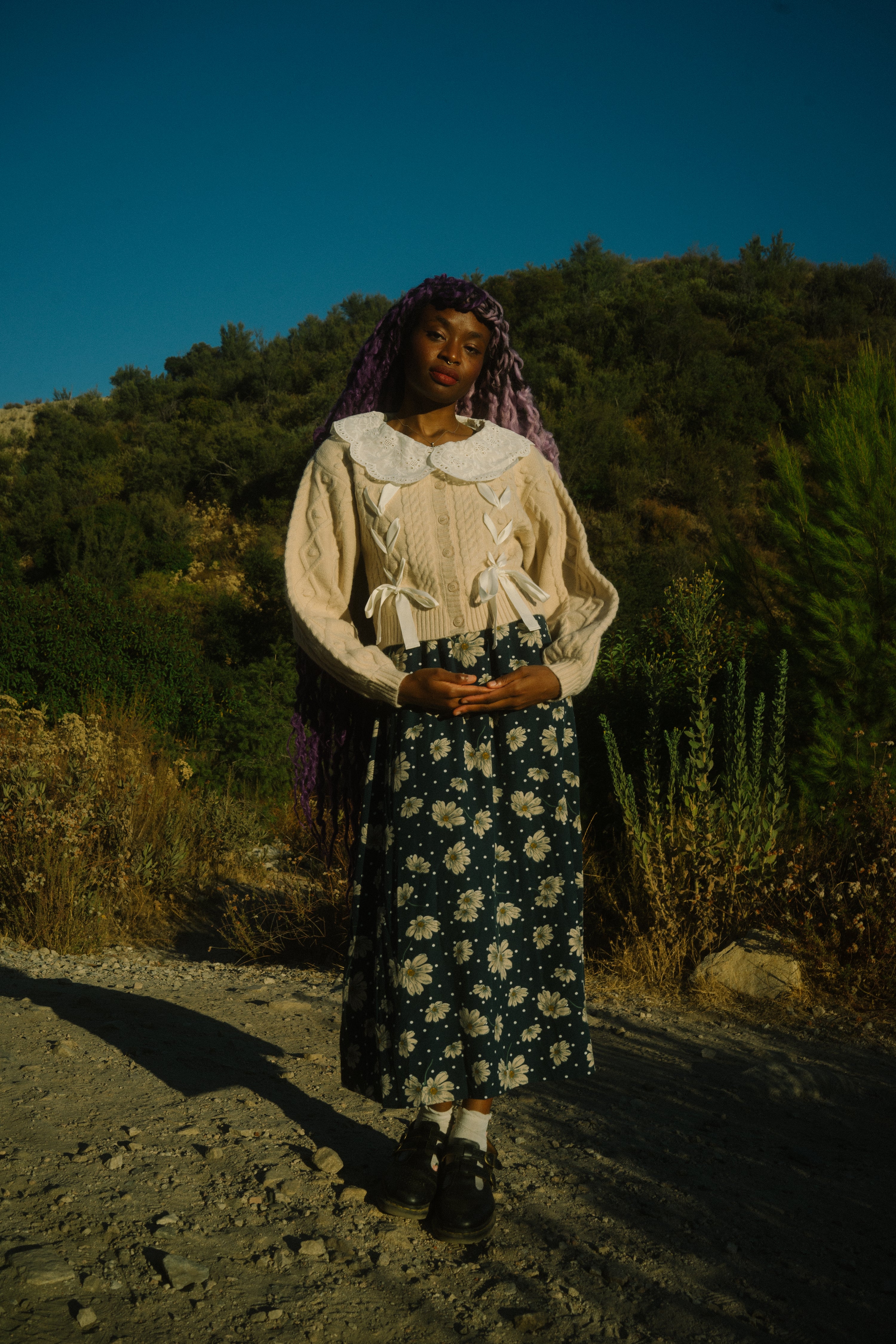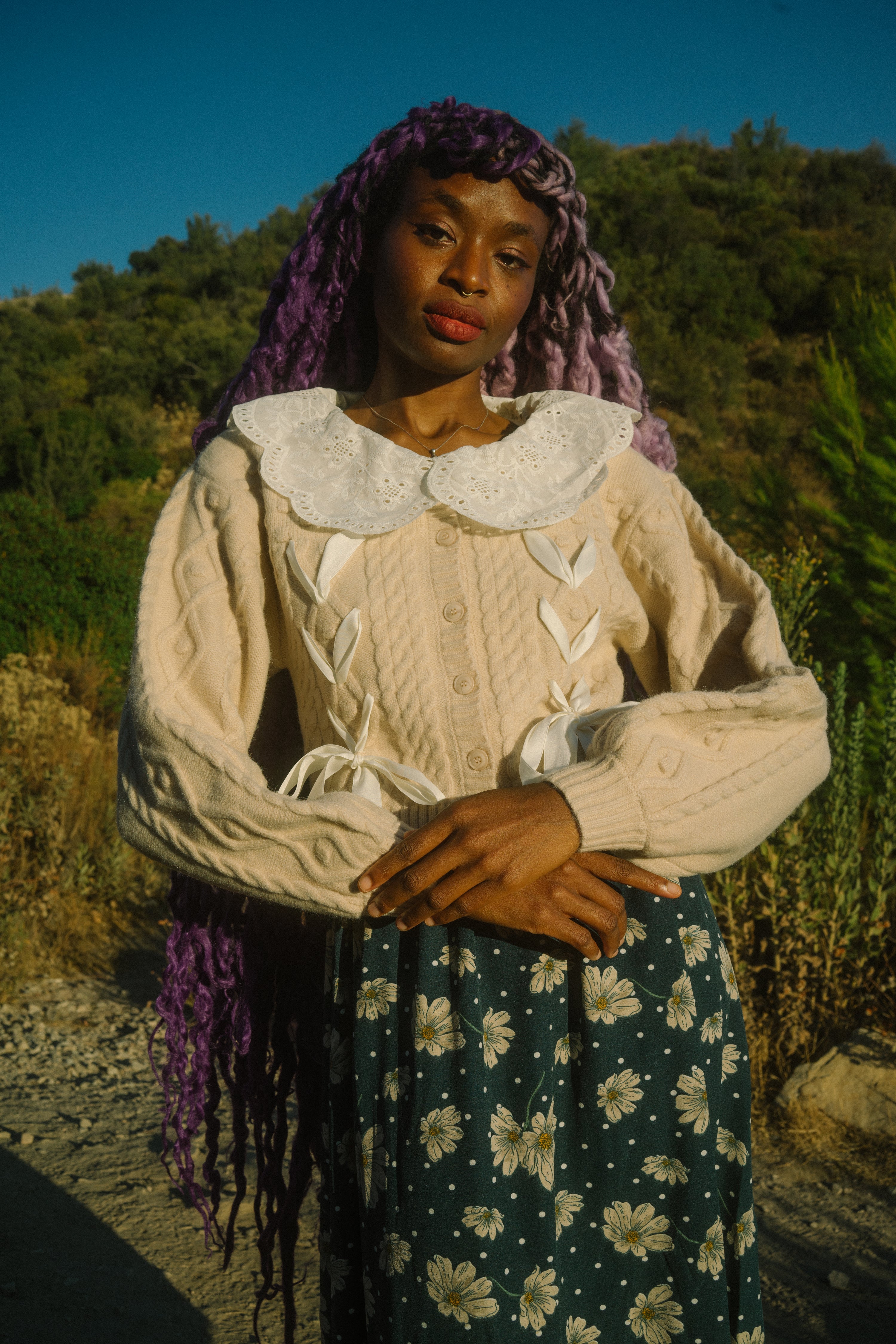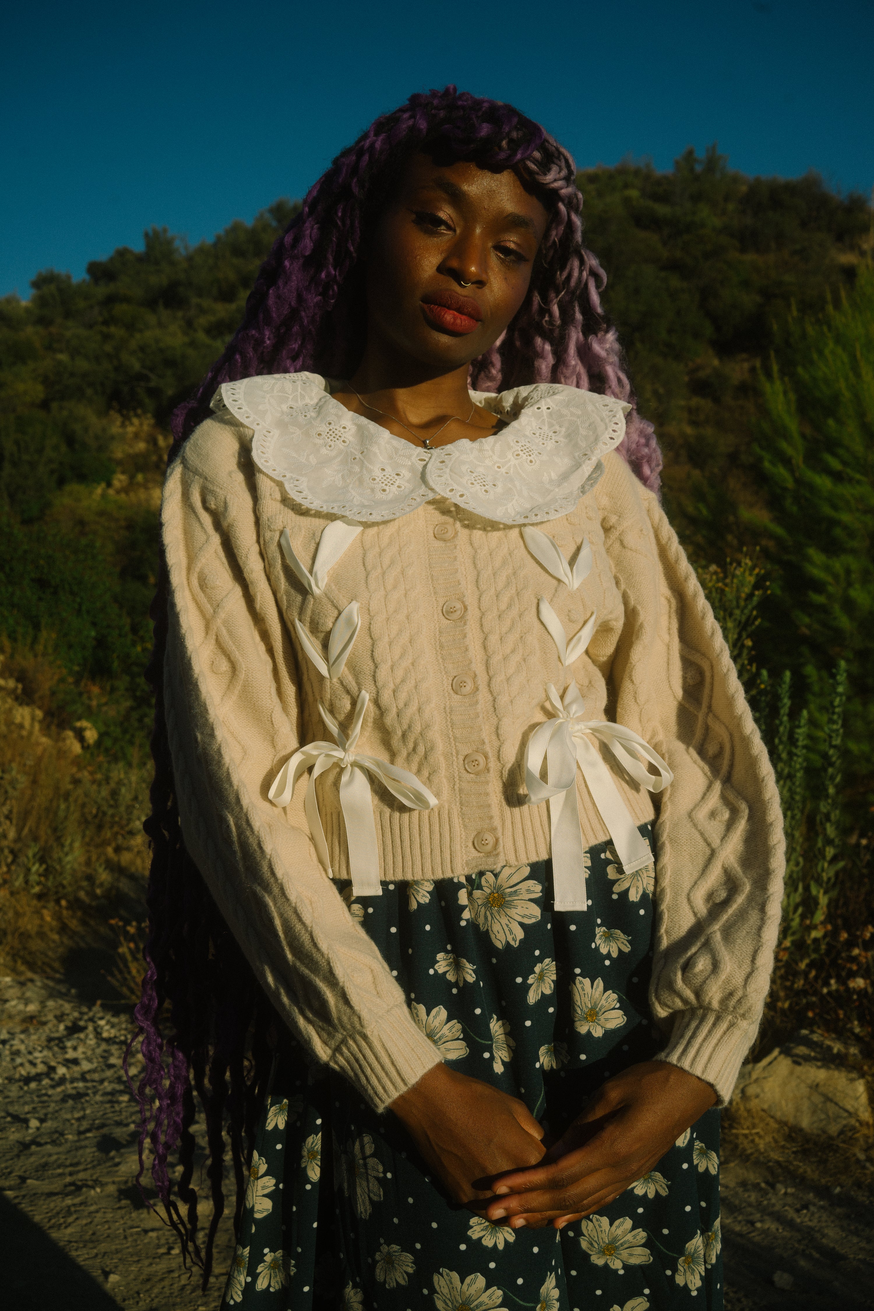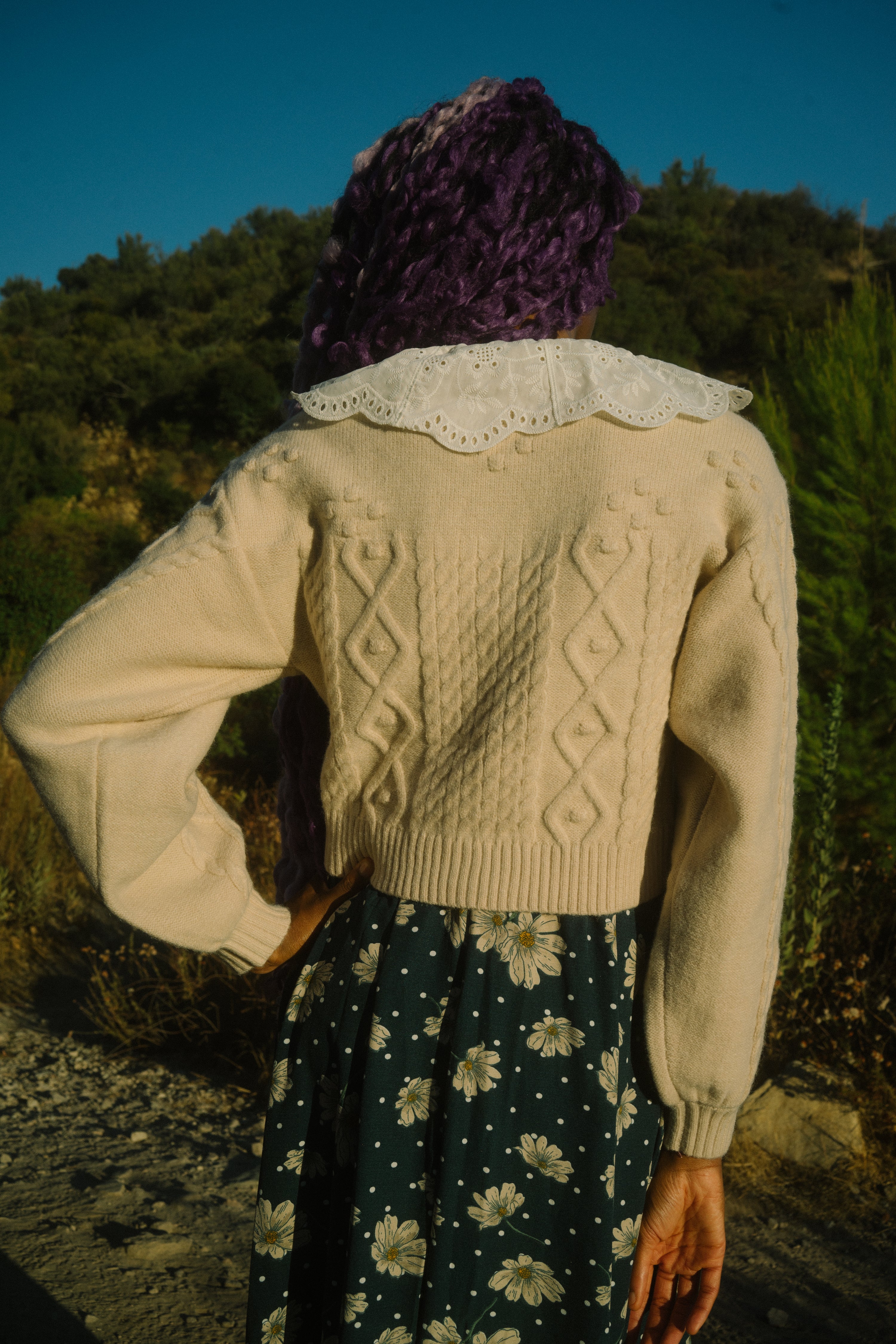 If you're a fan of bows and eyelet then the Naomi Cardigan is for you! In a buttercream hue, this semi-cropped cardigan has long sleeves with a cable knit design. The piece has functional buttons along the center of the silhouette, with an oversized off-white eyelet peter pan collar. Finished off with a darling lace up bow design on both sides of the cardigan, the piece has two oversized bows in the center. Style with your favorite floral dress, vintage slides and a dash of lipstick.