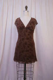 The Quinzie is the cool older sister of our popular Julee midi-dress. This dusty brown mesh mini-dress is adorned with chocolate brown velvet florals, and the v-neckline and under-bust are finished with deep brown velvet ribbon that ties in the center. The darling stretch mesh cap sleeves and bottom of the skirt are both finished in a lettuce hem. Stretchy fabric throughout ensures a custom fit that will keep you comfy for the opener, headliner, and concert afterparty.