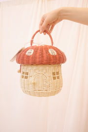 This rattan mushroom basket was handmade with sustainably sourced, lightweight materials. Designed to mimic a fairy's fanciful garden home, this woven basket features a top handle, paned "windows," and a tiny door that actually opens! The functional mushroom top hinges open to safely house trinkets and treasures.