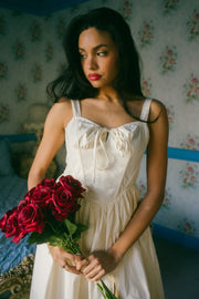 A classic dress you'll find yourself grativating towards for any and all occassions, the Regina Dress is an Astrior staple. In a solid soft cream hue, this midi sundress has adjustable buckled straps, a raised vintage inspired basque waistline with vertical corset boning along the bodice. The piece has fabric gathering along the bust with an adjustable strap along the neckline that ties together into an oversized bow in the center of the bust. This timeless beauty has a semi smocked backside with fabric gathering along the waistline and a fully lined midi / maxi length skirt. Style with just about anything, this dress is the perfect winter to spring transition piece.