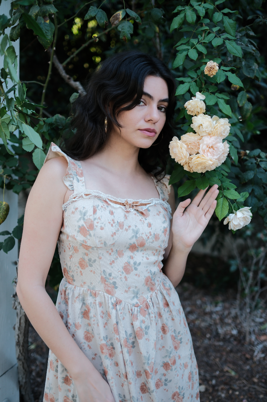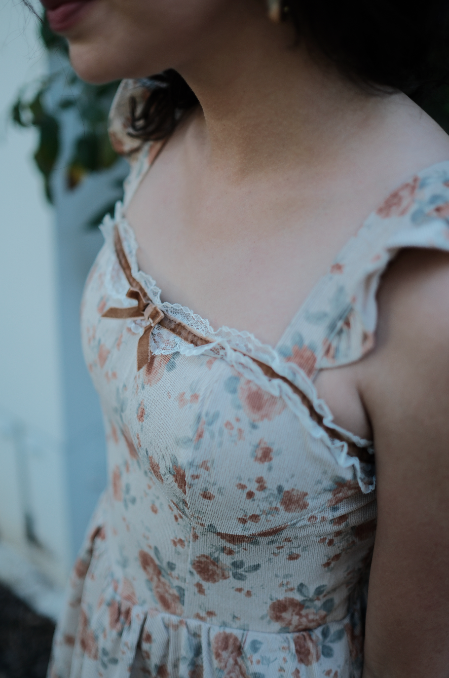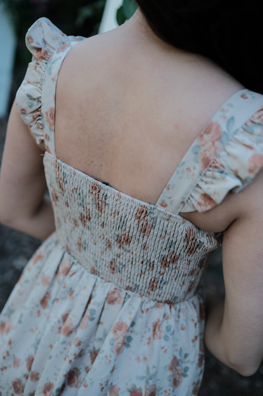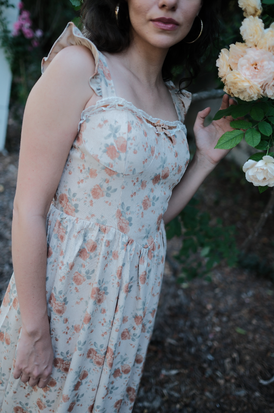 A fall dream, the Rory Dress comes in a pretty tan hue and is scattered in a muted orange, soft green and cream oversized rosy floral print. This midi sundress has a raised basque waistline with a square neckline and straps for sleeves with exaggerated ruffle detailing. This piece has built in padding for the bra, with a fully smocked backside, creating an extra roomy and comfortable fit. It has exaggerated lace detailing along the neckline with a romantic brown lace bow threaded throughout. Finished off with fabric gathering detail along the waist, creating an extra flowly and feminine midi length skirt, this is the perfect fall dress for all of your end of the year festivities.