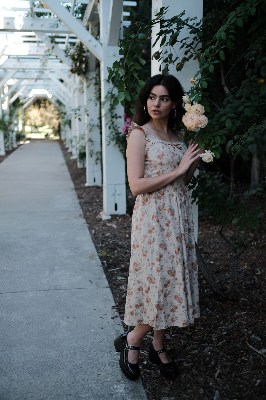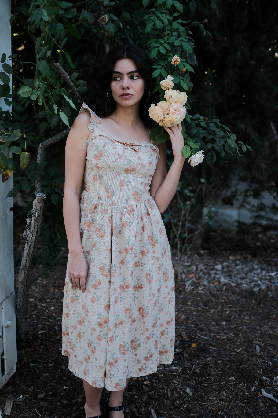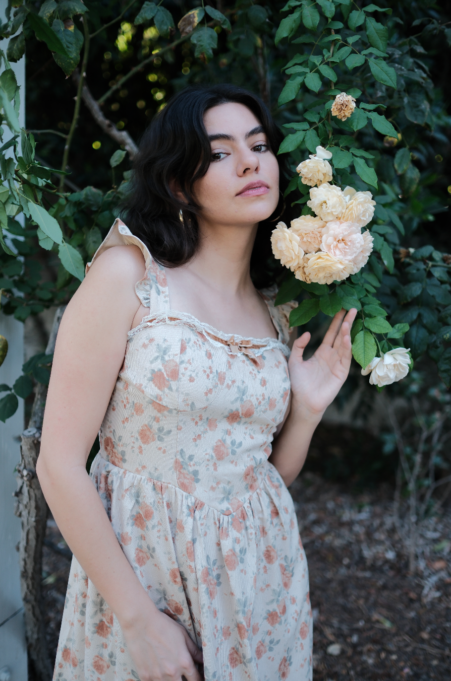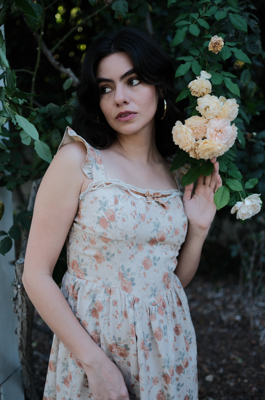 A fall dream, the Rory Dress comes in a pretty tan hue and is scattered in a muted orange, soft green and cream oversized rosy floral print. This midi sundress has a raised basque waistline with a square neckline and straps for sleeves with exaggerated ruffle detailing. This piece has built in padding for the bra, with a fully smocked backside, creating an extra roomy and comfortable fit. It has exaggerated lace detailing along the neckline with a romantic brown lace bow threaded throughout. Finished off with fabric gathering detail along the waist, creating an extra flowly and feminine midi length skirt, this is the perfect fall dress for all of your end of the year festivities.