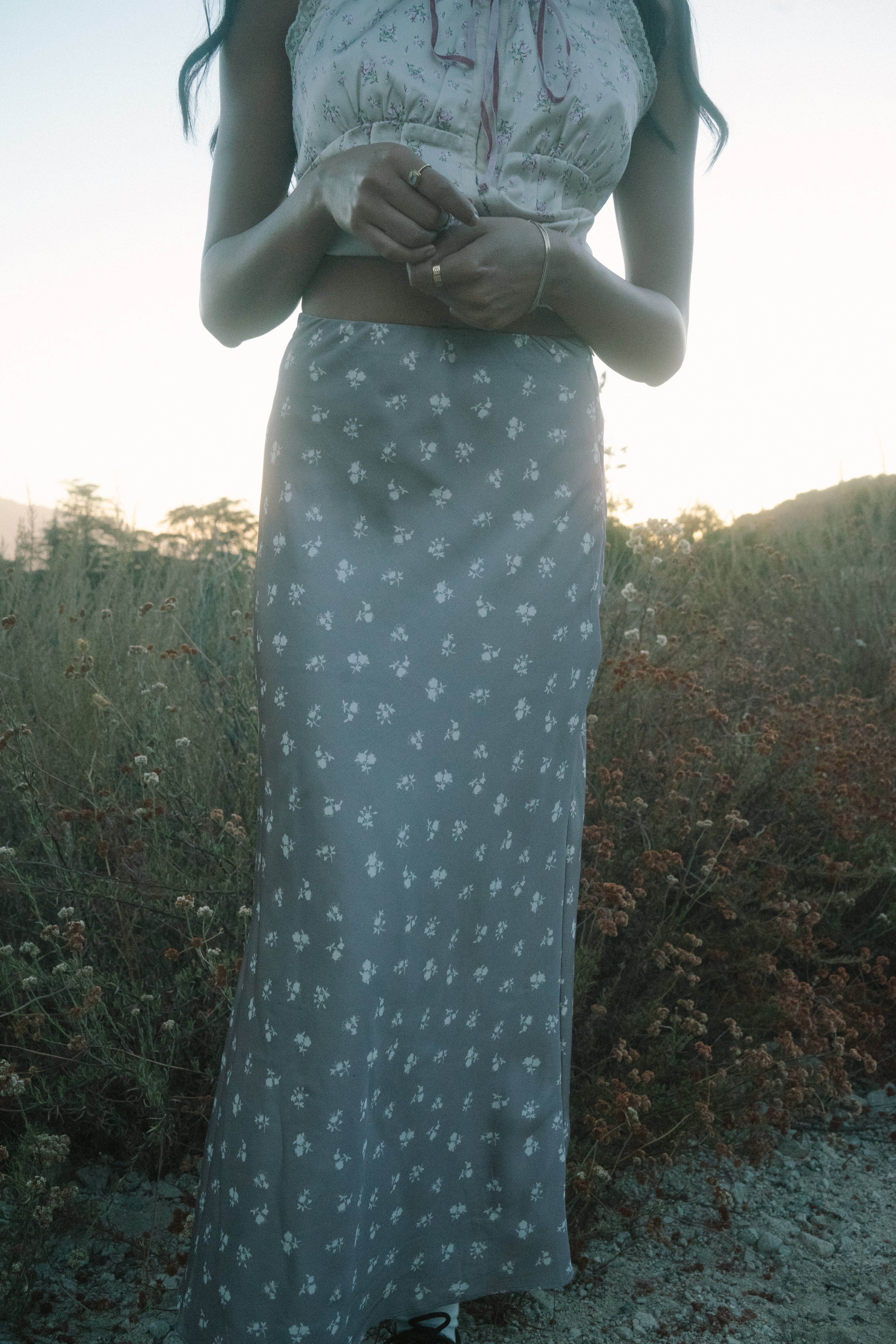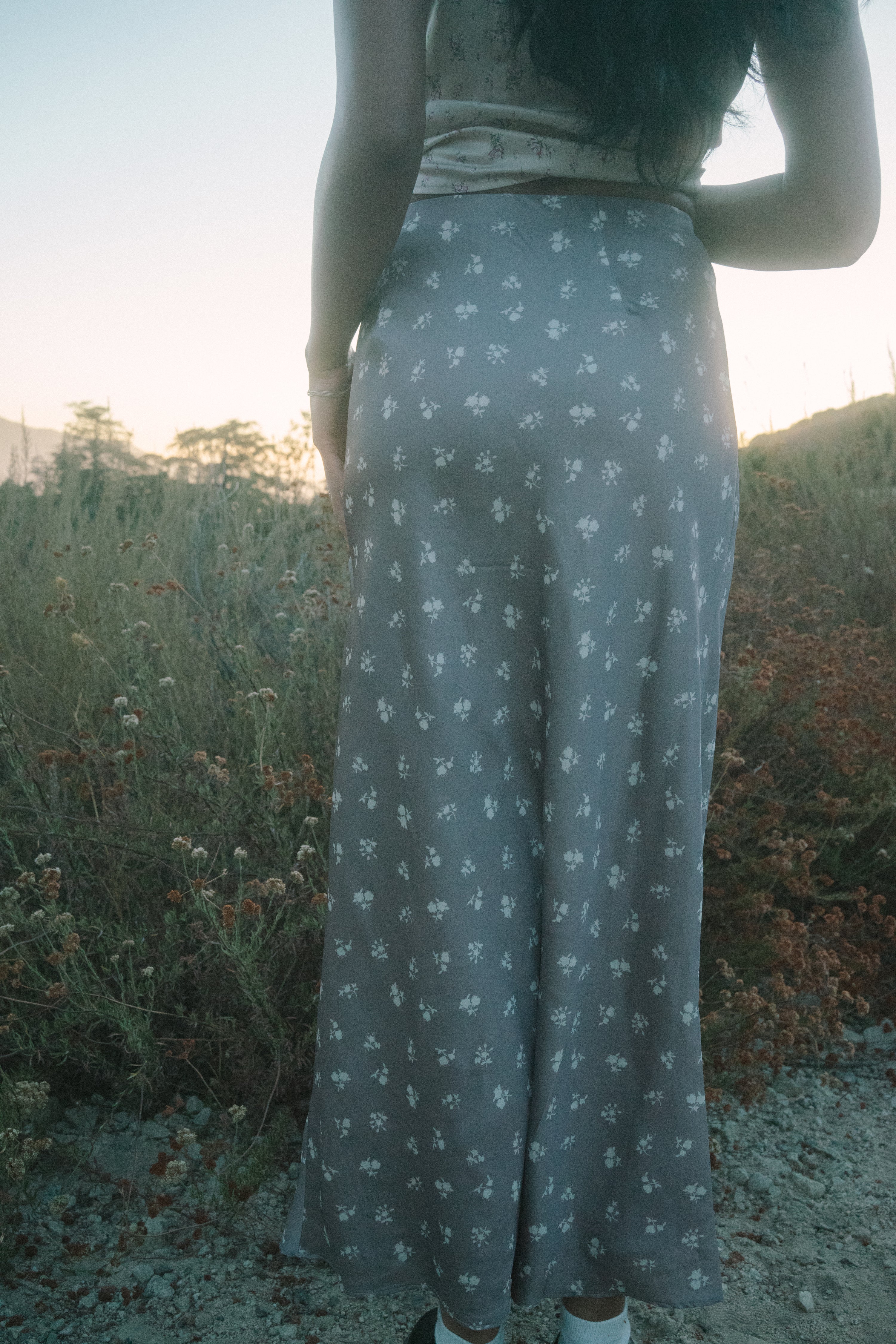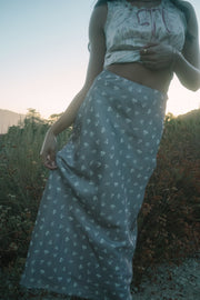 The slip skirt of your dreams, the Shelby Skirt comes in a navy grey hue and is covered in a white ditsy floral print. This midi skirt has a high waist, straight fitting midi length skirt and is fully lined. Style with your favorite blouse, slides and an oversized basket bag for the most romantic and easy to wear fall outfit.