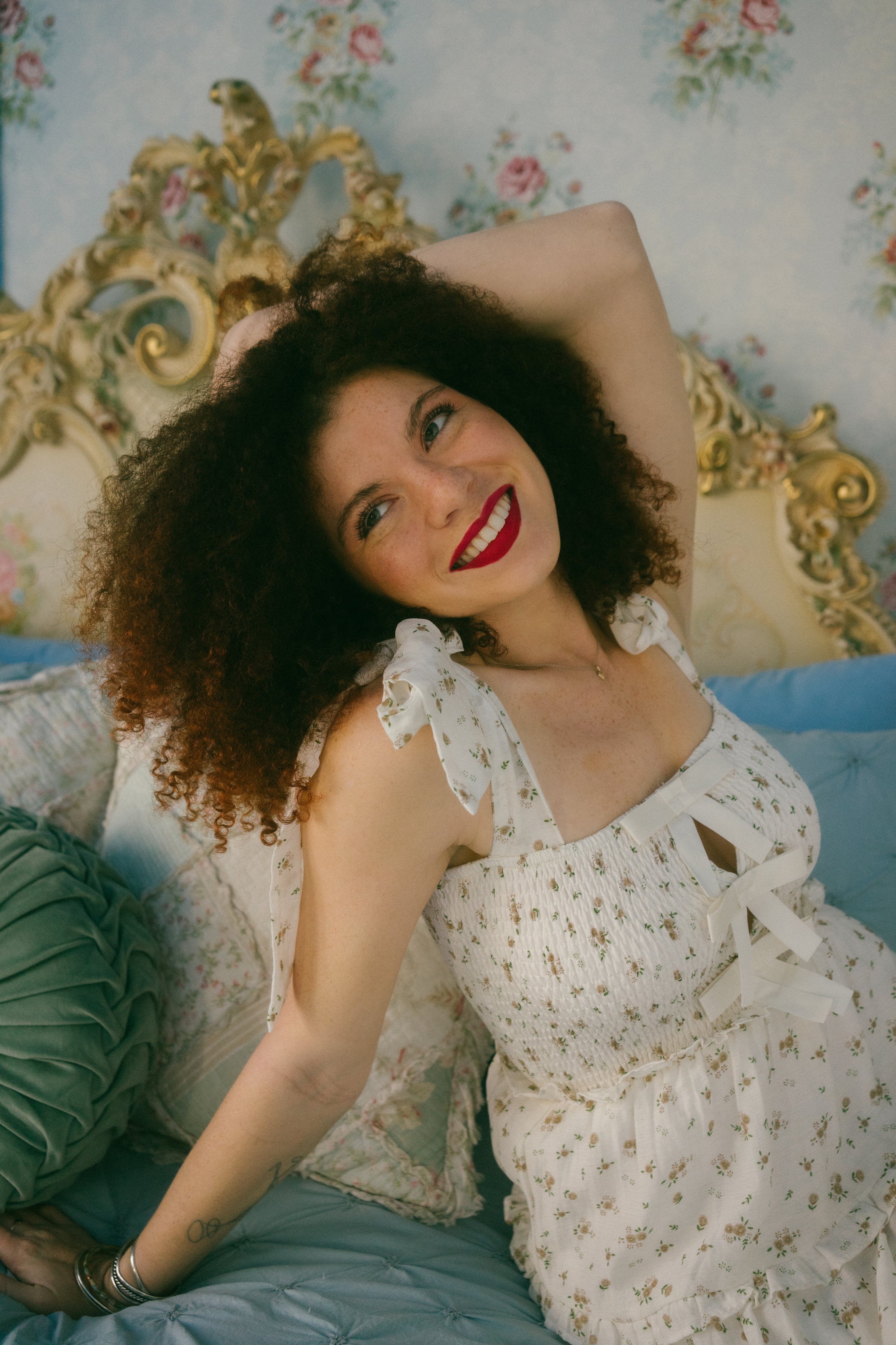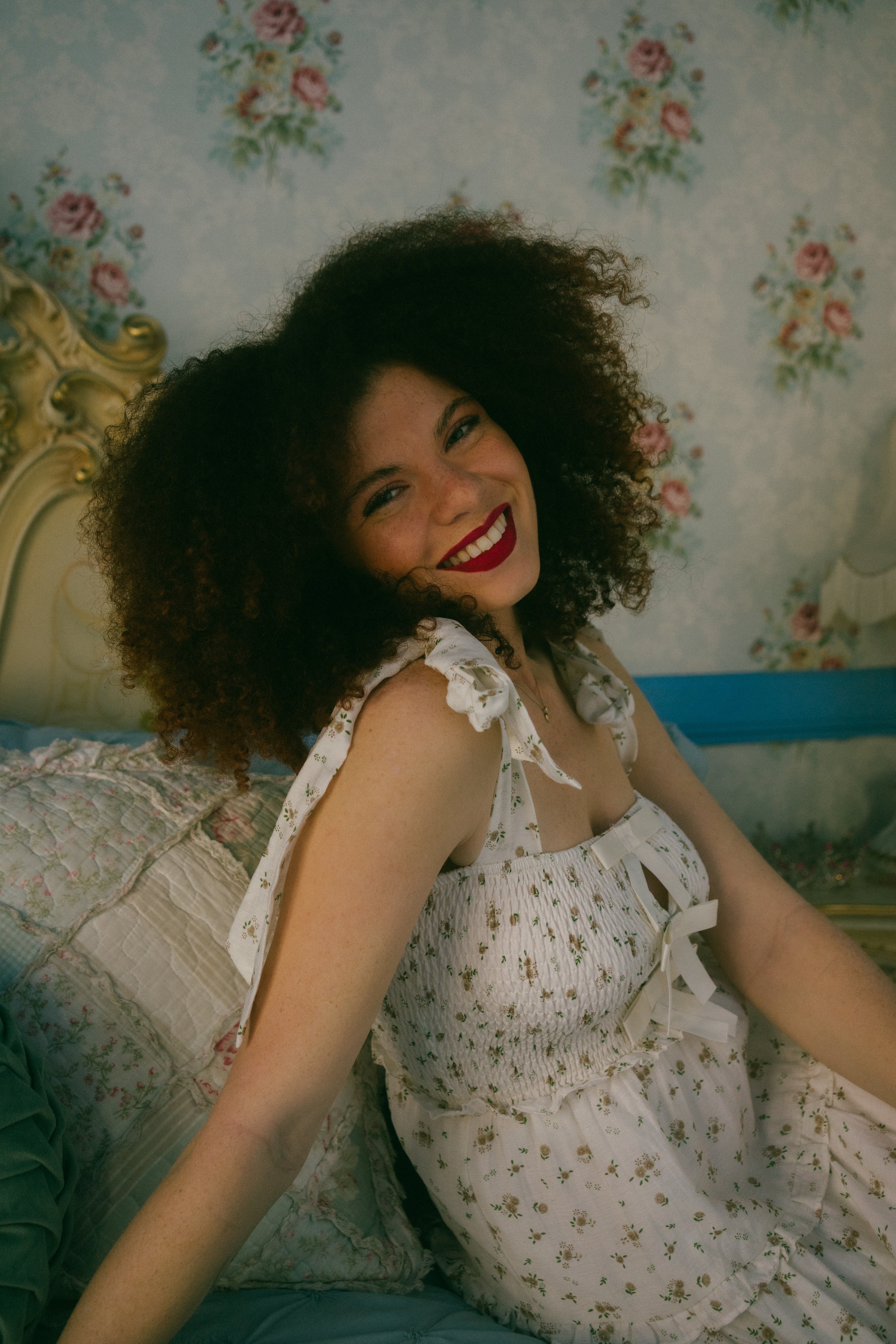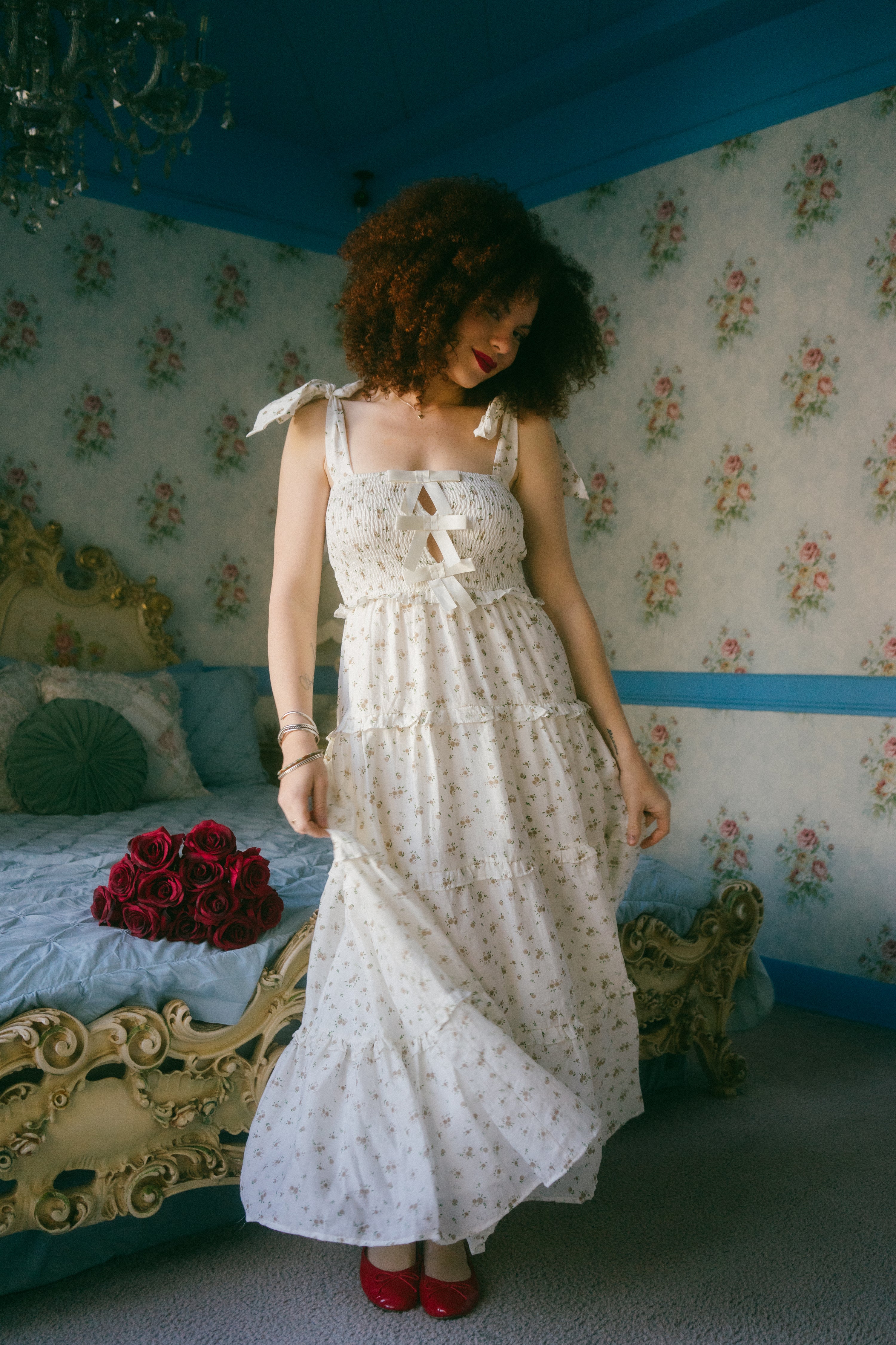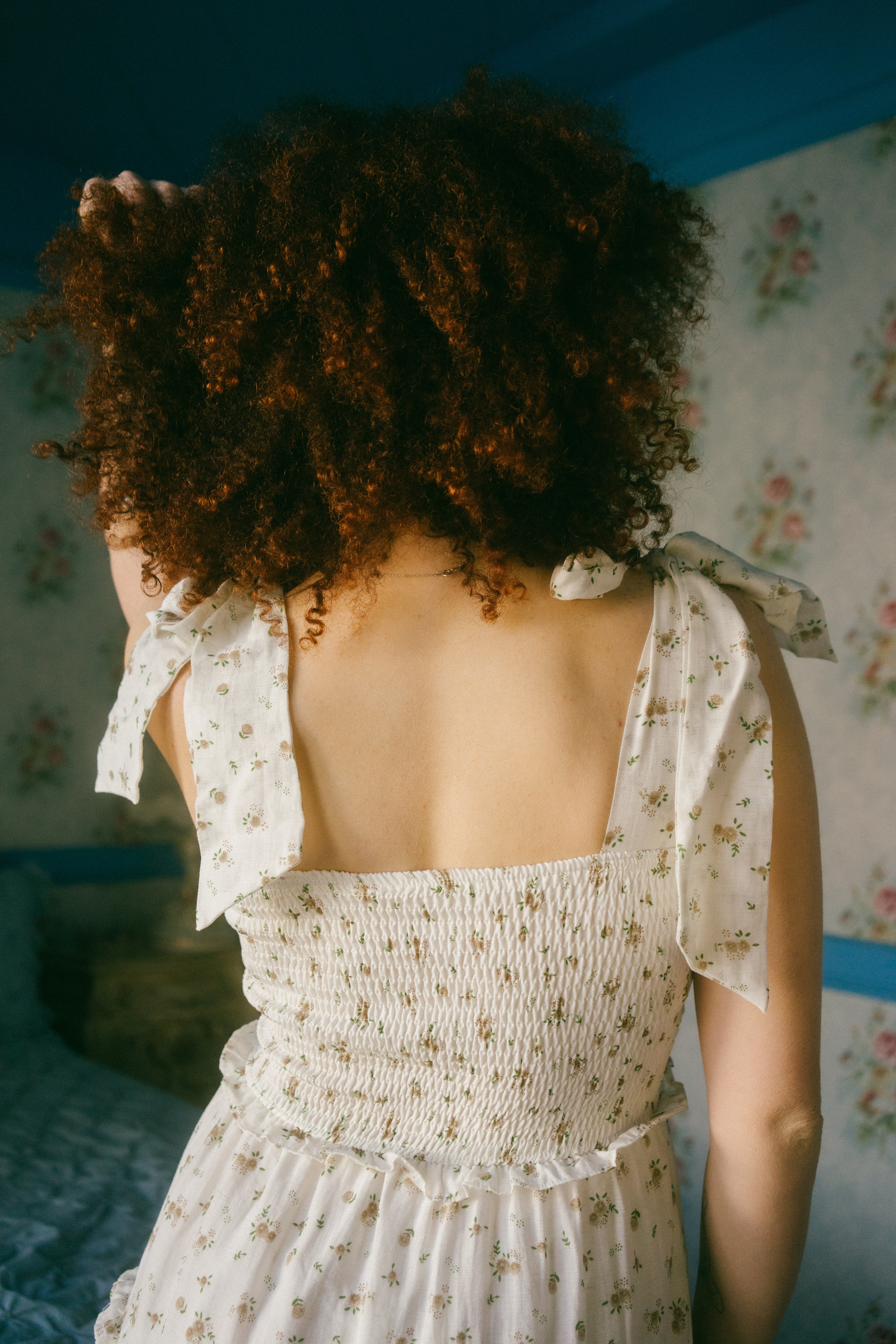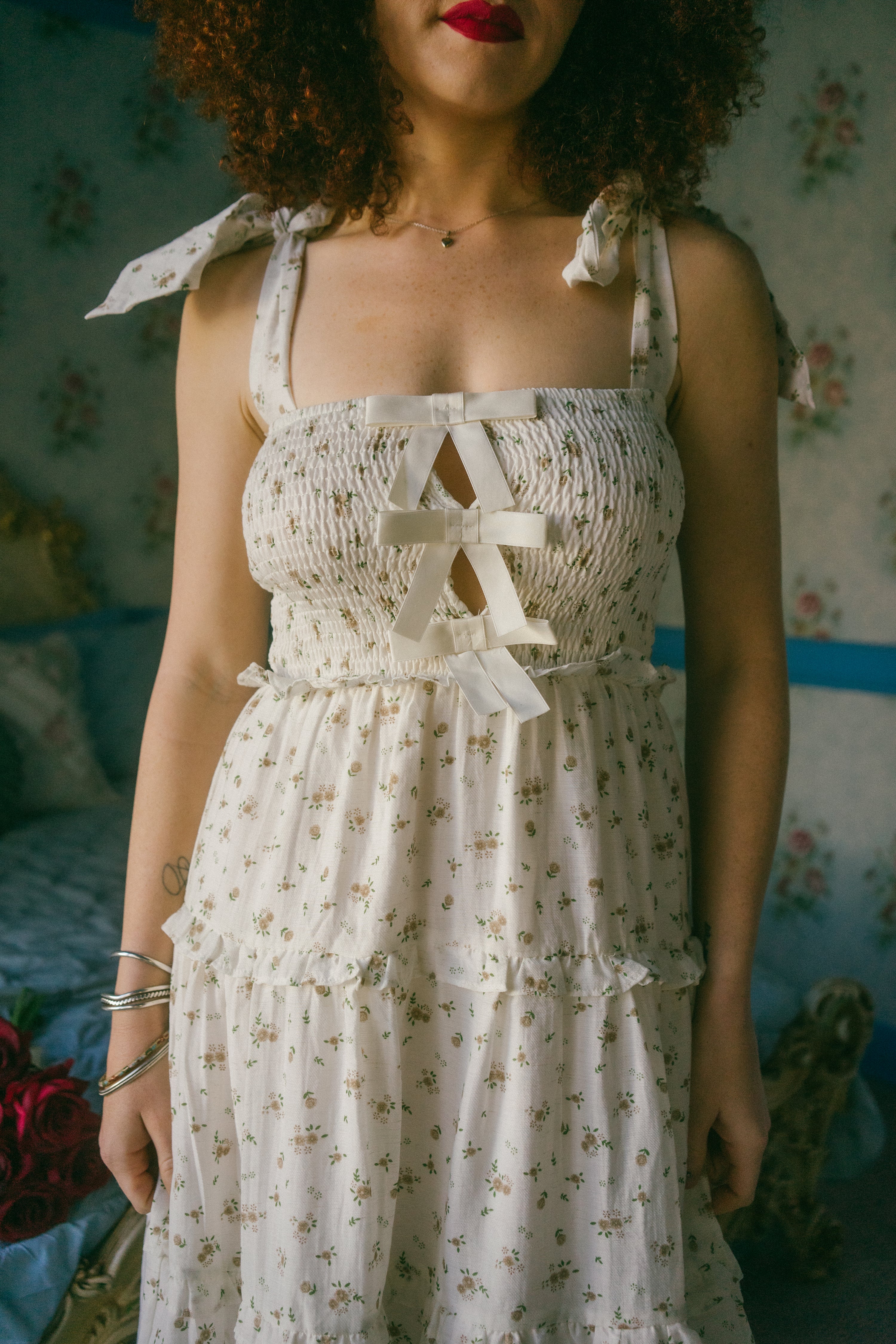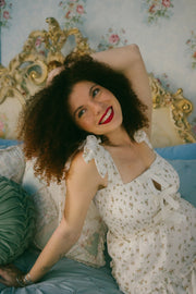 A sweet winter to spring transition piece, the Stefania Dress comes in a dreamy off-white hue and is scattered in a soft brown / cream and sage ditsy floral print. This maxi sundress has a square neckline with adjustable ties for straps that tie together in an oversized bow on both shoulders. With an empire waistline, it has a fully smocked bodice in the front and the back with three oversized vertical bows down the center of the bust with a peek-a-boo design in-between the ties. The piece has a fully lined tiered maxi length skirt with exaggerated ruffle detailing along the waistline and along the tiers. Style with slides, an oversized tote bag and a lightweight cardigan for the perfect seasonal transition piece.