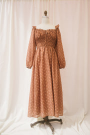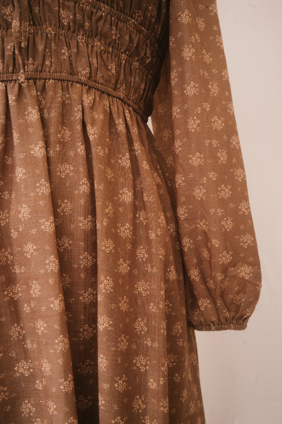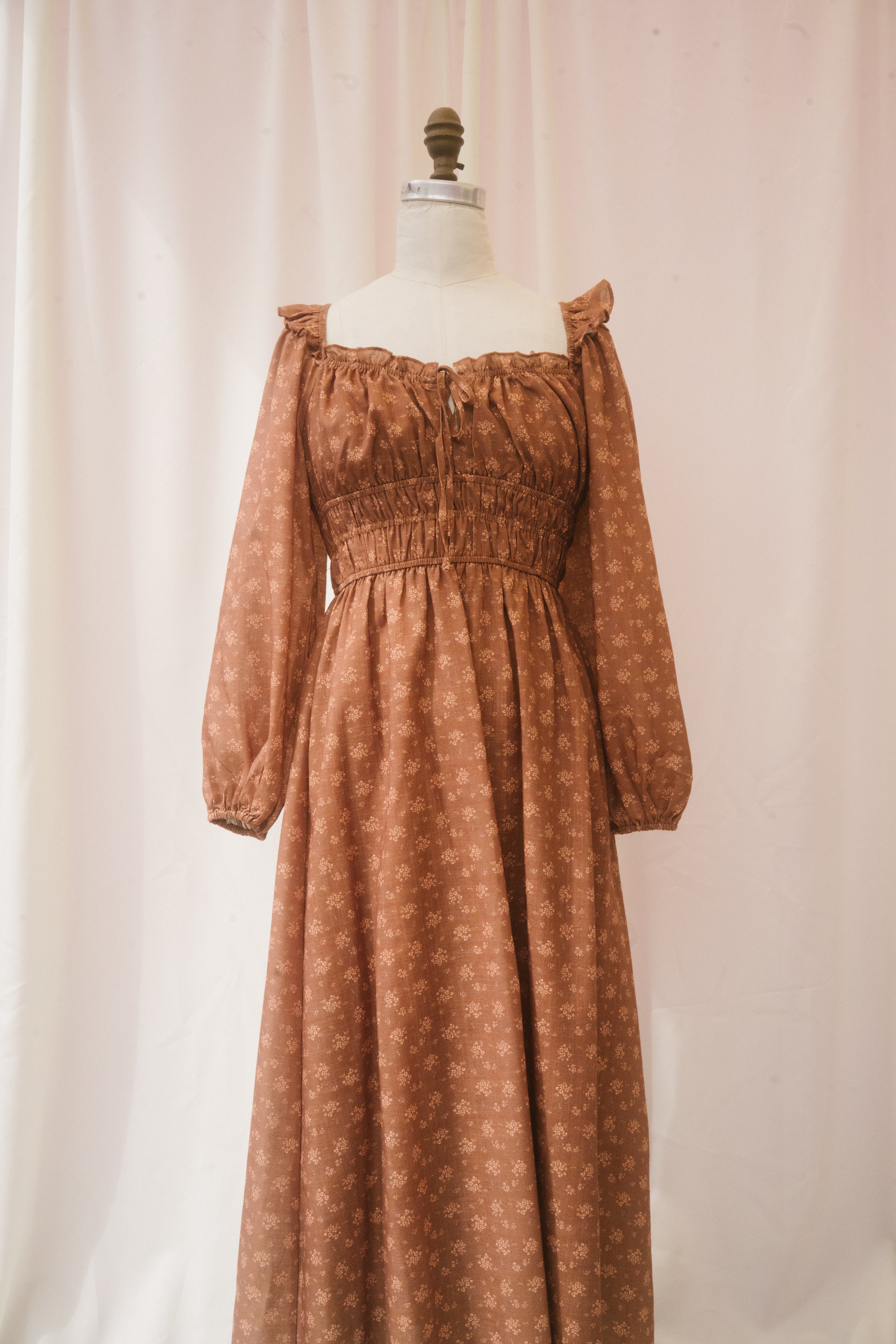 The girl in the Thoreau dress often carries her favorite reading close to her chest. This long sleeve midi dress comes in a brown fabric speckled throughout with dusty peach floral sprays. The ample sleeves are elasticated at the wrist for comfort and fit, featuring a delicate ruffle trim at the shoulders that echoes the ruffle of the elasticated sweetheart neckline, which joins together with a functional bow at the center bust. Three elastic waist bands just under the bust define the waist without sacrificing comfort. The a-line skirt falls from the natural waist to just above the ankle, perfect for pairing with leather boots this fall.