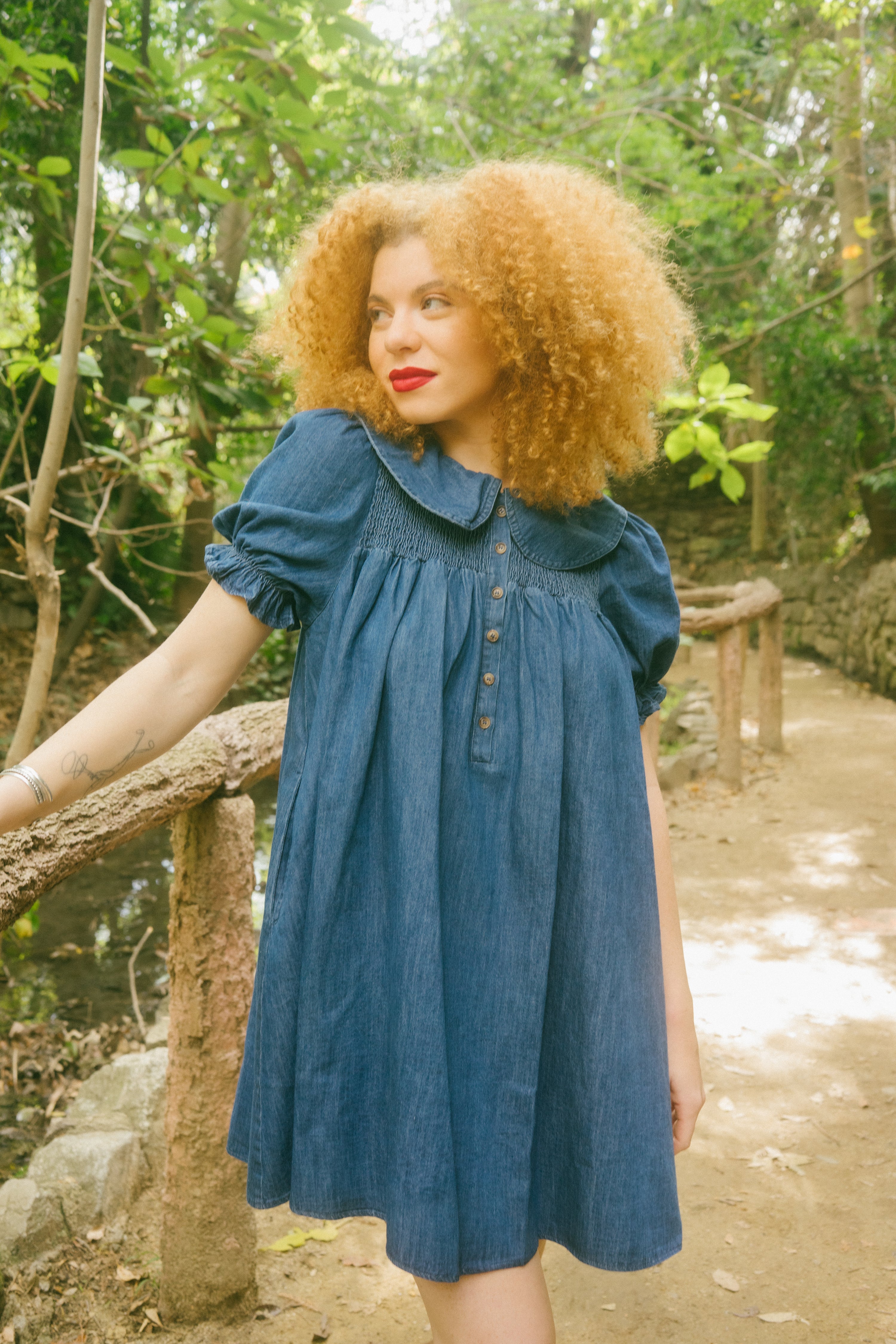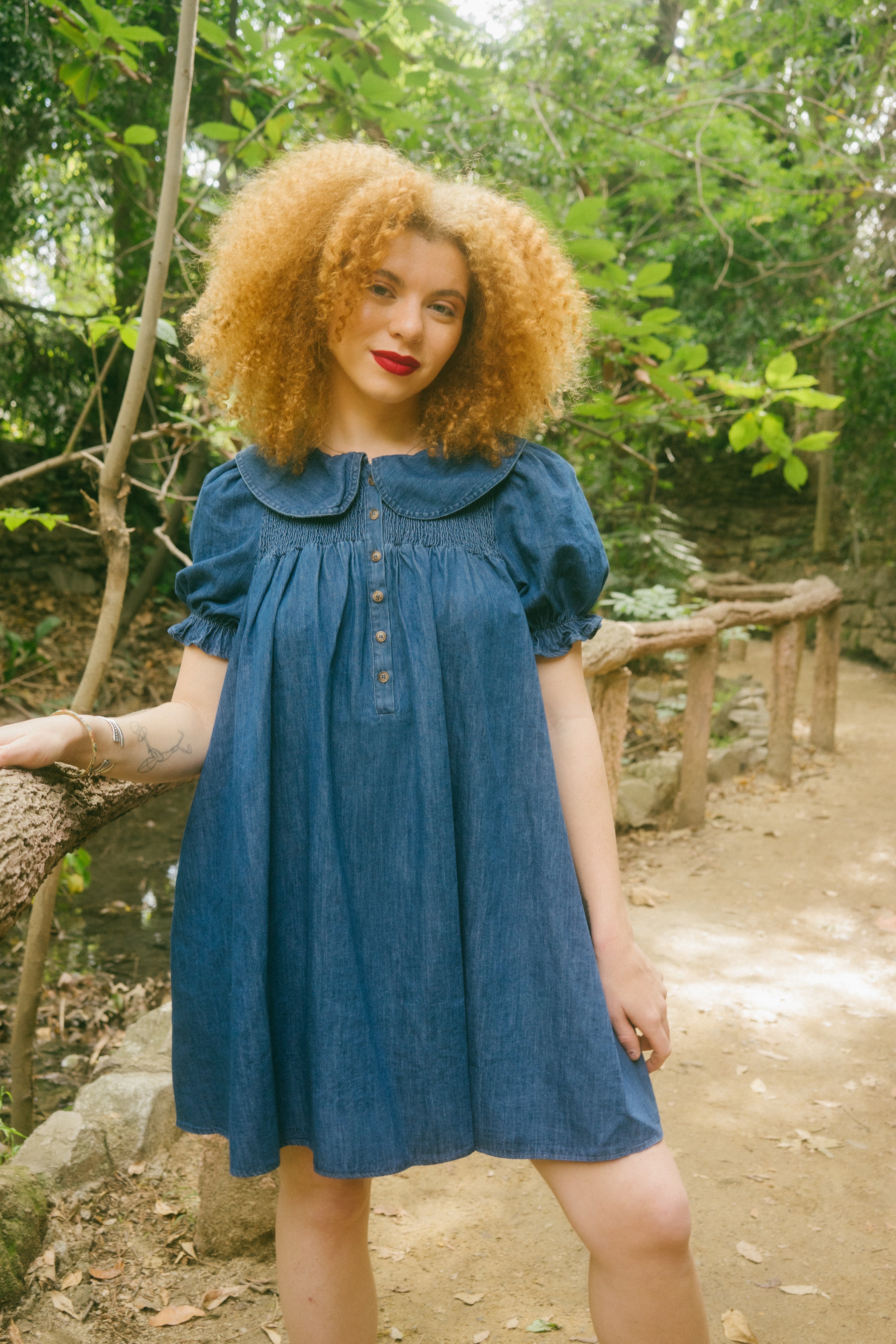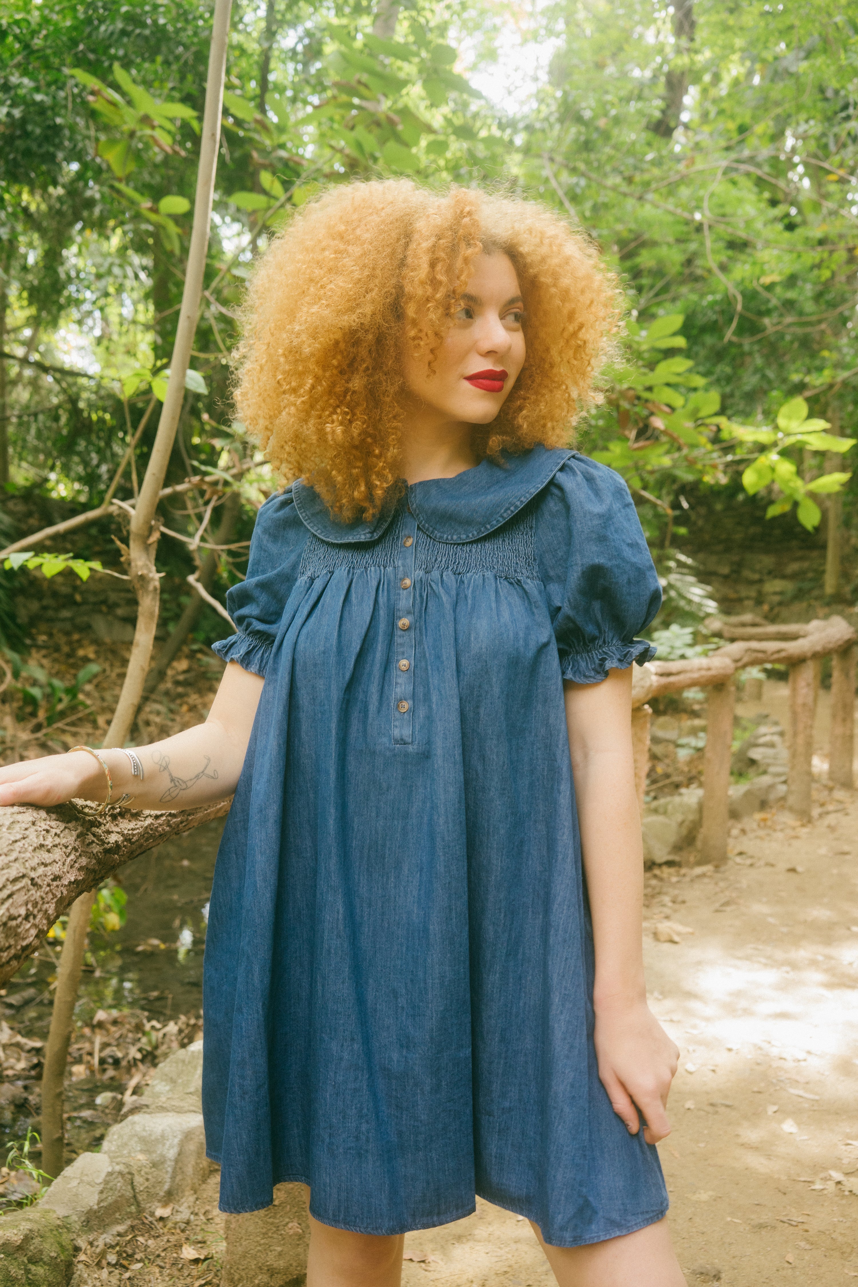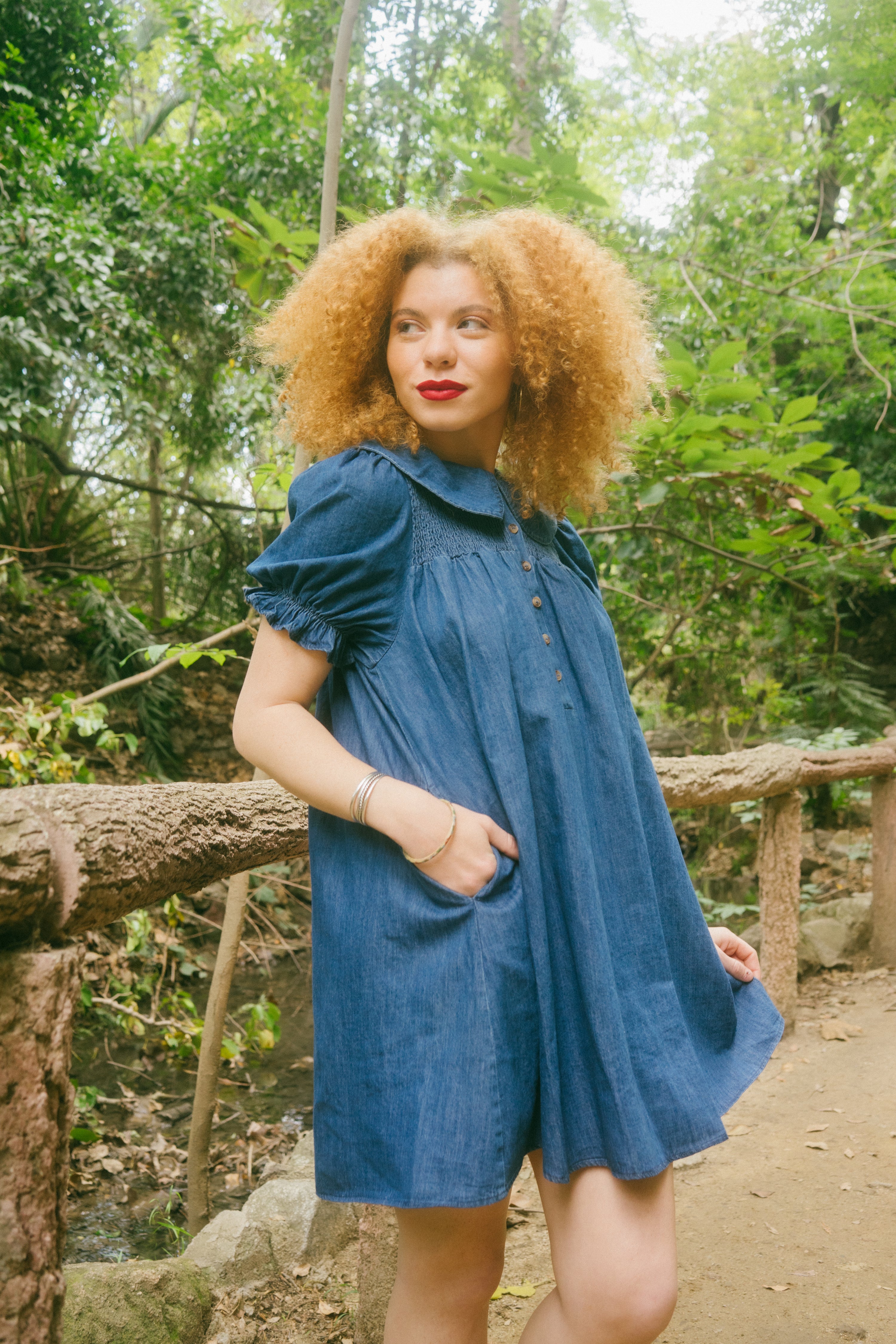 A babydoll beauty, the Wendy Dress comes in a medium-wash denim hue, with exaggerated short puff sleeves and functional tortoise shell buttons along the center of the bodice. The piece has a peter pan collar, and a fully smocked neckline about the bust and upper back. Finished off with a romantic, flowy babydoll mini silhouette, style this dress with a dash of lipstick, spring slides and an oversized tote bag.