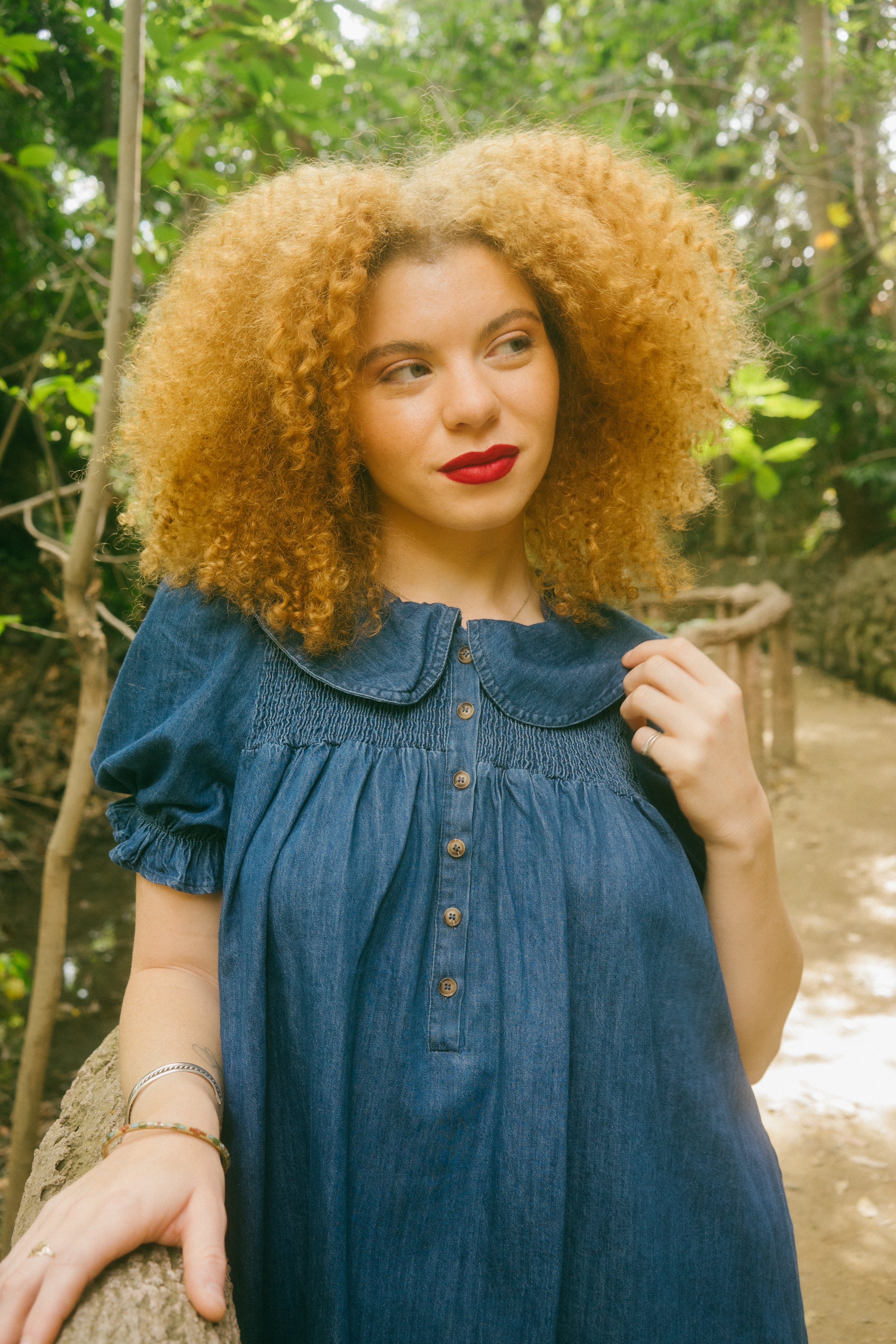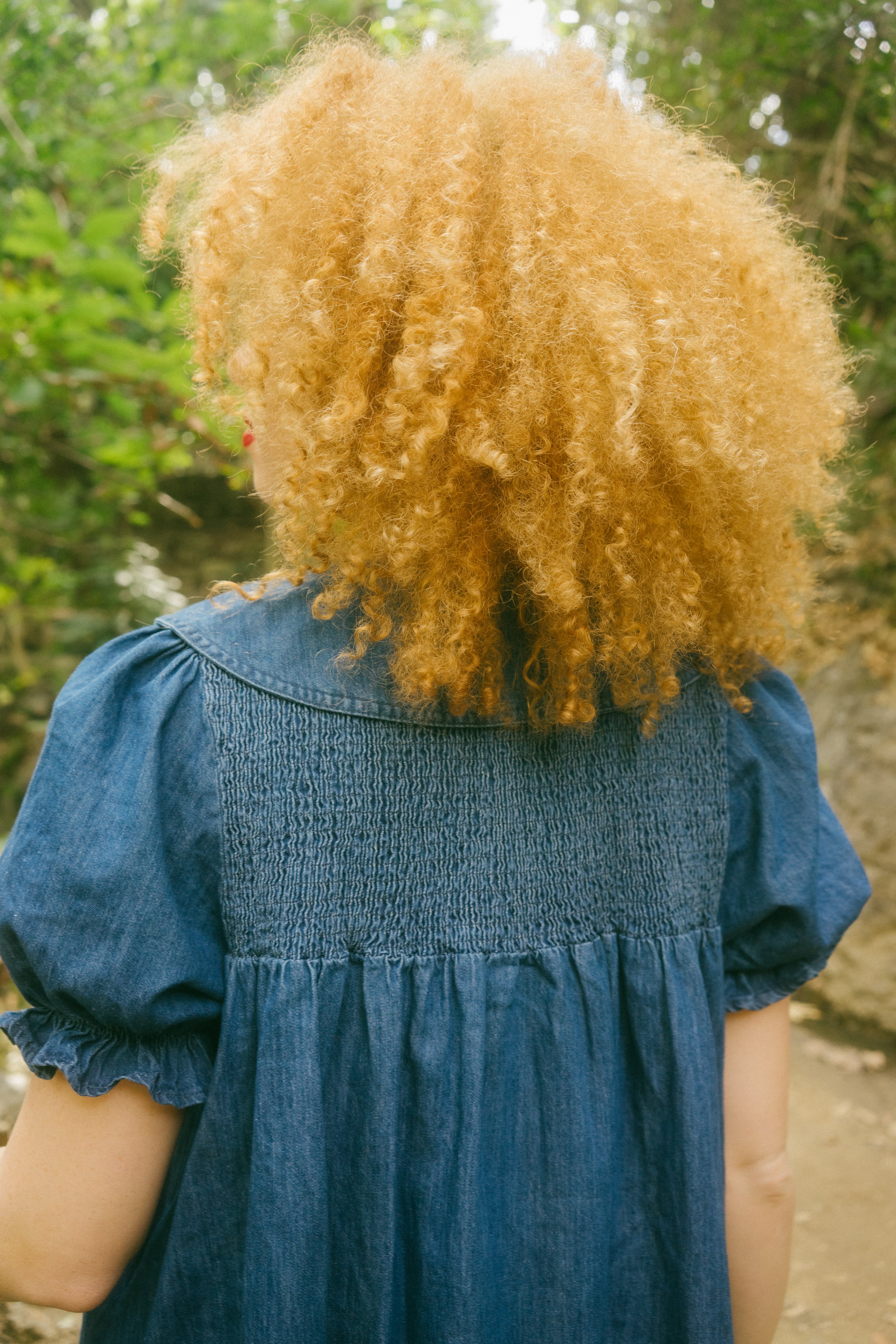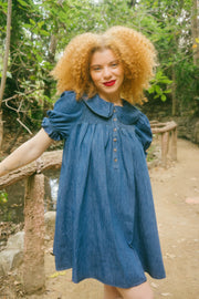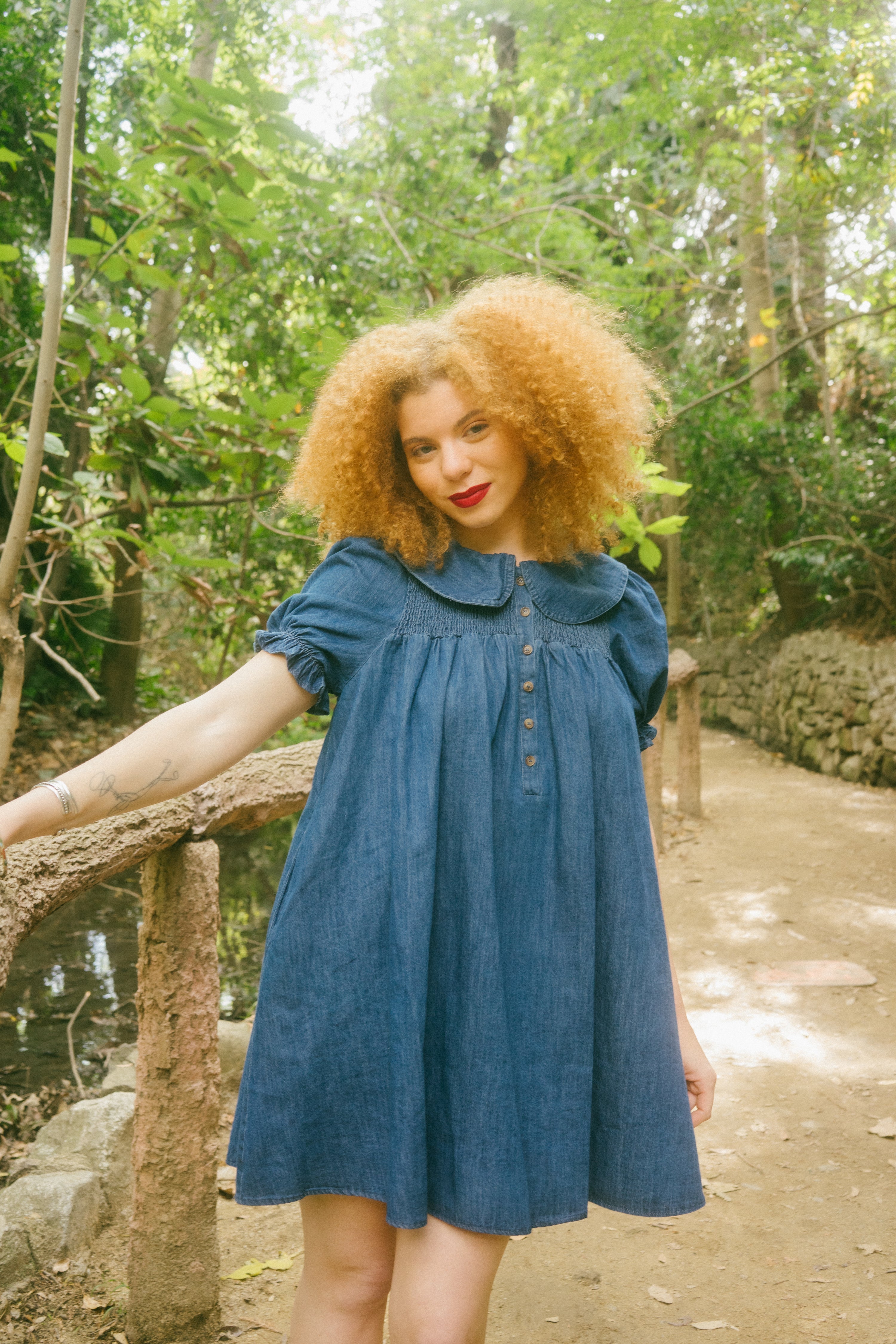 A babydoll beauty, the Wendy Dress comes in a medium-wash denim hue, with exaggerated short puff sleeves and functional tortoise shell buttons along the center of the bodice. The piece has a peter pan collar, and a fully smocked neckline about the bust and upper back. Finished off with a romantic, flowy babydoll mini silhouette, style this dress with a dash of lipstick, spring slides and an oversized tote bag.